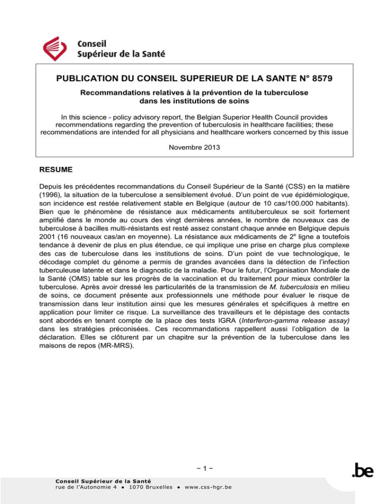 PUBLICATION DU CONSEIL SUPERIEUR DE LA SANTE N° 8579 Recommandations relatives à la prévention de la tuberculose dans les institutions de soins In this science - policy advisory report, the Belgian Superior Health Council provides recommendations regarding the prevention of tuberculosis in healthcare facilities; these recommendations are intended for all physicians and healthcare workers concerned by this issue Novembre 2013 RESUME Depuis les précédentes recommandations du Conseil Supérieur de la Santé (CSS) en la matière (1996), la situation de la tuberculose a sensiblement évolué. D’un point de vue épidémiologique, son incidence est restée relativement stable en Belgique (autour de 10 cas/100.000 habitants). Bien que le phénomène de résistance aux médicaments antituberculeux se soit fortement amplifié dans le monde au cours des vingt dernières années, le nombre de nouveaux cas de tuberculose à bacilles multi-résistants est resté assez constant chaque année en Belgique depuis 2001 (16 nouveaux cas/an en moyenne). La résistance aux médicaments de 2e ligne a toutefois tendance à devenir de plus en plus étendue, ce qui implique une prise en charge plus complexe des cas de tuberculose dans les institutions de soins. D’un point de vue technologique, le décodage complet du génome a permis de grandes avancées dans la détection de l’infection tuberculeuse latente et dans le diagnostic de la maladie. Pour le futur, l’Organisation Mondiale de la Santé (OMS) table sur les progrès de la vaccination et du traitement pour mieux contrôler la tuberculose. Après avoir dressé les particularités de la transmission de M. tuberculosis en milieu de soins, ce document présente aux professionnels une méthode pour évaluer le risque de transmission dans leur institution ainsi que les mesures générales et spécifiques à mettre en application pour limiter ce risque. La surveillance des travailleurs et le dépistage des contacts sont abordés en tenant compte de la place des tests IGRA (Interferon-gamma release assay) dans les stratégies préconisées. Ces recommandations rappellent aussi l’obligation de la déclaration. Elles se clôturent par un chapitre sur la prévention de la tuberculose dans les maisons de repos (MR-MRS). −1− Conseil Supérieur de la Santé rue de l’Autonomie 4 ● 1070 Bruxelles ● www.css -hgr.be MeSH terms et Mots clés MeSH terms* Tuberculosis/ prevention Health services Disease Transmission, Infectious Public health surveillance Disease Notification Interferongamma Release Tests Keywords Tuberculosis Sleutelwoorden Tuberculose Mots clés Tuberculose Stichwörter Tuberkulose Prevention Preventie Healthcare Verzorgingsinstellingen facilities Transmission Transmissie Prévention Prävention Institutions Krankenpflegeeinrichtungen de soins Transmission Übertragung Surveillance Bewaking Surveillance Überwachung Detection Declaration Opsporen Meldingsplicht Dépistage Déclaration Krankheitsfrüherkennung Meldepflicht IGRA IGRA IGRA IGRA * MeSH (Medical Subject Headings) is the NLM (National Library of Medicine) controlled vocabulary thesaurus used for indexing articles for PubMed (http://www.ncbi.nlm.nih.gov/mesh ). −2− Conseil Supérieur de la Santé rue de l’Autonomie 4 ● 1070 Bruxelles ● www.css -hgr.be TABLE DES MATIERES 1. INTRODUCTION ................................................................................................................... 7 2. ELABORATION ET ARGUMENTATION............................................................................... 8 2.1 2.2 3. Méthodologie .................................................................................................................. 8 Elaboration ..................................................................................................................... 8 TRANSMISSION DE M. TUBERCULOSIS ET PATHOGENIE DE L’INFECTION TUBERCULEUSE ................................................................................................................. 9 3.1 Généralités ..................................................................................................................... 9 3.1.1 3.1.2 3.1.3 3.1.4 3.1.5 3.2 Particularités de la transmission de M. tuberculosis en milieu de soins......................... 12 3.2.1 3.2.2 3.2.3 3.2.4 3.3 4. Mode de transmission.............................................................................................. 9 Pathogénie : bref rappel .......................................................................................... 9 Risque d’exposition à M. tuberculosis et contagiosité ............................................ 10 Risque de contamination après exposition ............................................................. 10 Risque de développer une tuberculose active après infection latente .................... 11 Le milieu de soins constitue un environnement propice à la transmission de M. tuberculosis ........................................................................................................... 12 Le risque de transmission de M. tuberculosis est clairement majoré en milieu de soins ...................................................................................................................... 12 Le risque de transmission de M. tuberculosis en milieu de soins est influencé par un certain nombre de facteurs ............................................................................... 12 Le laboratoire: un milieu particulièrement à risque de transmission de M. tuberculosis ........................................................................................................... 13 Evaluation du risque de transmission de M. tuberculosis dans les institutions de soins 14 PREVENTION DE LA TRANSMISSION NOSOCOMIALE DE M. TUBERCULOSIS........... 16 4.1 Introduction ...............................................................................................