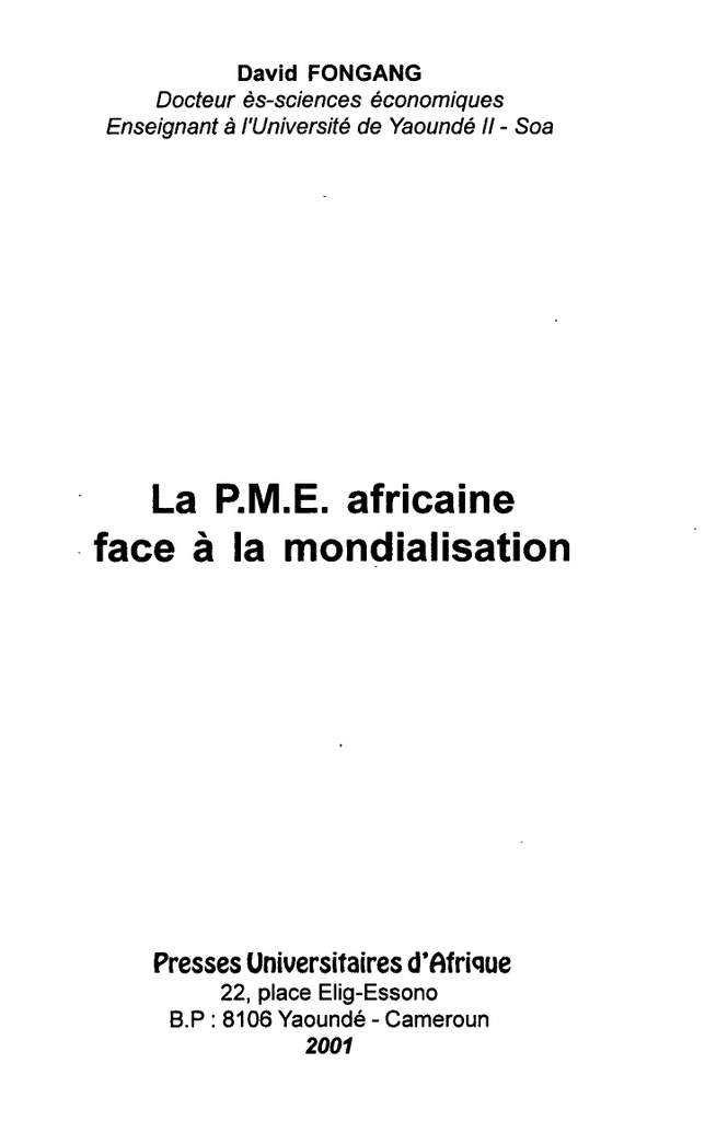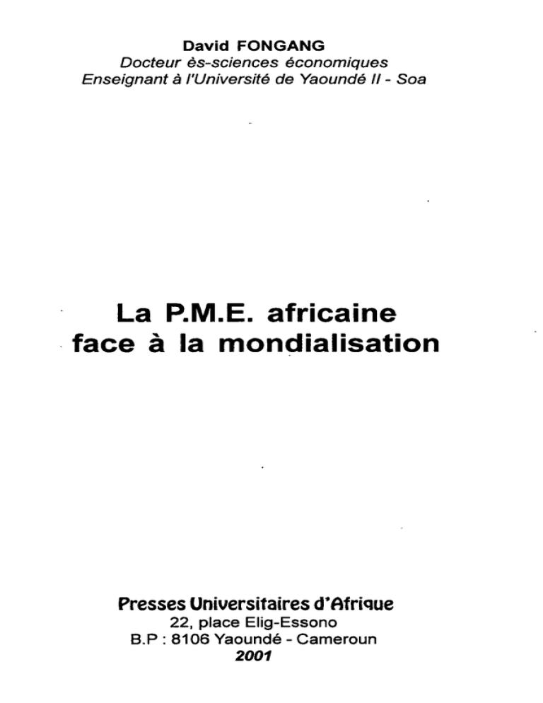 David FONGANG Docteur ès-sciences économiques Enseignant à l'Université de Yaoundé II - Soa La P.M.E. africaine face à la mondialisation Presses Universitaires d'Afrique 22, place Elig-Essono B.P : 8106 Yaoundé - Cameroun 2001 Table des Matières Avant - Propos Remerciements r. Introduction générale 1 3 5 Chapitre préliminaire L'importance des PMEdans le développement des Etats 1.1- Création de la valeur ajouté (VA) et de l'emploi 1.2-Stabilité de l'économie 1.3- Modernisation du secteur informel 1.3.1- Concept de secteur informel 1.3.2 - De l'entreprise informelle à la PME moderne 1.4- La PME génère des entrepreneurs 1.5 - PME et développement technologique 1.6 - PME et réduction de la pauvreté 1.6.1 - Traitement historique de la pauvreté 1.6.2 - Surpeuplement et pauvreté 1.6.4-Rôle de la PME 1.7 - Préservation de la culture locale 1.8 - La PME dans l'industrialisation des pays en développement 1.8.1 - PME et sous-traitance 1.8.2 - Un modèle d'industrialisation 9 9 11 12 12 13 14 15 17 17 18 : 23 23 25 25 26 Chapitre II La mondialisation et ses conséquences 2.1-La mondialisation et les multinationales 2.1.1.-Le concept de mondialisation 2.1.2- Les multinationales ou firmes transnationales (FTN) 2.1.2.1-Définition 28 28 28 31 31 136 LA P.M.E. AFRICAINE FACE À LA MONDIALISATION 2.1.2.2-Les stratégies des F.T.N 32 1-La stratégie de délocalisation 32 a) La filiale-relais 32 b)La filiale-atelier 33 2.-La stratégie commerciale 34 a)La FTN intensifie le commerce international 34 b) Orientation du commerce international 34 c) La FTN et le commerce captif 35 3.-La stratégie financière 35 4.-Le partenariat et l'entreprise-réseau 36 2.2.- Conséquences de la mondialisation dans les pays en développement (PED) 37 2.2.1- Les avantages 37 2.2.1.1- Apport des capitaux 37 2.2.1.2.- Création de l'emploi 38 2.2.1.3.- Production des biens et services 38 2.2.1.4.- Les exportations 38 2.2.1.5.- Le transfert de technologie 39 2.2.2.- Les inconvénients 39 2.2.2.1.- Diminution de l'autorité des gouvernements 39 2.2.2.2.- La diffusion limitée de la croissance 40 a)Effets directs limités 40 b)Effets induits limités dans des Etats informels 40 2.2.2.3.- La dépendance des économies 41 2.2.3.- Le point de vue du colloque de Yaoundé (2000) 43 Chapitre III La PME africaine s'est-elle préparée ? 3.1 - Difficultés à obtenir capital et crédit 3.2- Responsabilités des entrepreneurs africains 3.2.1- Insuffisance de gestion et de compétitivité 3.2.1.1- Le cas des PME Béninoises 3.2.1.2- Cas des PME Camerounaises 3.2.1.3- Conclusion de l'étude menée par Alibert 3.2.1.4- Blocages relevés par les auteurs 3.2.2- Insuffisance de formation 3.2.2.1- Cas des entrepreneurs ivoiriens 45 45 49 49 50 51 :... 53 54 56 56 137 3.2.2.2- Les préoccupations d'Ernest Akindes 3.2.2.3 - Inadaptation des programmes d'enseignement 57 59 Chapitre IV La compétitivité des PME : Le rôle de l'Etat 4.1.- Des Etats ébranlés par le P.A.S 4.1.1.- L'histoire économique récente 4.1.2.- Les causes 4.1.2.1.-Rejet de sa culture 4.1.2.2- Absence de la volonté du développement 4.2- Création d'un Véritable marché intérieur 4.2.1- La faiblesse du pouvoir d'achat 4.2.1.1- Dans les campagnes 4.2.1.2- Dans les villes 4.2.2- Nécessité de créer un vaste marché intérieur 4.2.3- Les modalités du développement de l'agriculture 4.2.3.1- La révolution agraire 4.2.3.2- Un modèle de développement rural 4.3-La régionalisation i 4.3.1- Nécessité des regroupements régionaux 4.3.2.- Modalités des regroupements régionaux 4.3.2.1- Les Blocages 1- Les égoïsmes nationaux 2- L'insécurité 3- Les inégalités de développement 4- L'absence des groupes de pression sur le pouvoir 4.3.2.2- Deux voies de succès 4.4- Conditions d'accès à l'internationalisation 4.4.1-La modernisation de l'Etat et de l'économie 4.4.1.1- Fonctionnement de l'Etat 4.4.1.2- La modernisation de l'économie 4.4.2- Le problème du protectionnisme 61 61 62 63 63 66 68 69 69 69 70 71 72 72 74 74 75 76 76 76 76 77 77 78 78 78 79 81 Chapitre V La PME africaine en situation de concurrence généralisée 5.1- Nature de la concurrence 5.1.1- La concurrence des producteurs locaux 85 85 85 138 LA P.M.E. AFRICAINE FACE À LA MONDIALISATION 5.1.2- La concurrence des importateurs 86 5.1.3- La concurrence directe des transnationales 87 5.1.3.1- Les formes de leur présence en Afrique 87 5.1.3.2- Leur capacité de concurrence 87 5.2- La force, les faiblesses et les défis de la PME africaine 88 5.2.1.- La force : souplesse de la PME 88 5.2.2.- Les faiblesses de la PME 90 5.2.2.1- Insuffisance de la direction 90 5.2.2.2 - Des occupations accablantes pour les dirigeants .. 92 5.2.3 - Les défis de la PME 94 5.2.3.1-La planification 94 5.2.3.2- La stratégie 97 5.3.- Les politiques de produit 98 5.3.1- La technologie 99 " 5.3.1.1 - Le transfert de technologie 99 5.3.1.2-Recherche d'opportunités 101 5.3.2- La spécialisation 103 5.3.3- La diversification 104 5.4 - La politique des prix 105 5.4.1- La demande 105 5.4.2 - Détermination des prix 106 5.4.2.1 - Fixation du prix dans la PME 106 5.4.2.2- Stratégie par les prix 110 1- Importance du coût des inputs 110 2 - La concurrence. 110 3- Homologation des prix 111 5.5- Politique de coopération 112 5.5.1- La joint-venture 113 5.5.2 - La sous-traitance 113 5.5.3 -Coopération inter-PME 114 5.5.3.1 - Les rapports verticaux ou de complémentarité ... 114 5.5.3.2 - Les rapports horizontaux 115 Conclusion générale Bibliographie Liste des encadrés et graphiques Table des matières 119 121 133 135