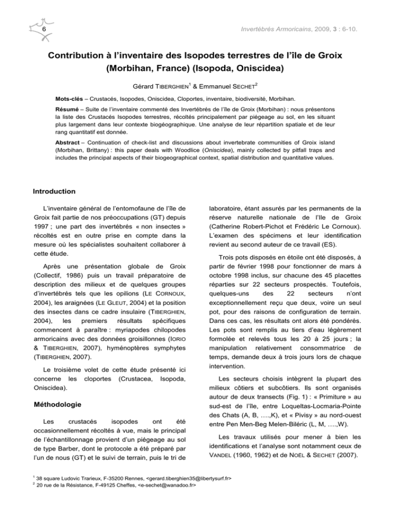 Invertébrés Armoricains, 2009, 3 : 6-10. 6 Contribution à l’inventaire des Isopodes terrestres de l’île de Groix (Morbihan, France) (Isopoda, Oniscidea) 1 Gérard TIBERGHIEN & Emmanuel SECHET 2 Mots-clés – Crustacés, Isopodes, Oniscidea, Cloportes, inventaire, biodiversité, Morbihan. Résumé – Suite de l’inventaire commenté des Invertébrés de l’île de Groix (Morbihan) : nous présentons la liste des Crustacés Isopodes terrestres, récoltés principalement par piégeage au sol, en les situant plus largement dans leur contexte biogéographique. Une analyse de leur répartition spatiale et de leur rang quantitatif est donnée. Abstract – Continuation of check-list and discussions about invertebrate communities of Groix island (Morbihan, Brittany) : this paper deals with Woodlice (Oniscidea), mainly collected by pitfall traps and includes the principal aspects of their biogeographical context, spatial distribution and quantitative values. Introduction L’inventaire général de l’entomofaune de l’île de Groix fait partie de nos préoccupations (GT) depuis laboratoire, étant assurés par les permanents de la réserve naturelle nationale de l’Ile de Groix 1997 ; une part des invertébrés « non insectes » (Catherine Robert-Pichot et Frédéric Le Cornoux). récoltés est en outre prise en compte dans la mesure où les spécialistes souhaitent collaborer à L’examen des spécimens et leur identification revient au second auteur de ce travail (ES). cette étude. globale de Groix Trois pots disposés en étoile ont été disposés, à partir de février 1998 pour fonctionner de mars à (Collectif, 1986) puis un travail préparatoire de description des milieux et de quelques groupes octobre 1998 inclus, sur chacune des 45 placettes réparties sur 22 secteurs prospectés. Toutefois, d’invertébrés tels que les opilions (LE CORNOUX, quelques-uns 2004), les araignées (LE GLEUT, 2004) et la position des insectes dans ce cadre insulaire (TIBERGHIEN, exceptionnellement reçu que deux, voire un seul pot, pour des raisons de configuration de terrain. 2004), les premiers résultats spécifiques commencent à paraître : myriapodes chilopodes Dans ces cas, les résultats ont alors été pondérés. Les pots sont remplis au tiers d’eau légèrement armoricains avec des données groisillonnes (IORIO & TIBERGHIEN, 2007), hyménoptères symphytes formolée et relevés tous les 20 à 25 jours ; la manipulation relativement consommatrice de (TIBERGHIEN, 2007). temps, demande deux à trois jours lors de chaque Après une présentation Le troisième volet de cette étude présenté ici concerne les cloportes (Crustacea, Isopoda, des 22 secteurs n’ont intervention. Les secteurs choisis intègrent la plupart des Oniscidea). milieux côtiers et subcôtiers. Ils sont organisés autour de deux transects (Fig. 1) : « Primiture » au Méthodologie sud-est de l’île, entre Loqueltas-Locmaria-Pointe des Chats (A, B, ….,K), et « Pivisy » au nord-ouest Les crustacés isopodes ont été occasionnellement récoltés à vue, mais le principal de l’échantillonnage provient d’un piégeage au sol entre Pen Men-Beg Melen-Biléric (L, M, ….,W). de type Barber, dont le protocole a été préparé par Les travaux utilisés pour mener à bien les identifications et l’analyse sont notamment ceux de l’un de nous (GT) et le suivi de terrain, puis le tri de VANDEL (1960, 1962) et de NOËL & SECHET (2007). 1 2 38 square Ludovic Trarieux, F-35200 Rennes, <[email protected]> 20 rue de la Résistance, F-49125 Cheffes, <[email protected]> Contribution à l’inventaire des Isopodes terrestres de l’île de Groix (Morbihan, France) 7 Figure 1. L’île de Groix (Morbihan). Carte de situation des secteurs de piégeage dans la Réserve Naturelle au sud-est (Primiture : A à K) et au nord-ouest (Pivisy : L à W). ISOPODA ONISCIDEA Inventaire faunistique Pour des raisons incompressibles de temps de travail, il a été décidé d’effectuer un souséchantillonnage aléatoire sur l’ensemble du matériel d’isopodes récoltés (5500 individus triés), ramenant ainsi à 1200 le nombre d’exemplaires à identifier puis à analyser. La liste de neuf espèces qui suit est le premier inventaire de cloportes réalisé sur l’île. En effet, les isopodes terrestres ont déjà fait l’objet d’inventaires en Bretagne (LEGRAND, 1949) et dans certaines îles du littoral atlantique (LEGRAND, 1954a, 1954b ; PAULIAN DE FELICE, 1939), mais Groix ne fait pas partie des sites prospectés lors de ces précédents travaux. Pour comparaison avec le reste de la dition armoricaine, on consultera la synthèse de LEGRAND (1954b) relative au peuplement des îles du littoral atlantique, ou bien les seules publications récentes relatives à la Vendée (SECHET, 2005) et au Nordouest de la France (NOËL & SECHET, 2007). Le matériel examiné est déposé dans la Famille des Ligiidae Ligia oceanica (L., 1767) C’est une espèce halophile du littoral atlantique et de la Manche. Famille des Trichoniscidae Trichoniscus pusillus Brandt, 1833 / Trichoniscus provisorius Racovitza, 1908 Ces deux taxons étaient encore récemment considérés comme deux sous-espèces de Trichoniscus pusillus Brandt, 1833 (SCHMALFUSS, 2003). Dans notre étude, il n’a pas été possible de distinguer l’une ou l’autre des deux formes. Toutes deux sont répandues en Europe et communes en France. Famille des Oniscidae Oniscus asellus L., 1758 Cette espèce très commune dans de nombreux habitats possède une vaste aire de répartition qui s’étend sur une grande partie de l’Europe. collection de référence de l’un de nous (ES). Invertébrés Armoricains, 2009, 3 8 G. TIBERGHIEN & E. SECHET Famille des Philosciidae synanthropes et aptes à s’adapter aux situations Chaetophiloscia elongata (Dollfus, 1884) C’est une espèce des milieux tempérés, répandue dans la moitié sud de la France et qui, plus au nord, se rencont