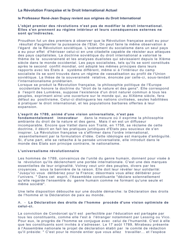 La Révolution Française et le Droit International Actuel le Professeur René-Jean Dupuy revient aux origines du Droit International L'objet premier des révolutions n'est pas de modifier le droit international. Elles s'en prennent au régime intérieur et leurs conséquences externes ne sont qu'indirectes. Proudhon fut un des premiers à observer que la Révolution française avait eu pour résultat d'augmenter la puissance de l'Etat. On peut faire la même observation à l'égard de la Révolution soviétique. L'avènement du socialisme dans un seul pays a eu pour effet d'hérisser celui-ci en une citadelle capable de résister aux attaques des pays capitalistes. La doctrine soviétique du droit international a valorisé le thème de la souveraineté et les analyses dualistes qui sévissaient depuis le XIème siècle dans le monde occidental. Les pays socialistes, tels qu'ils se sont constitués après le second conflit mondial, ont adopté les mêmes principes dans leurs rapports avec les Etats à système différent, même si à l'intérieur du camp socialiste ils se sont trouvés dans un régime de vassalisation au profit de l'Union soviétique. La thèse de la souveraineté relative, énoncée par celle-ci, sous-tendait l'internationalisme prolétarien. Lorsque se produit la Révolution française, la philosophie politique de l'Europe occidentale honore la doctrine du "droit de la nature et des gens". Elle correspond à l'esprit des Lumières, suppose l'existence d'un droit naturel commun à tous les peuples, exprimant ainsi une ouverture sur le monde qui, au XIXème siècle, fera défaut au positivisme. Celui-ci distinguera les nations civilisées, seules habilitées à pratiquer le droit international, et les populations barbares offertes à leur expansion. L'esprit de 1789, animé d'une vision universaliste, n'est pas fondamentalement innovateur dans la mesure où il exprime la philosophie ambiante du droit de la nature et des gens. Mais il en est un diffuseur incomparable. Encore que Vattel dans son Traité, en 1758, se réclame de cette doctrine, il décrit en fait les pratiques juridiques d'Etats peu soucieux de s'en inspirer. La Révolution française va s'affirmer dans l'ordre international, essentiellement par la formulation d'idée. Cette idéologie est marquée d'ambiguïté. Si, d'une part, elle se rattache à la pensée universaliste, elle introduit dans le monde des Etats son principe contraire, le nationalisme. L'universalisme révolutionnaire Les hommes de 1789, convaincus de l'unité du genre humain, donnent pour visée à la révolution qu'ils déclenchent une portée internationale. C'est une des marques essentielles de leur originalité. Volney veut unir des peuples, divers par les croyances, sous la bannière de la raison. Elle doit leur révéler leur solidarité: "Jusqu'ici vous délibériez pour la France; désormais vous allez délibérer pour l'univers. " Dans cet esprit, l'Assemblée constituante "déclare solennellement qu'elle regarde l'ensemble du genre humain comme ne formant qu'une seule et même société". Une telle disposition débouche sur une double démarche: la Déclaration des droits de l'homme et la Déclaration de paix au monde. A. - La Déclaration des droits de l'homme procède d'une vision optimiste de celui-ci. La conviction de Condorcet qu'il est perfectible par l'éducation est partagée par tous les constituants, comme elle l'est à l'étranger notamment par Lessing ou Vico. Pour eux, le progrès de l'homme se conjugue avec celui de l'humanité. C'est à elle que les constituants sont invités à s'adresser. Le 17 août 1789, Mirabeau présente à l'Assemblée nationale le projet de déclaration établi par le comité de rédaction qu'il préside: " C'est pour le monde entier que vous allez travailler... et l'espèce humaine vous comptera au nombre de ses bienfaiteurs". Pour Pétion: "il ne s'agit pas de faire une déclaration seulement pour la France, mais pour l'Homme en général", attitude qui suppose l'existence de "vérités immuables" qu'il faut retrouver et exprimer. La Déclaration tient de la révélation. Portant témoignage de ces vérités, elle a valeur prophétique. La formule "tout homme", qui revient à plusieurs reprises dans la Déclaration de 1789, traduit sa portée générale. Les adversaires de la Révolution ont critiqué cette conception abstraite de l'homme, coupé de ses racines propres, de son milieu social géographique. Edmund Burke dans ses " Réflexions sur la Révolution française", en 1790, Joseph de Maistre dans ses <" Considérations sur la France" en 1797, ne veulent voir que des hommes situés. Le second se moque en observant qu'il sait, grâce à Montesquieu, qu'il existe des Persans, mais que l'Homme en soi, il ne l'a jamais rencontré. Ces critiques sont aujourd'hui reprises par ceux qui se réclament du "droit à la différence ". Cependant, les fidèles de 1789 justifient ce concept abstrait de l'homme par son exclusion de toute discrimination. Cette vision générale de l'homme permet, au-delà des différences de race, de religion ou de philosophie, d'honorer chez tous l'égale dignité de la personne. Telle était bien la conviction des révolutionnaires français. Dès 1789, à l'occasion de la réunion des états généraux, pour Brissot, les planteurs des colonies ne doivent pas y être admis si les Noirs ne le sont pas. Il s'écrie: "Les Noirs sont nés libres et égaux, ils sont les frères des Blancs, ils ont les mêmes droits. Nul pouvoir ne peut les en dépouiller". Le 4 février 1794, Danton fera voter, par la Convention, l'abolition de l'esclavage: "Nous proclamons à la face de l'univers et des générations futures la liberté universelle". B. L'idéologie pacifiste tient une place importante dans les débuts de la Révolution. Elle aussi se rattache à l'idée de progrès par l'éducation. En même temps qu'elle libérera du despotisme, elle développera l'entente entre les