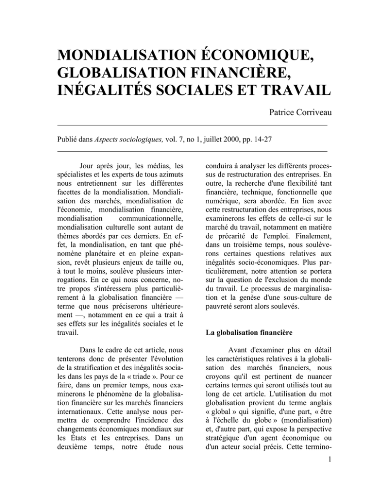 MONDIALISATION ÉCONOMIQUE, GLOBALISATION FINANCIÈRE, INÉGALITÉS SOCIALES ET TRAVAIL Patrice Corriveau Publié dans Aspects sociologiques, vol. 7, no 1, juillet 2000, pp. 14-27 Jour après jour, les médias, les spécialistes et les experts de tous azimuts nous entretiennent sur les différentes facettes de la mondialisation. Mondialisation des marchés, mondialisation de l'économie, mondialisation financière, mondialisation communicationnelle, mondialisation culturelle sont autant de thèmes abordés par ces derniers. En effet, la mondialisation, en tant que phénomène planétaire et en pleine expansion, revêt plusieurs enjeux de taille ou, à tout le moins, soulève plusieurs interrogations. En ce qui nous concerne, notre propos s'intéressera plus particulièrement à la globalisation financière — terme que nous préciserons ultérieurement —, notamment en ce qui a trait à ses effets sur les inégalités sociales et le travail. conduira à analyser les différents processus de restructuration des entreprises. En outre, la recherche d'une flexibilité tant financière, technique, fonctionnelle que numérique, sera abordée. En lien avec cette restructuration des entreprises, nous examinerons les effets de celle-ci sur le marché du travail, notamment en matière de précarité de l'emploi. Finalement, dans un troisième temps, nous soulèverons certaines questions relatives aux inégalités socio-économiques. Plus particulièrement, notre attention se portera sur la question de l'exclusion du monde du travail. Le processus de marginalisation et la genèse d'une sous-culture de pauvreté seront alors soulevés. Dans le cadre de cet article, nous tenterons donc de présenter l'évolution de la stratification et des inégalités sociales dans les pays de la « triade ». Pour ce faire, dans un premier temps, nous examinerons le phénomène de la globalisation financière sur les marchés financiers internationaux. Cette analyse nous permettra de comprendre l'incidence des changements économiques mondiaux sur les États et les entreprises. Dans un deuxième temps, notre étude nous Avant d'examiner plus en détail les caractéristiques relatives à la globalisation des marchés financiers, nous croyons qu'il est pertinent de nuancer certains termes qui seront utilisés tout au long de cet article. L'utilisation du mot globalisation provient du terme anglais « global » qui signifie, d'une part, « être à l'échelle du globe » (mondialisation) et, d'autre part, qui expose la perspective stratégique d'un agent économique ou d'un acteur social précis. Cette termino- La globalisation financière 1 logie n'a de sens au niveau économique que si elle traduit la stratégie « du grand groupe oligopoleuse engagé dans la production manufacturière ou dans les principales activités de services d'adopter une approche et une conduite “globales” » (Chesnais, 1997 : 28). Dès lors, il est important, à notre avis, de faire une distinction entre globalisation et mondialisation. En effet, à l'instar de Bousquet (1998), nous croyons que la réalité économique actuelle nous permet de parler davantage de globalisation sans pour autant signifier que le phénomène soit à l'échelle mondiale, la globalisation des marchés se faisant surtout à l'intérieur de la Triade et de pays membres de l'OCDE (Organisation du Commerce et Développement Économique). En outre, nous considérons que même si les marchés sont désormais ouverts à l'échelle planétaire, la grande majorité des échanges commerciaux s'effectuent à l'intérieur des pays de la Triade. Par le fait même, ne serait-il pas plus pertinent de parler de « triadisation » plutôt que de mondialisation? Pour Chesnais (1997 : 25), « la concentration de tous les flux (échanges, Investissements directs à l'étranger (IDE), technologie) dans la “Triade” l'emporte sur toutes les autres tendances de la mondialisation ». Même si les marchés sont désormais ouverts à l’échelle planétaire, la grande majorité des échanges commerciaux s’effectuent à l’intérieur des pays de la triade, Par le fait même, ne serait-il pas plus pertinent de parler de « triadisation » plutôt que mondialisation? En effet, il semble évident que les pays membres de la Triade bénéfi- cient davantage des échanges commerciaux et financiers internationaux que leurs homologues du reste du monde. En outre, Chesnais (1997 : 266-267) présente des statistiques qui démontrent qu'en 1995, 75.7 % du commerce mondial provenait de la Triade. L'Amérique latine et le Mexique occupaient 4.6 % du marché tandis que les États africains ne comptaient que pour 2.1 % de tous les échanges commerciaux du globe. À cet égard, l'image d'un centre économique mondial (la Triade) entouré de plusieurs périphéries est, à notre avis, plus révélatrice de la réalité des échanges commerciaux mondiaux. En ce qui concerne la globalisation des marchés financiers proprement dit, examinons maintenant les facteurs qui ont conduit à son apogée dans la « mondialisation » du capital. Selon certains auteurs (Chesnais, 1997; O'Brien, 1992), la sphère financière de la globalisation du capital se trouve là où l'internationalisation est la plus avancée. Comme le fait remarquer Chesnais (1997 : 49), le rôle des marchés financiers est de plus en plus important : il va de la détermination des taux d'intérêt à long terme à celui du taux de change des monnaies. Bref, la globalisation financière a favorisé la création de nombreuses interdépendances entre les pays, notamment en ce qui a trait à la distribution des richesses et des revenus. « Le terme mondialisation financière désigne les interconnexions très étroites entre les systèmes monétaires et les marchés financiers nationaux, qui ont résulté des mesures de libéralisation et de déréglementation adopté d’abord par les États-Unis et le Royaume-Uni entre 1979 et 1982, p