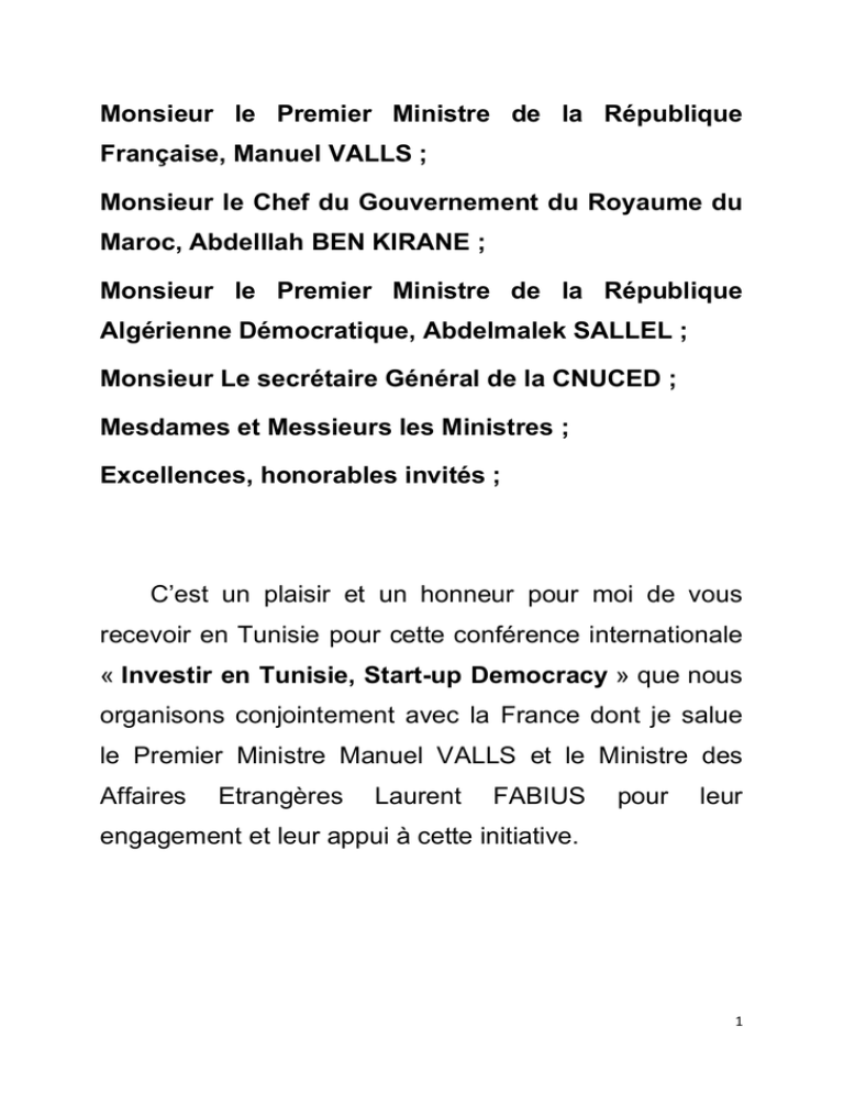 Monsieur le Premier Ministre de la République Française, Manuel VALLS ; Monsieur le Chef du Gouvernement du Royaume du Maroc, AbdelIlah BEN KIRANE ; Monsieur le Premier Ministre de la République Algérienne Démocratique, Abdelmalek SALLEL ; Monsieur Le secrétaire Général de la CNUCED ; Mesdames et Messieurs les Ministres ; Excellences, honorables invités ; C’est un plaisir et un honneur pour moi de vous recevoir en Tunisie pour cette conférence internationale « Investir en Tunisie, Start-up Democracy » que nous organisons conjointement avec la France dont je salue le Premier Ministre Manuel VALLS et le Ministre des Affaires Etrangères Laurent FABIUS pour leur engagement et leur appui à cette initiative. 1 Je voudrai également saluer mes deux collègues, et non moins amis, le Premier Ministre Algérien Abdelmalek SALLEL et le Chef du Gouvernement Marocain Abdel Ileh BEN KIRANE qui nous honorent par leur présence parmi nous aujourd’hui. Je tiens aussi à remercier le Secrétaire Général de la CNUCED pour sa participation au nom du Secrétaire Général des Nations Unies Mr Ban KI MOON. Excellences, honorables invités ; J’ai eu le plaisir de rencontrer un grand nombre d’entre vous, au cours de mes visites officielles dans vos pays et auprès de vos institutions, au lendemain de ma nomination. Beaucoup d’entre vous nous ont honorés aussi par leurs visites en Tunisie. Je vous avais entretenu alors des engagements de mon Gouvernement pour réussir cette transition démocratique. 2 Nous voila aujourd’hui à l’heure de la concrétisation et j’’ai le plaisir de vous accueillir, ici parmi nous, pour marquer ensemble l’amorce d’une nouvelle étape, celle de la relance économique. En cette ultime phase historique que connait la Tunisie, votre présence parmi nous témoigne de votre confiance, de votre amitié et de votre soutien à la transition que vit notre pays. Ils sont précieux et déterminants, à la faveur de cette conférence internationale axée certes sur l’investissement, mais en fait dédiée à sceller de nouveaux partenariats, exceptionnels, durables et mutuellement bénéfiques. Excellences, honorables invités ; Avec détermination et sérénité, la Tunisie aborde aujourd’hui la dernière ligne droite vers les premières élections législatives et présidentielles, libres et indépendantes de sa longue histoire. 3 Il faut dire qu’il n’a pas été facile d’arriver à ce grand rendez-vous électoral tant attendu. Plus de trois ans et demi après le déclenchement de la révolution, ces élections viennent en consécration d’intenses débats et d’un difficile processus de transition démocratique qui ont doté la Tunisie d’une Constitution avant-gardiste, inscrite dans les valeurs universelles, respectueuses des libertés individuelles et tournée vers la modernité. Une constitution fondatrice d’institutions solides, plébiscitant la démocratie et la transparence des urnes. Aussi réussi qu’il soit, ce parcours ne peut s’accomplir que s’il constitue l’amorce de la stabilisation générale du pays, du redressement économique et de l’accélération des réformes pour ouvrir l’ère de la croissance et de la prospérité. Dès son entrée en fonction, fin janvier dernier, mon Gouvernement, indépendant, issu du Dialogue national, s’est trouvé investi d’une double mission inscrite dans une feuille de route signée par toutes les parties concernées. 4 Cette mission visait à réunir les conditions favorables à la tenue d’élections libres et transparentes, et stabiliser autant que possible le pays, assurer sa sécurité et la relance de son économie. Face à l’ampleur des enjeux, nous nous sommes rendus compte qu’on ne pourrait nous y limiter et que notre responsabilité nous imposait aussi de préparer le relais à passer, en dotant le pays d’une vision d’avenir et d’un programme d’action, le mettre sur une voie passante afin de relancer la machine économique et replacer la Tunisie dans la position qui lui revient parmi ses partenaires. Nous sommes arrivés sur un contrat, la feuille de route, nous repartons sur un projet d’avenir celui que nous vous présentons aujourd’hui. 5 Excellences, honorables invités ; Au cœur de ce projet, qui s’inspire de notre histoire plusieurs fois millénaire, mais qui s’ouvre aussi sur les acquis de la civilisation universelle, se trouve la refondation de l’Etat et de ses institutions que nous avons érigées en priorité absolue de notre programme. Le plus grand risque comme nous le voyons dans d’autres pays, c’est l’effondrement de l’Etat et le blocage de ses institutions. C’est là justement l’objectif premier que visent les terroristes dans leur sinistre dessein. Refonder l’Etat, c’est aussi lui donner une nouvelle vocation, celle d’un Etat-stratège, régulateur, et garant de la justice sociale. 6 Toutefois, cette démarche n’a de valeur que si le Tunisien et la Tunisienne en sont les ultimes bénéficiaires. Réinstaller l’individu dans sa nouvelle citoyenneté, sa dignité, sa fierté, par le travail, l’accès à l’éducation et aux soins, à la culture et aux loisirs ; son accomplissement et son épanouissement, dans le respect de ses droits et ses libertés : ce sont là des impératifs majeurs. Notre objectif est de créer un vrai Etat citoyen dont l’essentiel de la fonction est d’être au service du citoyen. Notre objectif est d’ancrer les fondements de l’irréversible pour prémunir le pays contre tout retour de la dictature, tout naufrage dans les inégalités, toute régression dans les droits et les libertés. 7 Excellences, honorables invités ; Plus que faire aboutir un processus de transition vers la démocratie, nous nous sommes attelés dès l’investiture à introduire un nouveau style de gouvernance fondé sur la compétence, l’engagement et la loyauté envers les institutions dans le cadre 