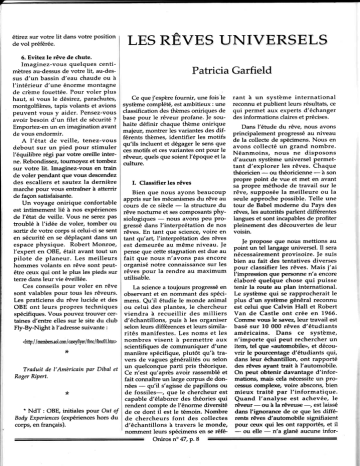 I étirez sur votre de lit dans votre position vol prêfiêrêe. LES RÊVES UNIVERSEL$ 6. Evitez le rêve de chute. Imaginez-vous quelques centimètres au-dessus de votre lit, au-dessus d'un bassin d'eau chaude ou à l'intérieur d'une énorme montagne de crème fouettée. Pour voler Plus haut, si vous le dêsftez, parachutes, montgolfières, tapis volants et avions peuvent vous y aider. Pensez-vous avoir besoin d'un filet de sécurité ? Emportez-en un en irnagination avant de vous endormir. Patricia Garfield Ce que j'espère fournir, une fois le système cornplété, est ambitieux : une classification des thèmes oniriques de base pour le rêveur profane. |e souhaite définir chaque thème onirique majeûr, montrer les variantes des difthèmes, identifier les motifs A l'état de veille, tenez-vous férents qu'ils incluent et dégager le sens que debout sur un pied pour stimuler ces motifs et ces variantes ont pour le l'équilibre régi par votre oreille inter- rêveur, quels que soient l'époque et la ne. Rebondissez, tournoyez et tombez culture. sur votre lit. Imaginez-vous en train de voler pendant que vous descendez des escaliers et sautez la dernière I. Classifier les rêves marche pour vous entraîrrer à atterrir Bien que nous ayons beaucoup de façon satisfaisante. appris sur les mécanismes du rêve au Un voyage onirique confortable cours de ce siècle la structure du est intimement lié à nos expériences rêve noctume et ses- composants phyde l'état de veille. Vous ne serez pas siologiques nous avons peu protroublé à l'idée de voler, tomber ou gressé dans -l'interprétatiôn de nos sortir de votre corps si celui-ci se sent rêves. En tant que science, voite en en sécurité en se déplaçant dans un tant qu'art f interprétation des rêves espace physique. Robert Monroe, est demeurée au même niveau. Je l'expert en OBE, était avant tout un pense que cette stagnation est due au pilote de planeur. Les meilleurs fait que nous n'avons pas encore hommes volants en rêve sont peut- organisé notre connaissance sur les être ceux qui ont le plus les pieds sur rêves pour la rendre au maximum utilisable. terre dans leur vie éveillée. rêve en voler conseils pour Ces La science a toujours progressê en sont valables pour tous les rêveurs. observant et en nommant des spéciLes praticiens du rêve lucide et des mens. Qu'il étudie le monde animal OBE ont leurs propres techniques ou celui des plantes, le chercheur spécifiques. Vous pouvez trouver cer- viendra à recueillir des milliers taines d'entre elles sur le site du club d'échantillons, puis à les organiser selon leurs différences et leurs sirnilaFly-By-Night à l'adresse suivante : rités manifestes. Les noms et les nombres visent à permettre aux 4ttp: / / nenrbers,aol,com/caseyflyu / fbnc/ fbncOl,htr> scientifiques de communiquer d'une * manière spécifique, plutôt qu'à travers de vagues généralités ou selon un quelconque parti pris théorique. Traduit de I'Amëricain par Dibal et Ce n'est qu'après avoir rassemblé et Roger Ripert. fait connaître un large corpus de données qu'il s'agisse de papillons ou fossiles-r de * eu€ le chercheur est capable d'élaborer des théories qui rendent compte de l'énorme diversité * NdT : OBE, initiales pour Out of de ce dont il est le témoin. Nombre Body Experimces (expêiences hors du de chercheurs font des collectes co{ps, en français). d'échantillons à travers le monde, nomrnent leurs spécimens en se Éfê Oniros no 47,p.8 rant à un système international reconnu et publient leurs résultats, ce qui permet aux experts d'échanger des informations claires et précises. Dans l'étude du rêve, nous avons principalement progressé au niveau de la collecte de spécimens. Nous en avons collecté un grand nombre. Néanmoins, nous ne disposons d'aucun système universel permettant d'explorer les rêves. Chaque à son théoricienne théoricien - avant - ou propre point de vue et met en sa propre méthode de travail sur le rêve, supposée la meilleure ou la seule approche possible. Telle une tour de Babel moderne du Pays des rêves, les autorités parlent différentes langues et sont incapables de profiter pleinement des découvertes de leur voisin. fe propose que nous mettions au point un tel langage universel. Il sera nécessairement provisoire. |e suis bien au fait des tentatives diverses pour classifier les rêves. Mais j'ai l'impression que personne n'a encore élaboré quelque chose qui puisse tenir la route au plan international. Le système qui se rapprocherait le plus d'un système général reconnu est celui que Calvin Hall et Robert Van de Castle ont crée en 1,966. Comme vous le snvez.,leur travail est basé sur 10 000 rêves d'étudiants américains. Dans ce système, n'irrporte qui peut rechercher un itenU tel que <autorrobilerr, et découvrir le pourcentage d'étudiants qui, dans leur échantillon, ont rapporté des rêves ayant trait à l'automobile. On peut obtenir davantage d'informations, mais cela nécessite un processus complue, voire abscons, bien mieux traité par l'informatique. Quand l'analyse est achevée, le est laissé à l,a r€veuse Éveur -, les diffé- ou de ce que dans llignorance rents rêves d'automobile signifiaient pour ceux qrri lo ont rapportés, et il nla glané aucune inforelle - li u I mation sur la signification de son propre rêve. Il ne fait aucun doute que le système de Hall et de Van Castle a de la valeur pour les chercheurs, mais il n'en a sûrement pas autant pour le rêveur individuel qui cherche à comprendre un rêve personnel. De même, David Foulkes a développé en 7978 un langage formel de signes extrêmement complexe, qui sert à la retranscription des rêves en symboles et qui permet d'étudier les contenus manifeste et latent des rêves. Là encore, le rêveur moyen ou la rêveuse moyenne - ne trouve quasiment rien pour l'aider à comprendre son aventure onirique de la nuit dernière. Carolyn Winget et Milt