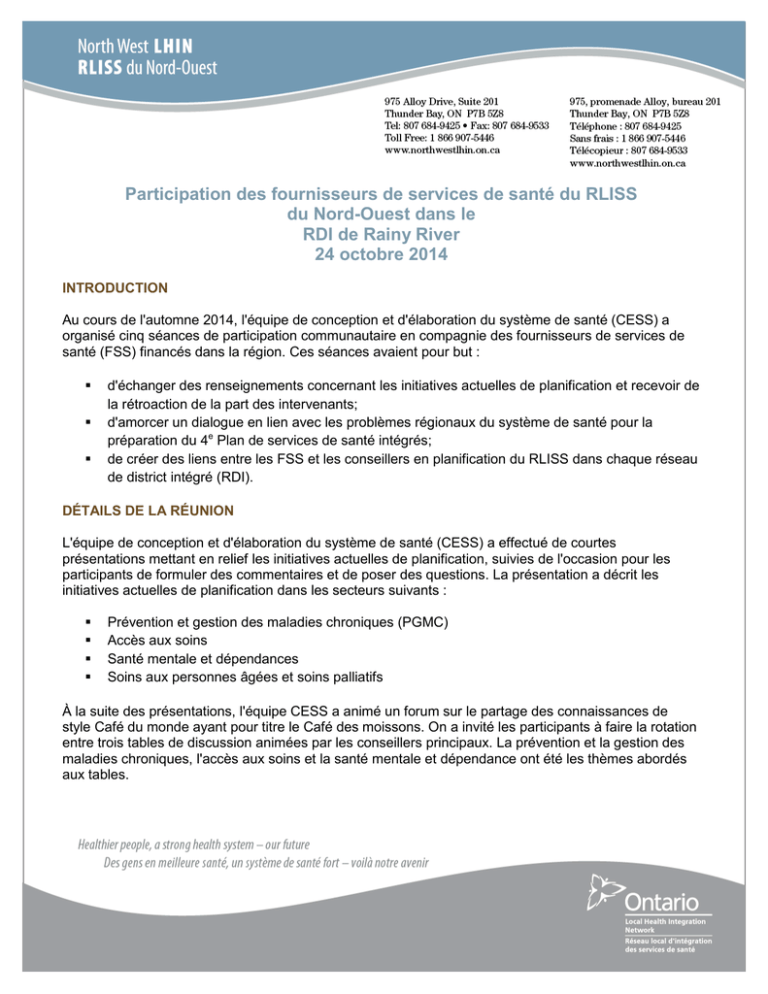 Participation des fournisseurs de services de santé du RLISS du Nord-Ouest dans le RDI de Rainy River 24 octobre 2014 INTRODUCTION Au cours de l'automne 2014, l'équipe de conception et d'élaboration du système de santé (CESS) a organisé cinq séances de participation communautaire en compagnie des fournisseurs de services de santé (FSS) financés dans la région. Ces séances avaient pour but : d'échanger des renseignements concernant les initiatives actuelles de planification et recevoir de la rétroaction de la part des intervenants; d'amorcer un dialogue en lien avec les problèmes régionaux du système de santé pour la préparation du 4e Plan de services de santé intégrés; de créer des liens entre les FSS et les conseillers en planification du RLISS dans chaque réseau de district intégré (RDI). DÉTAILS DE LA RÉUNION L'équipe de conception et d'élaboration du système de santé (CESS) a effectué de courtes présentations mettant en relief les initiatives actuelles de planification, suivies de l'occasion pour les participants de formuler des commentaires et de poser des questions. La présentation a décrit les initiatives actuelles de planification dans les secteurs suivants : Prévention et gestion des maladies chroniques (PGMC) Accès aux soins Santé mentale et dépendances Soins aux personnes âgées et soins palliatifs À la suite des présentations, l'équipe CESS a animé un forum sur le partage des connaissances de style Café du monde ayant pour titre le Café des moissons. On a invité les participants à faire la rotation entre trois tables de discussion animées par les conseillers principaux. La prévention et la gestion des maladies chroniques, l'accès aux soins et la santé mentale et dépendance ont été les thèmes abordés aux tables. L'équipe CESS a invité les différents niveaux de gestion représentant les fournisseurs de services de santé et les fournisseurs de soins de santé locaux du RDI de Rainy River à une séance de participation le 24 octobre 2014. La séance s'est déroulée à l'hôtel La Place Rendez-Vous de Fort Frances, dans la salle LaVerendrye. Afin de préparer le terrain pour la discussion, on a demandé aux participants de réfléchir à la question fondamentale du Café : Comment ferons-nous progresser les soins de santé dans notre région? On a proposé les questions qui suivent à chaque groupe afin d'orienter la discussion : Quelles réussites pouvons-nous reconnaître? Quels sont les défis auxquels nous pourrions être confrontés et de quelle façon pourrions-nous y faire face? Si notre réussite était entièrement assurée, quelles mesures audacieuses pourrions-nous prendre? Comment pouvons-nous nous soutenir mutuellement au moment d'adopter ces nouvelles mesures (RLISS et FSS)? Quelle contribution unique chacun peut-il faire? On a recueilli et examiné des données qualitatives sous la forme de notes sur les discussions de chaque table pour y relever des thèmes communs en procédant à une analyse du contenu. Les thèmes et éléments de discussion qui suivent ont constitué les principales conclusions découlant de la séance de participation du RDI de Rainy River. PRINCIPAUX THÈMES DÉCOULANT DU HARVEST CAFÉ Tableau 1 : Prévention et gestion des maladies chroniques Les discussions à la table PGMC ont mis de l'avant plusieurs thèmes principaux s'étendant au-delà de la maladie en particulier pour traiter d'approches exhaustives en matière de prestation de services : Collaboration La discussion a permis de recenser des collaborations réussies ainsi que de nouvelles possibilités : Le district de Rainy River a maintenu un taux d'amputation de zéro. Cette réussite est attribuée à un programme intégré de soins des plaies à Fort Frances, en partenariat avec l'équipe de santé familiale (ESF) et Fort Frances Tribal Area Health Services. Le personnel infirmier de la communauté travaille à de nombreux emplacements et, par conséquent, connaît les services et ressources qui existent à l'échelle locale. Il faut tirer profit des possibilités de partenariat pour les services en psychogériatrie dans la communauté. Services communautaires Il existe des possibilités d'améliorer les services communautaires dans le RDI de Rainy River afin de mieux répondre aux besoins des clients. Le public n'est pas au courant des services offerts aux personnes âgées dans la communauté. L'accès communautaire aux services de soins des plaies par l'entremise du CASC est très limité. Les médecins ont une possibilité de mieux comprendre les services offerts par le CASC. Les postes infirmiers en santé mentale dans les écoles doivent être pourvus afin d'offrir le soutien nécessaire aux élèves concernés. Ressources humaines en santé Le personnel infirmier praticien constitue une ressource très précieuse. Des infirmières et infirmiers praticiens sont à la recherche d'un emploi, mais les possibilités sont limitées à Fort Frances. Cette situation pourrait comprendre l'expansion des cliniques mensuelles dans les locaux de l'ESF ou les visites à domicile. Il existe un important écart salarial entre les postes d'infirmières et infirmiers praticiens financés par le CASC et ceux financés par l'équipe de santé familiale. Il existe un très grand nombre de clients sans médecin dans la communauté. Il faut envisager d'offrir des visites à domicile à ces personnes. À mesure que le personnel infirmier prend sa retraite, il faut s'assurer que les renseignements et l'historique organisationnel sont documentés et partagés. On a reconnu que certaines réussites dans les petites communautés rurales pouvaient être attribuables à un coordonnateur dévoué qui assure la continuité. Cette situation peut avoir des conséquences sur la viabilité des services locaux. Technologie On a réalisé d'importants progrès technologiques, y compris au point de vue des dispositifs de surveillance des patients à