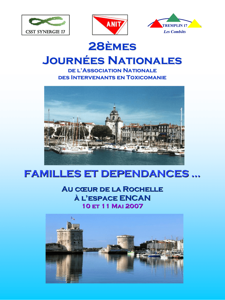 TREMPLIN 17 CSST SYNERGIE 17 Les Combôts 28èmes Journées Nationales de l’ l’Association Nationale des Intervenants en Toxicomanie FAMILLES ET DEPENDANCES … Au cœ cœur de la Rochelle à l’espace ENCAN 10 et 11 Mai 2007 Argumentaire Incontournables familles… au fil du temps, selon les modes et les idées du moment bien des discours se sont tenus sur elles: familles coupables, familles malades, familles à soutenir, familles soignantes …. Familles à multiples facettes, échappant aux « vérités » trop simples. Malgré tous ces discours qui tentent de les cerner, elles sont restées bien souvent seules, face aux usages de drogues en leur sein, à leurs côtés, confrontées aux diatribes médiatiques contradictoires, aux bons conseils des uns, des autres, parfois à la violence de la culpabilisation ou du rejet. Pourtant le constat est là : les familles sont de plus en plus fréquemment confrontées aux questions qui entourent les consommations de substances psychoactives, tabac, cannabis, alcool, ecstasy, bien sûr mais aussi de plus en plus souvent cocaïne, héroïne ou autres drogues… . La consommation n’est plus aussi rare, et tous les milieux professionnels, sociaux, sont concernés… Les drogues changent, mais les problèmes demeurent et parfois s’amplifient. Les familles aussi ont changé : la question de la parentalité ne se pose plus comme avant. Les familles monoparentales comme les familles recomposées questionnent les représentations et modèles traditionnels de la famille, la relation à l’autorité évolue, des problématiques nouvelles apparaissent comme celles des enfants de parents toxicomanes, autant d’évolutions qui toutes nécessitent d’adapter les soutiens et modalités d’intervention. Si elles sont de plus en plus souvent confrontées aux usages de drogues, elles ont aussi à faire face à la cacophonie des discours, qui allient ou opposent soin et soutien à l’autorité parentale, prévention et répression, banalisation ou dramatisation et qui les prennent à témoin ou en otage… Cacophonie aussi des interventions qui veulent parfois les aider en les punissant pour avoir mal élever leurs enfants ou parfois les discréditent en banalisant leur demande et leur souffrance et en les renvoyant à leurs sentiments d’isolement et d’impuissance. Pendant ces journées nous aborderons entre autres questions, celle de la place des familles dans les actions de prévention et dans les dispositifs d’écoute et d’aide existants, comment faciliter leur implication dans le soin quand tout devient problème entre leurs membres et qu’il convient de soutenir leur capacité à inventer des solutions inédites. Nous n’oublierons pas non plus leurs rôles dans l’accompagnement des usagers et dans leur insertion, ni ces familles particulières qui accueillent à leur domicile des personnes en difficulté. Enfin nous n’hésiterons pas à questionner la place des soignants et la légitimité de l’intervention sur/dans les familles pour avancer celle de l’intervention avec les familles… Afin de croiser les regards, nous aborderons donc les familles sous différents angles sociologiques, psychologiques, médicaux, et humains… afin de poser les jalons de l’aide réelle dont certaines ont besoin aujourd’hui. Comité d’Organisation Scientifique - Jean-Pierre COUTERON, Président de l’ANIT - Daniel BASSO-FIN, Directeur de Le TREMPLIN17- csst Synergie 17 et C3A alliance Daniel BERNIER, Déléqué régional pays de la Loire de l’ANIT Jean-Michel DELILE, Vice Président de l’ ANIT François HERVE, Vice Président de l’ANIT - Christian LAINE, Délégué -Union Régionale de l’ANIT Aquitaine - Isabelle MARTINEAU, Administratrice de l’ANIT - Marie VILLEZ, Secrétaire Générale de l’ANIT Organisation Locale CSST Synergie 17 Siège:12 rue Jean Moulin, à Sainte. Tél : 05 46 93 44 45 28è 28èmes Journé Journées Nationales Jeudi 10 Mai 2007 8h30 Inscription et accueil des participants 9h30 -10h15 Ouverture des Journées Représentant du Ministère de la santé ( sous réserve) Président de la MILDT ( sous réserve) Représentant de la mairie de la rochelle Présidente de TREMPLIN17-Csst Synergie 17 Président de l’ANIT 10h30 - 12h30 Plénière: « Évolution des contextes, évolution des concepts : Familles et addictions où en sommesnous ? » Présidence : Mme Marie VILLEZ, Directrice du Csst «Cèdre Bleu » , Lille Discutant : Dr Isabelle MARTINEAU, responsable du service soins « La Métairie », La Roche sur Yon Dr Sylvie ANGEL , psychiatre, Thérapeute familiale, « L’approche familiale des addictions » Mr Didier LAPEYRONNIIE, Professeur en Sociologie, Université Victor Segalen Bordeaux 2 « Relations particulières entre les familles et la rue : mode de vie dans les ghettos de la société française » 14h00 -16h00 Ateliers 16h15 -18h00 Plénière: « Pratique addictives, familles et sociétés : les systèmes humains comme ressource thérapeutique ». Présidence : Mr Daniel BASSO-FIN, Directeur du CSST « synergie 17 », et C3A Alliance Discutant : Dr Alain MOREL, directeur médicale du « Trait d’Union » , Boulogne Dr Mony ELKAIM , Psychiatre, Thérapeute Familiale Dr Jean-Michel DELILE, Directeur du « CEID » , Bordeaux, Mme Myriam CASSEN, psychologue clinicienne, thérapeute familiale,Institut Michel MONTAIGNE, Talence « expériences de soins sur les différents dispositifs et projet expérimental de thérapie multifamiliale » 18h30 Réception – Vin d’Honneur Vendredi 11 Mai 2007 9h00 -11h00 Ateliers 11h15 -13h00 Plénière : « Famille entre souffrances et ressources ? » Présidence : Mr Daniel BERNIER, Directeur de l’association « Le Triangle », Nantes Discutant : Professeur Jean-Luc VENISSE, Professeur , Hôpital Saint-Jacques, Nantes Mr André CHEMIN, Psychologue, thérapeute familiale systémique,Gestalt-thérapeute, directeur de »FORSYEA», Nantes « Comment travailler avec