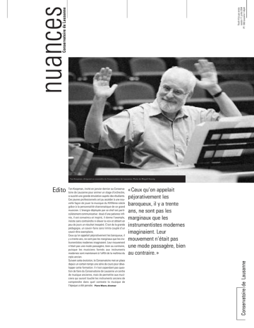 Paraît 4 fois par année numéro 17, juillet 2004 PP. 1000 Lausanne 1 dépôt Ton Koopman, dirigeant un ensemble du Conservatoire de Lausanne. Photo de Magali Koenig Edito Ton Koopman, invité en janvier dernier au Conservatoire de Lausanne pour animer un stage d’orchestre, a suscité une grande émulation auprès des étudiants. Ces jeunes professionnels ont pu accéder à une nouvelle façon de jouer la musique du XVIIIème siècle grâce à la personnalité charismatique de ce grand musicien. L’énergie déployée par ce chef est particulièrement communicative: doué d’une patience infinie, il est convaincu et inspiré, il donne l’exemple, insiste sans contraindre ni élever la voix et obtient en peu de jours un résultat inespéré. C’est de la grande pédagogie, un savoir-faire sans limite couplé d’un savoir-être exemplaire. Ceux qu’on appelait péjorativement les baroqueux, il y a trente ans, ne sont pas les marginaux que les instrumentistes modernes imaginaient. Leur mouvement n’était pas une mode passagère, bien au contraire, puisque les musiciens formés aux instruments modernes sont maintenant à l’affût de la maîtrise du style ancien. Suivant cette évolution, le Conservatoire met en place depuis un certain temps une série de cours pour développer cette formation. Il n’est cependant pas question de faire du Conservatoire de Lausanne un centre de musique ancienne, mais de permettre aux musiciens qui auront touché les instruments anciens de comprendre dans quel contexte la musique de l’époque a été pensée. Pierre Wavre, directeur « Ceux qu’on appelait péjorativement les baroqueux, il y a trente ans, ne sont pas les marginaux que les instrumentistes modernes imaginaient. Leur mouvement n’était pas une mode passagère, bien au contraire. » Bruno Pasquier Interprétation sur instruments d’époque Querelle des baroqueux : révolutionnaires ou réactionnaires ? Le Conservatoire se destine, par l’enseignement qu’il dispense, à assurer la transmission de la musique des différentes époques. Il s’agit pourtant d’une institution vivante qui se doit d’évoluer avec son temps. Or, d’éminents musiciens, tels que Nikolaus Harnoncourt ou Gustav Leonhardt, ont durant les dernières décennies révolutionné notre approche de la musique des XVIIème et XVIIIème siècles. Ils ont remis en question les traditions d’interprétation, issues du romantisme, telles qu’elles ont été et sont enseignées dans les conservatoires. Ainsi, un certain nombre de musiciens actuels ont été formés à l’ère post-romantique du XXème siècle, où un interdit, voire un tabou, proscrivait par exemple de « pousser les sons ». Le mouvement dit baroqueux confronte ces derniers à une remise en question éventuelle s’ils désirent suivre l’évolution de l’approche musicale. Un virage incontournable Depuis quelques temps, le Conservatoire de Lausanne a souhaité s’équiper pour permettre une compréhension plus juste, une interprétation plus authentique de la musique, qu’elle soit de l’époque baroque, classique ou romantique. Soucieux de promouvoir une approche pluristylistique, le Conservatoire a fait l’acquisition d’instruments anciens adéquats - des copies ou des originaux - de même qu’il soutient la mise en place d’ateliers et de séminaires propres à sensibiliser les jeunes musiciens à des questions de style. Convaincu de cette nécessité, il souhaite généraliser ce mouvement et en permettre l’accès aux étudiants. Ne va-t-on pas demander aux violonistes, dans un temps assez proche, s’ils savent jouer avec l’archet baroque ? Pour s’en convaincre, il suffit d’observer les instrumentistes d’orchestres institutionnalisés qui prennent des cours privés dans le but de s’adapter aux exigences actuelles. L’instrumentiste aujourd’hui : entre moderne et ancien Un nombre croissant de musiciens cultivent une nouvelle approche des partitions, non plus par des éditions soi-disant « Urtext », mais par le contact des autographes et par la relecture des traités qui n’est désormais plus l’apanage des seuls centres de musique ancienne. Si la lecture des traités est importante pour aborder le travail du style ancien, il est absolument nécessaire que l’interprète connaisse et se familiarise avec les sonorités des instruments d’époque qu’il pourra ensuite rechercher sur l’instrument moderne. Le contact avec un instrument différent du point de vue du toucher et de la sonorité enrichit la compréhension musicale de l’instrumentiste et le résultat sur l’instrument moderne s’en ressent de façon très positive. En effet, lorsque le musicien revient à l’instrument moderne, il est transformé au niveau de l’ornementation, du phrasé ou de sa recherche sonore. Un pas vers l’authenticité Le jeu sur instruments anciens permet d’entendre une œuvre musicale sous une forme aussi proche que possible de celle imaginée et conçue à l’origine par son compositeur. L’interprète découvre la signification Une vision du monde musical selon Bruno Pasquier d’une œuvre avec l’instrument pour lequel elle a été écrite et les procédés expressifs qu’il adopte s’en trouvent obligatoirement modifiés car son instrument sonne différemment. Or, ces instruments nous révèlent les sonorités et les textures qui étaient souhaitées par le compositeur. Citons le cas extrême du deuxième concerto Brandebourgeois pour trompette et flûte à bec. L’équilibre qu’envisage Bach est fonction des instruments pour lesquels il a composé. Des instruments modernes ne peuvent rendre ce qu’il a voulu. Altiste à l’orchestre de l’Opéra de Paris, Bruno Pasquier observe avec plaisir les caricatures du café Mozart, un art auquel son propre père 1 s’était livré avec talent. Ce professeur d’alto au Conservatoire se sent concerné et préoccupé par l’avenir de ses étudiants auta
