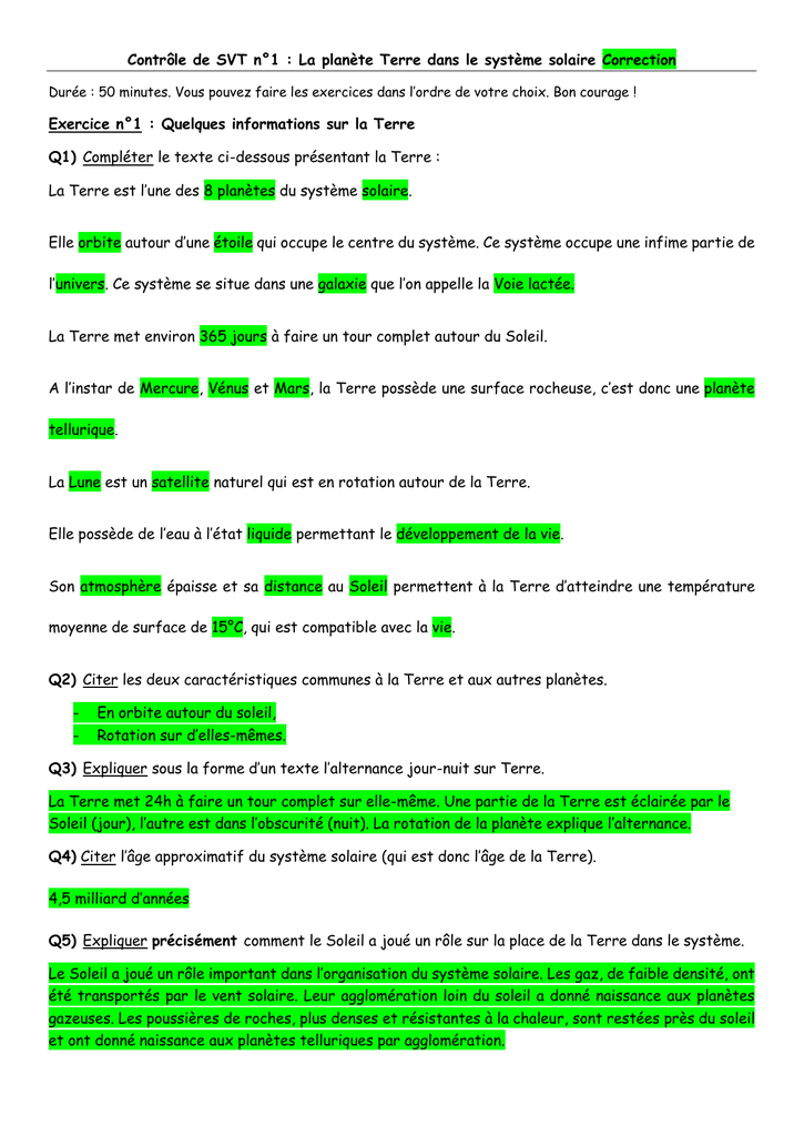 Contrôle de SVT n°1 : La planète Terre dans le système solaire Correction Durée : 50 minutes. Vous pouvez faire les exercices dans l’ordre de votre choix. Bon courage ! Exercice n°1 : Quelques informations sur la Terre Q1) Compléter le texte ci-dessous présentant la Terre : La Terre est l’une des 8 planètes du système solaire. Elle orbite autour d’une étoile qui occupe le centre du système. Ce système occupe une infime partie de l’univers. Ce système se situe dans une galaxie que l’on appelle la Voie lactée. La Terre met environ 365 jours à faire un tour complet autour du Soleil. A l’instar de Mercure, Vénus et Mars, la Terre possède une surface rocheuse, c’est donc une planète tellurique. La Lune est un satellite naturel qui est en rotation autour de la Terre. Elle possède de l’eau à l’état liquide permettant le développement de la vie. Son atmosphère épaisse et sa distance au Soleil permettent à la Terre d’atteindre une température moyenne de surface de 15°C, qui est compatible avec la vie. Q2) Citer les deux caractéristiques communes à la Terre et aux autres planètes. - En orbite autour du soleil, - Rotation sur d’elles-mêmes. Q3) Expliquer sous la forme d’un texte l’alternance jour-nuit sur Terre. La Terre met 24h à faire un tour complet sur elle-même. Une partie de la Terre est éclairée par le Soleil (jour), l’autre est dans l’obscurité (nuit). La rotation de la planète explique l’alternance. Q4) Citer l’âge approximatif du système solaire (qui est donc l’âge de la Terre). 4,5 milliard d’années Q5) Expliquer précisément comment le Soleil a joué un rôle sur la place de la Terre dans le système. Le Soleil a joué un rôle important dans l’organisation du système solaire. Les gaz, de faible densité, ont été transportés par le vent solaire. Leur agglomération loin du soleil a donné naissance aux planètes gazeuses. Les poussières de roches, plus denses et résistantes à la chaleur, sont restées près du soleil et ont donné naissance aux planètes telluriques par agglomération. Exercice n°2 : Comparaison de la Terre et de Vénus CONSTAT : > On constate que Vénus est une planète très proche de la Terre. Elle fut pendant longtemps considérée comme sa jumelle. Diamètre (Km) Surface Température moyenne en surface Rocheuse avec 15°C reliefs Rocheuse avec Vénus 12 756 475°C reliefs Titre : Tableau présentant quelques caractéristiques de Vénus et la Terre Terre 12 102 Atmosphère OUI OUI Q1) A partir du tableau, indiquer pourquoi on a longtemps pensé que la Terre et Vénus étaient des planètes jumelles. Attention : - Quand il est écrit « A partir du tableau » dans la consigne, il faut utiliser les données présentes dans ce tableau. - Ne pas oublier les unités quand on parle du diamètre. On a longtemps pensé que la Terre et Vénus étaient des planètes jumelles en raison de leur diamètre relativement proche (12 102 Km pour la Terre et 12 756 Km pour Vénus) et de leurs caractéristiques communes comme la présence d’une atmosphère et d’une surface rocheuse. > On constate cependant que Vénus a une température moyenne en surface beaucoup plus élevée que celle de la Terre. Q2) Formuler le problème auquel on va chercher à répondre. Comment expliquer que la température moyenne en surface de Vénus soit beaucoup plus élevée que celle de la Terre ? Théophile et Kevin, deux élèves en classe de 5ème discutent sur ce problème. Pour Kevin, Vénus est plus chaude car elle est plus proche du Soleil alors que pour Théophile cette différence de température s’explique par le fait que Vénus possède une atmosphère plus épaisse que celle de la Terre. Q3) A partir du texte, reformuler l’hypothèse de Kevin. Kevin pense que Vénus est plus chaude que la Terre car elle est plus proche du Soleil. Q4) A partir du texte, reformuler l’hypothèse de Théophile. Théophile pense que la différence de température entre Vénus est la Terre s’explique par la présence d’une atmosphère plus épaisse sur Vénus. Dans la suite de l’exercice, on s’intéresse uniquement à l’hypothèse de Théophile. Pour Tester l’hypothèse, on réalise le montage présenté au tableau. Q5) Compléter le tableau ci-dessous : Elément du modèle Elément réel Cloche en verre Atmosphère Plaque A Plaque B Lampe Vénus Terre Soleil Les résultats obtenus permettent d’observer que la température augmente plus rapidement dans l’expérience Test que dans l’expérience témoin. Q6) Cocher la bonne interprétation des résultats. J’en déduis que la température est plus importante dans l’expérience Test. J’en déduis que l’atmosphère participe à la conservation de la chaleur à la surface d’un astre, ce qui participe à augmenter sa température de surface. J’en déduis que Vénus possède une atmosphère plus épaisse que la Terre, ce qui lui permet de retenir davantage de chaleur et donc d’avoir une température moyenne plus élevée. X Q7) Conclure sur la validité de l’hypothèse de Théophile. J’en conclus que l’hypothèse de Théophile est validée. Vénus possède une atmosphère plus épaisse que la Terre, ce qui lui permet de retenir davantage de chaleur et donc d’avoir une température moyenne de surface plus élevée. Q8) Donner une ou deux raisons expliquant la nécessité de faire de la modélisation pour tester l’hypothèse de Théophile. Raison n°1 : La complexité du réel nécessite une simplification passant par la réalisation d’un modèle. Raison n°2 : Le réel est inaccessible (on ne peut pas aller sur Vénus) d’où le recours à un modèle Q9) Réaliser un schéma présentant l’effet de serre sur Terre et sur Vénus (sur le sujet) TITRE : Schéma présentant l’effet de serre sur Terre TITRE : Schéma présentant l’effet de serre sur Vénus Il faut refaire le même schéma que pour la Terre avec deux différences : -