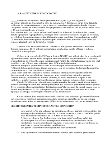 SI L'ANESTHESIE M'ETAIT CONTEE... Dimanche, 9h du matin. Pas de grasse matinée ce jour là, je suis de garde ! Ce sont 21 patients qui franchiront la porte du cabinet, dont 4 désemparés car en prise depuis la veille avec de violentes douleurs et que je trouverai prostrés et en pleurs dans la salle d'attente. Une pulpite sur une 38 dont l'avulsion était programmée, une autre sur une 46, et deux abcès sur 45 et 46 sont responsables des urgences. Trois minutes après que chaque patient ait été installé sur le fauteuil, les soins ad hoc peuvent débuter : pulpotomie ; pulpectomies, drainages trans canalaires s'enchainent malgré les mobilités, les cellulites, les douleurs aigues, grâce à l'obtention quasi immédiate d'une analgésie de qualité. Le lendemain, l'assistante appelle les patients pour prendre de leurs nouvelles. Tous auront été soulagés et auront enfin pû dormir et se reposer. Scénario idéal d'une dentisterie du 22è siècle ? Non ; scènes habituelles d'un cabinet dentaire classique de 2012, utilisant une technique anesthésique simple, efficace et indolore : l'anesthésie intra-diploïque. Celle-çi a été proposée dès 1907 par le docteur NOGUE, qui utilisait alors de la cocaïne qu'il injectait directement au sein de l'os spongieux après avoir réalisé une perforation de la corticale avec un forêt de SS White. Il comprit immédiatement l'intérêt de cette technique, à savoir son effet immédiat et très efficace, mais se heurtait à des difficultés de réalisation. Très vite il entreprit d'ajouter un vaso-actif à l'anesthésique, et constata alors que la durée et l'efficacité de l'analgésie obtenue étaient augmentées tout en permettant de diminuer la quantité de cocaïne injectée et donc d'en abaisser la toxicité . Grâce à cette méthode, l'anesthésie pulpaire immédiate obtenue pour n'importe quelle dent s'accompagnait d'une anesthésie des tissus mous autorisant ainsi une extraction indolore. Hélas la méthode, mal commode à mettre en œuvre, se trouva rapidement reléguée « aux oubliettes » avec l'avènement de l'anesthésie para-apicale puis des techniques loco-régionales. C'est le Dr Villette qui, très rapidement après son début d'éxercice, s'est intéressé à cette méthode oubliée pour tenter d'en tirer la quintessence. Ses recherches permirent la mise au point de divers systèmes, plus ou moins faciles d'utilisation, jusqu'à l'avènement du « quick sleeper » par la société française Dental Hi Tec, qui représente aujourd'hui le seul matériel d'anesthésie intradiploïque assistée par éléctronique commercialisé de par le monde. Cet article veut donc tenter de mieux faire connaître cette technique, qui est manifestement mal comprise par nombre de praticiens alors qu'elle apporte un véritable plus à notre pratique quotidienne, rassemblant les avantages des différentes techniques sans en avoir les inconvénients. LES DIFFENRENTES TECHNIQUES A NOTRE DISPOSITION – para-apicale : c'est une technique de base simple, efficace, que tout praticien utilise. Son avantage majeur réside dans la facilité de sa mise en œuvre et dans la possibilité qu'elle offre d'obtenir une anesthésie de 1 à 3 dents au maximum. A l'inverse, elle peut être douloureuse ( point inter incisif maxillaire, palais ) et nécessiter pour être efficace un complément vestibulaire ( anesthésie des racines vestibulaires molaires maxillaires) ou palatin, et son action est très souvent limitée ou inopérante en regard des molaires mandibulaires. Elle permet l'utilisation de toute spécialité à notre disposition. – intra-ligamentaire : elle est immédiatement efficace, mais nécessite généralement l'emploi d'une seringue à crémaillère afin de démultiplier l'avancée du piston et de rendre ainsi l'injection facile malgré la densité du ligament. Ses inconvénients majeurs résident dans le fait que son action soit limitée à la dent concernée, et que l'utilisation d'un anesthésique adrénaliné à plus de 1/200000 soit déconseillée afin de ne pas risquer d'induire une desmodontite. Cette technique est interdite en cas de patient porteur d'une pathologie cardiaque, car il n'est pas possible de désinfecter le sulcus avant d'y faire pénétrer l'aiguille, et il peut donc y avoir là une porte d'entrée de germes indésirables. – intra-septale : elle aussi présente l'avantage d'être immédiatement efficace, mais l'injection dans le septum, qui est une zone osseuse fortement minéralisée et peu vascularisée interdit là encore l'utilisation de vaso-actifs fortement concentrés sous peine de risquer de voir apparaître une nécrose. De plus, tout praticien qui a utilisé peu ou prou cette méthode sait combien il peut être difficile de pénétrer le septum, tordant ou cassant parfois plusieurs aiguilles, avant d'injecter en appuyant lourdement sur le piston au risque de fracturer la cartouche. Elle permet par contre d'obtenir l'anesthésie des 2 dents collatérales. – intra-pulpaire : je ne la cite que pour mémoire, car elle représente la concrétisation de l'échec des techniques préalablement mises en œuvre. Très douloureuse pour le patient, elle ne devrait plus faire partie de notre arsenal thérapeutique. – loco-régionales : rétro-tubérositaire, canine haute ou trou mentonnier ne sont utilisées que ponctuellement . Par contre l'anesthésie à l'épine de Spix, elle, est couramment employée y compris chez les enfants en bas âge. Sa mise en œuvre requiert une bonne maîtrise de la technique, alliée à des connaissances anatomiques, mais même réalisée dans des conditions optimum par des praticiens aguerris elle connait plus de 20% d'échecs, rendant souvent nécessaire le recours à une ou des techniques complémentaires. Selon les praticiens, le temps de latence avant d'obtenir un effet satisfaisant varie de quelques secondes à plus de 20 minutes, et l'anesthésie entrainée au niveau de la lèvr