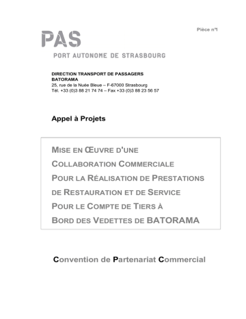 Pièce n°1 DIRECTION TRANSPORT DE PASSAGERS BATORAMA 25, rue de la Nuée Bleue – F-67000 Strasbourg Tél. +33 (0)3 88 21 74 74 – Fax +33 (0)3 88 23 56 57 Appel à Projets MISE EN ŒUVRE D'UNE COLLABORATION COMMERCIALE POUR LA RÉALISATION DE PRESTATIONS DE RESTAURATION ET DE SERVICE POUR LE COMPTE DE TIERS À BORD DES VEDETTES DE BATORAMA Convention de Partenariat Commercial Mise en Œuvre d'une Collaboration Commerciale pour la Réalisation de Prestations de Restauration et de Service pour le Compte de Tiers à Bord des Vedettes de BATORAMA Convention de Partenariat Commercial CONVENTION DE PARTENARIAT COMMERCIAL Entre le PORT AUTONOME DE STRASBOURG, établissement public régi par la loi du 26 avril 1924 ayant pour siège 25 rue de la Nuée Bleue à 67000 Strasbourg, représenté par son Directeur général, M. Jean-Louis JEROME, ingénieur général des Ponts, Eaux et Forêts, dénommé ci-après "le Port autonome" d'une part, et La société (dénomination sociale), société (forme juridique) au capital de (indiquer le montant en Euros (€) (en chiffres et lettres) dont le siège social est situé à (préciser l’adresse), immatriculée au Registre du Commerce et des Sociétés (R.C.S.) de (mentionner la ville) sous le numéro SIREN (le préciser) Représentée par Monsieur/Madame (mentionner son identité), dûment habilité(e) en sa qualité de (préciser sa fonction) dénommée ci-après "le partenaire" d'autre part. La présente convention a pour objectif de définir les modalités et conditions du partenariat commercial portant sur la réalisation de prestations événementielles par le partenaire, dans le cadre de commandes passées par un tiers dénommé "Client BATORAMA", à bord des navettes fluviales exploitées par le Port autonome sous l’enseigne commerciale « BATORAMA ». ARTICLE 1 – OBJET DE LA CONVENTION Le présent contrat est un contrat de partenariat commercial ayant pour objet la mise en relation du partenaire avec des clients du Port autonome ou du Port Autonome avec des clients du partenaire. En effet, dans le cadre de son activité touristique de promenades en bateaux mouches (exploitée sous l’enseigne commerciale « BATORAMA »), le Port autonome a développé une prestation de services évènementiels à bord de ses unités. Ces prestations peuvent nécessiter la mise en place d'un service traiteur et/ou restauration. Cette mise en relation est destinée à permettre aux clients du Port autonome de pouvoir disposer d'un prestataire professionnel capable de fournir une prestation de service de type "traiteur" à bord d'une des unités de navigation que le client a loué ou aux clients du partenaire de disposer d’une nouvelle offre d’accueil événementiel. ARTICLE 2 – NATURE DU PARTENARIAT 2.1 - Le partenaire est référencé en tant que prestataire autorisé par le Port autonome pour la réalisation de prestations événementielles pour le compte de tiers, à bord de l’ensemble des navettes fluviales du Port autonome, en particulier les unités « Doubs » et « Charles Altorffer » dédiées à ces prestations. 2/8 13-22DTP Mise en Œuvre d'une Collaboration Commerciale pour la Réalisation de Prestations de Restauration et de Service pour le Compte de Tiers à Bord des Vedettes de BATORAMA Convention de Partenariat Commercial Ces tiers sont les clients ayant conclus avec le Port autonome un contrat de location de l’unité fluviale pour la réalisation d’une croisière fluviale, ou ayant sollicités la location d’un bateau accompagnée de prestations accessoires (de type apéritifs, restauration…). Ce référencement n’est pas exclusif et ne procure pour le partenaire aucune garantie de clientèle ou de recette, dans la mesure où les clients du Port autonome disposent de la faculté de s’adresser à tout autre cocontractant pour la réalisation des prestations accessoires sollicitées le cas échéant. Le Port autonome est étranger aux échanges entre le partenaire et le client potentiel, de même qu’aux conventions conclues visant à formaliser les prestations. Par ailleurs, le présent partenariat ne concerne pas les prestations que commanderait le Port autonome pour ses besoins propres, lesquelles sont soumises aux règles des achats publics. 2.2. – Nature des relations contractuelles a) Relations Client - Prestataires Les commandes seront passées directement par le client du Port autonome au partenaire, dans les conditions définies dans le cadre de leurs accords. À l'issue de l'exécution de la commande, le prestataire adresse directement sa facture au client qui a émis la commande. Les conditions de règlement de celle-ci sont définies d'un commun accord entre les parties et dans le respect de la législation applicable. b) Relations Prestataires – Port autonome Les prestataires qui ont été référencés par le Port autonome auprès de ses clients s'engagent à tout faire pour donner entière satisfaction à ceux-ci. Dans le cas d'insatisfactions répétées de la part de nos clients vis-à-vis d'un même prestataire, le Port autonome se réserve le droit de mettre fin à la convention de partenariat commercial avec le prestataire défaillant. 2.3 – Le partenaire exploitera son activité pour le compte des clients à ses risques et périls, de sorte qu’à aucun moment le Port autonome ne peut être amené à prendre en charge notamment tout ou partie d’un déficit lié aux prestations. De convention expresse entre les parties, il est convenu que l’activité exercée par le partenaire ne peut être regardée comme constituant l’exploitation d’un fonds de commerce. La présente convention est personnelle et incessible. ARTICLE 3 – DURÉE La présente convention est conclue pour une durée de 1 (un) an à compter du ………………………., soit jusqu’au ………………………….. Elle est reconductible tacitement, les deux parties ayant la possibilité d'y mettre fin à tout mom