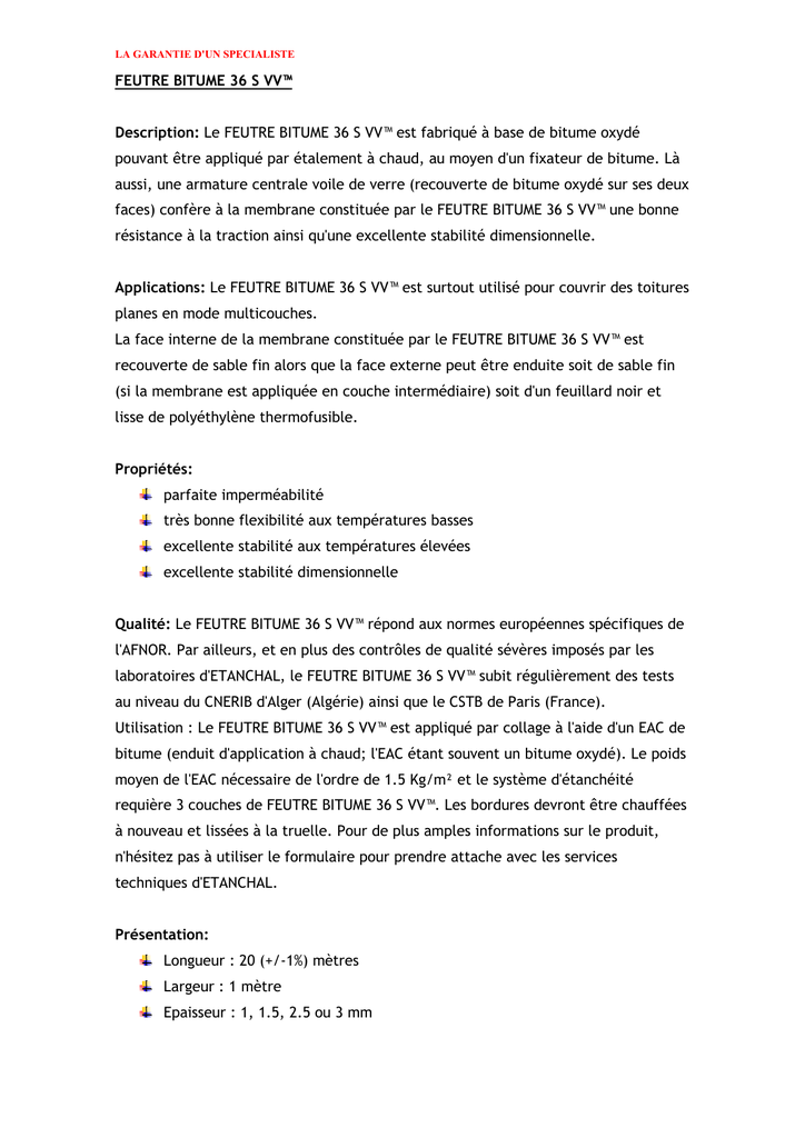 LA GARANTIE D'UN SPECIALISTE FEUTRE BITUME 36 S VV™ Description: Le FEUTRE BITUME 36 S VV™ est fabriqué à base de bitume oxydé pouvant être appliqué par étalement à chaud, au moyen d'un fixateur de bitume. Là aussi, une armature centrale voile de verre (recouverte de bitume oxydé sur ses deux faces) confère à la membrane constituée par le FEUTRE BITUME 36 S VV™ une bonne résistance à la traction ainsi qu'une excellente stabilité dimensionnelle. Applications: Le FEUTRE BITUME 36 S VV™ est surtout utilisé pour couvrir des toitures planes en mode multicouches. La face interne de la membrane constituée par le FEUTRE BITUME 36 S VV™ est recouverte de sable fin alors que la face externe peut être enduite soit de sable fin (si la membrane est appliquée en couche intermédiaire) soit d'un feuillard noir et lisse de polyéthylène thermofusible. Propriétés: parfaite imperméabilité très bonne flexibilité aux températures basses excellente stabilité aux températures élevées excellente stabilité dimensionnelle Qualité: Le FEUTRE BITUME 36 S VV™ répond aux normes européennes spécifiques de l'AFNOR. Par ailleurs, et en plus des contrôles de qualité sévères imposés par les laboratoires d'ETANCHAL, le FEUTRE BITUME 36 S VV™ subit régulièrement des tests au niveau du CNERIB d'Alger (Algérie) ainsi que le CSTB de Paris (France). Utilisation : Le FEUTRE BITUME 36 S VV™ est appliqué par collage à l'aide d'un EAC de bitume (enduit d'application à chaud; l'EAC étant souvent un bitume oxydé). Le poids moyen de l'EAC nécessaire de l'ordre de 1.5 Kg/m² et le système d'étanchéité requière 3 couches de FEUTRE BITUME 36 S VV™. Les bordures devront être chauffées à nouveau et lissées à la truelle. Pour de plus amples informations sur le produit, n'hésitez pas à utiliser le formulaire pour prendre attache avec les services techniques d'ETANCHAL. Présentation: Longueur : 20 (+/-1%) mètres Largeur : 1 mètre Epaisseur : 1, 1.5, 2.5 ou 3 mm 14 LA GARANTIE D'UN SPECIALISTE Armature: Voile de verre d'une densité de 50 g/m² (d'autres densités métriques sont disponibles sur commande). FICHE TECHNIQUE DU FEUTRE BITUME 36 S VV ™ CARATERISTIQUES 1- Point de ramollissement (TBA) 2- Point de pénétration de Dow à 25°C 3- Résistance au fluage à 120 °C, 2 heures 4- Flexibilité à basse température 5- Force de traction à 25°C ETAT °C dmm longitudinale transversale °C RESULTATS 90 ± 2 25 ± 2 pas de fluage -5 à 0 METHODE D'ESSAI ASTM D-36 ASTM D-5 ASTM D-5147 ASTM D-5147 N/5 cm N/5 cm 250 160 ASTM D-5147 ASTM D-5147 % % 3 3 ASTM D-5147 ASTM D-5147 N N 180 120 ASTM D-5147 ASTM D-5147 L1 I1 UEAtc UEAtc <= 0.5 ASTM D-5147 <= 0.5 ASTM E-96 6- Elongation maximale en cas de rupture (à 25°C) longitudinale transversale 7- Résistance à la rupture (à 25°C) longitudinale transversale 8- Résistance au poinçonnement (à 25°C) statique dynamique 9- Absorption d'eau à 25°C, 24 heures 10- Perméabilité à la vapeur d'eau % massique gr/m²/24h 15
