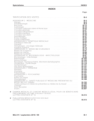 Spécialistes INDEX INDEX Page TARIFICATION DES VISITES . . . . . . . . . . . . . . . . . . . . . . . . . . . . . . . . . . B-3 ADDENDUM 1 - MÉDECINE Allergie . . . . . . . . . . . . . . . . . . . . . . . . . . . . . . . . . . . . . . . . . . . . . . . . . . . . . . . . Anesthésiologie. . . . . . . . . . . . . . . . . . . . . . . . . . . . . . . . . . . . . . . . . . . . . . . . . . Biochimie . . . . . . . . . . . . . . . . . . . . . . . . . . . . . . . . . . . . . . . . . . . . . . . . . . . . . . Cardiologie . . . . . . . . . . . . . . . . . . . . . . . . . . . . . . . . . . . . . . . . . . . . . . . . . . . . . Chirurgie cardiovasculaire et thoracique . . . . . . . . . . . . . . . . . . . . . . . . . . . . . . Chirurgie générale . . . . . . . . . . . . . . . . . . . . . . . . . . . . . . . . . . . . . . . . . . . . . . . Chirurgie orthopédique. . . . . . . . . . . . . . . . . . . . . . . . . . . . . . . . . . . . . . . . . . . . Chirurgie plastique . . . . . . . . . . . . . . . . . . . . . . . . . . . . . . . . . . . . . . . . . . . . . . . Chirurgie vasculaire . . . . . . . . . . . . . . . . . . . . . . . . . . . . . . . . . . . . . . . . . . . . . . Dermatologie. . . . . . . . . . . . . . . . . . . . . . . . . . . . . . . . . . . . . . . . . . . . . . . . . . . . Endocrinologie . . . . . . . . . . . . . . . . . . . . . . . . . . . . . . . . . . . . . . . . . . . . . . . . . . Gastro-entérologie . . . . . . . . . . . . . . . . . . . . . . . . . . . . . . . . . . . . . . . . . . . . . . . ADDENDUM 9 - GÉNÉTIQUE MÉDICALE . . . . . . . . . . . . . . . . . . . . . . . . . . . . . Génétique médicale . . . . . . . . . . . . . . . . . . . . . . . . . . . . . . . . . . . . . . . . . . . . . . Gériatrie. . . . . . . . . . . . . . . . . . . . . . . . . . . . . . . . . . . . . . . . . . . . . . . . . . . . . . . . Hématologie - oncologie médicale . . . . . . . . . . . . . . . . . . . . . . . . . . . . . . . . . . Hygiène publique . . . . . . . . . . . . . . . . . . . . . . . . . . . . . . . . . . . . . . . . . . . . . . . . ADDENDUM 11 - MÉDECINE D’URGENCE . . . . . . . . . . . . . . . . . . . . . . . . . . . Médecine d’urgence. . . . . . . . . . . . . . . . . . . . . . . . . . . . . . . . . . . . . . . . . . . . . . Médecine interne . . . . . . . . . . . . . . . . . . . . . . . . . . . . . . . . . . . . . . . . . . . . . . . . Médecine nucléaire . . . . . . . . . . . . . . . . . . . . . . . . . . . . . . . . . . . . . . . . . . . . . . ADDENDUM 10 - MICROBIOLOGIE - INFECTIOLOGIE . . . . . . . . . . . . . . . . . . Microbiologie - Infectiologie . . . . . . . . . . . . . . . . . . . . . . . . . . . . . . . . . . . . . . . . Néphrologie . . . . . . . . . . . . . . . . . . . . . . . . . . . . . . . . . . . . . . . . . . . . . . . . . . . . Neurochirurgie . . . . . . . . . . . . . . . . . . . . . . . . . . . . . . . . . . . . . . . . . . . . . . . . . . Neurologie, neuropsychiatrie, électroencéphalographie. . . . . . . . . . . . . . . . . . Obstétrique - Gynécologie . . . . . . . . . . . . . . . . . . . . . . . . . . . . . . . . . . . . . . . . . Ophtalmologie. . . . . . . . . . . . . . . . . . . . . . . . . . . . . . . . . . . . . . . . . . . . . . . . . . . Oto-rhino-laryngologie . . . . . . . . . . . . . . . . . . . . . . . . . . . . . . . . . . . . . . . . . . . . ADDENDUM 2 - PÉDIATRIE . . . . . . . . . . . . . . . . . . . . . . . . . . . . . . . . . . . . . . . . Pédiatrie . . . . . . . . . . . . . . . . . . . . . . . . . . . . . . . . . . . . . . . . . . . . . . . . . . . . . . . Physiatrie. . . . . . . . . . . . . . . . . . . . . . . . . . . . . . . . . . . . . . . . . . . . . . . . . . . . . . . Pneumologie . . . . . . . . . . . . . . . . . . . . . . . . . . . . . . . . . . . . . . . . . . . . . . . . . . . . ADDENDUM 3 - PSYCHIATRIE . . . . . . . . . . . . . . . . . . . . . . . . . . . . . . . . . . . . . Psychiatrie. . . . . . . . . . . . . . . . . . . . . . . . . . . . . . . . . . . . . . . . . . . . . . . . . . . . . . Radio-oncologie . . . . . . . . . . . . . . . . . . . . . . . . . . . . . . . . . . . . . . . . . . . . . . . . . Rhumatologie . . . . . . . . . . . . . . . . . . . . . . . . . . . . . . . . . . . . . . . . . . . . . . . . . . . ADDENDUM 12 - SANTÉ PUBLIQUE ET MÉDECINE PRÉVENTIVE OU MÉDECINE DU TRAVAIL . . . . . . . . . . . . . . . . . . . . . . . . . . . . . . . . . . . . . . . . . . Santé publique et médecine préventive ou médecine du travail . . . . . . . . . . . Urologie. . . . . . . . . . . . . . . . . . . . . . . . . . . . . . . . . . . . . . . . . . . . . . . . . . . . . . . . Hors discipline . . . . . . . . . . . . . . . . . . . . . . . . . . . . . . . . . . . . . . . . . . . . . . . . . . Divers . . . . . . . . . . . . . . . . . . . . . . . . . . . . . . . . . . . . . . . . . . . . . . . . . . . . . . . . . B-3 B-5 B-9 B-13 B-15 B-23 B-27 B-31 B-33 B-35 B-37 B-45 B-51 B-55 B-57 B-61 B-67 B-73 B-75 B-81 B-89 B-95 B-97 B-99 B-105 B-109 B-113 B-119 B-131 B-137 B-141 B-143 B-151 B-157 B-161 B-169 B-185 B-189 B-193 B-195 B-201 B-205 B-207 # EXAMEN MÉDICAL ET CONSTAT MÉDICO-LÉGAL POUR UN BÉNÉFICIAIRE PRÉSUMÉMENT VICTIME D’ASSAUT SEXUEL (LETTRE D’ENTENTE NO 5) . . . . . . . . . . . . . . . . . . . . . . . . . . . . . . . . . . . . . . . . . B-213 # ÉVALUATION MÉDICO-PSYCHO-SOCIALE (LETTRE D’ENTENTE NO 6) . . . . . . . . . . . . . . . . . . . . . . . . . . . . . . . . . . . . . . . . . B-213 MAJ 91 / septembre 2016 / 99 B-1 INDEX Spécialistes Page # LA RÉMUNÉRATION DE CERTAINES ACTIVITÉS EFFECTUÉES PAR LES MÉDECINS SPÉCIALISTES SUIVANT LA LOI SUR LA PROTECTION O 64). . . . . . . . . . . . . . . . . . . . . . . . . DE LA JEUNESSE (LETTRE D’ENTENTE N B-215 # LA RÉMUNÉRATION DE CERTAINES ÉVALUATIONS MÉDICALES EFFECTUÉES PAR LES MÉDECINS SPÉCIALISTES (LETTRE D’ENTENTE NO 172) . . . . . . . . . . . . . . . . . . . . . . . . . . . . . . . . . . . . . . . B-216 # SERVICES PROFESSIONNELS COUVERTS PAR LA LO