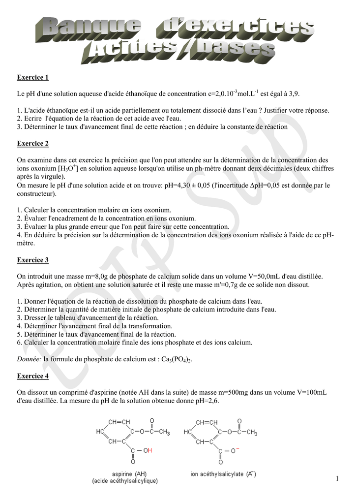 1. Ecrire l'équation de la réaction acido-basique entre l'aspirine et l'eau.