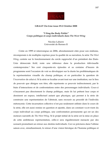 187 GRAAT On-Line issue #5.2 October 2008 “I Sing the Body Politic” Corps politique et corps individuels dans The West Wing Nicolas Labarre Université de Rennes II Créée en 1999 et interrompue en 2006, abondamment citée pour son réalisme, récompensée à de multiples reprises pour la qualité de sa narration, la série The West Wing, centrée sur le fonctionnement du cercle rapproché d’un président des EtatsUnis démocrate fictif, reste une référence dans la production télévisuelle contemporaine.1 Ses cent cinquante-six épisodes et sa centaine d’heures de programme sont l’occasion de voir se développer sur la durée les problématiques de la représentation visuelle du champ politique, et en particulier la question de l’incarnation de celui-ci. Si la série se focalise avant tout sur une institution, sur le lieu de pouvoir que désigne son titre, elle représente ce pouvoir indirectement, par le biais d’interactions et de confrontations entre des personnages individuels. Ceux-ci n’incarnent pas directement le champ politique, mais ils lui prêtent leur corps et dessinent un espace, intellectuel autant que physique, qui permet à la série de construire une représentation de l’abstrait, sans recourir au procédé de l’individu métonymie. Cette incarnation collective n’est pas seulement utilisée dans le cours de la série, elle est aussi remise en question et ajustée, dans un constant va-et-vient du corps individuel au corps politique, une confrontation permanente qui est un des moteurs narratifs de The West Wing. Si le projet initial de la série est la mise en place de cette ambitieuse représentation, celle-ci sera régulièrement menacée par des scenarii promettant un retour aux destins individuels. Ceci se précisera dans l’ultime saison avec, simultanément, le retour d’une vision héroïque de l’homme politique et 188 la démonstration de la dépendance du corps politique au sein de la diégèse envers le corps physique des acteurs incarnant ses protagonistes. Construire le corps collectif Dès le premier épisode de la série, le passage de l’individuel au collectif est mis en scène et dramatisé dans une intrigue dont le seul enjeu est d’assembler des personnages disparates afin de reconstituer pour le spectateur une équipe (déjà formée au sein de la diégèse), laquelle sera à son tour chargée de donner corps au politique. La séquence pré-générique est éloquente ; s’y succèdent des images d’un jeune homme brillant discutant avec un journaliste dans un bar, d’un homme au travail dans un avion, d’une femme en pleine séance de gymnastique, d’un fonctionnaire quittant son domicile au matin, tandis que quelqu’un dort dans son bureau. Tous ces personnages reçoivent un message cryptique annonçant que POTUS a eu un accident. POTUS, acronyme que les personnages secondaires prendront pour un nom de famille, désigne le président des Etats-Unis. Autour de cette confusion entre individu et fonction s’amorce la constitution d’une équipe, suivant une tradition narrative dans laquelle des individus disparates, ici seulement unis par la sonnerie d’un beeper, forment une équipe hétérogène mais efficace. À cette convention, The West Wing ajoute pourtant deux corolaires. Le premier est l’existence d’un lieu de ralliement, l’Aile Ouest elle-même, qu’il est nécessaire de comprendre non seulement comme un espace géographique mais aussi comme la désignation d’un collectif. Le deuxième élément, un trait stylistique majeur de la série, est l’usage de la technique du walk and talk : scènes complexes, souvent de longs plans-séquences, s’accrochant successivement aux divers personnages en mouvement et en pleine discussion pour créer une sensation d’activités simultanées, de circulation à la fois des individus et de l’information. Le corps individuel n’est pas dissout, mais intégré dans une circulation continue, dans un processus vital plus vaste.2 Sillonnée dans toutes les directions, parcourue par des flux multiples à l’instar d’un organisme vivant, l’Aile Ouest 189 devient un organisme colonie au sein duquel les individus évoluent dans une chorégraphie soigneusement planifiée, au service d’une volonté et d’un intérêt supérieur, parmi d’innombrables collègues anonymes mais affairés. La série intègre donc une convention établie, mais affirme d’emblée son ambition d’aller au-delà de cette convention, puisque l’équipe rassemblée, si elle joue les premiers rôles par la suite, ne constitue qu’une fraction d’un ensemble plus vaste. Dans le pilote, au-delà des corps individuels, l’unité reste à construire et, de façon symptomatique, l’intrigue met en scène la possible éviction d’un des membres de l’équipe, Joshua Lyman (Bradley Whitford). Simultanément, on apprend que l’accident survenu au président est une ridicule chute de vélo, contraste troublant entre la hauteur de la fonction et la banalité de l’atteinte au corps qui l’incarne. Le début de l’épisode est alors consacré à des destinées individuelles qui semblent toutes aller à l’encontre du travail collectif et de la constitution d’un ordre supérieur. « À moins que d'une tête, un si grand corps chancelle », écrit Corneille dans Othon, à propos de l’empire romain; The West Wing s’ouvre sur la démonstration de cette affirmation. Le désordre ne s’interrompra en effet que lorsque sera reconstitué le corps politique au grand complet, au moment où le président Bartlet (Martin Sheen), revient à la Maison-Blanche pour redevenir Head of the Executive, la tête plutôt que le chef de l’exécutif. Son arrivée se produit au milieu d’une discussion animée, qui s’apaise immédiatement. Vêtu de façon informelle d’un polo vert sombre et d’un coupe-vent, le chef de l’Etat impose pourtant silence et respect à ceux qui se trouvent en sa pr