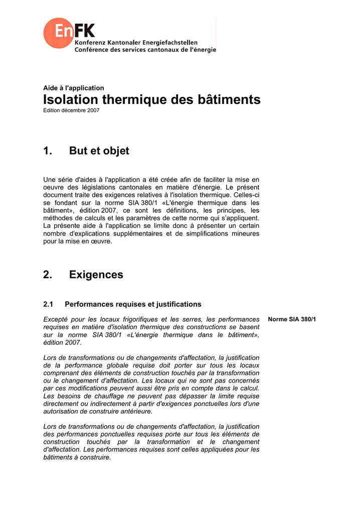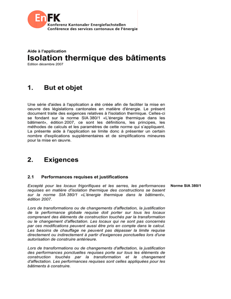 Aide à l'application Isolation thermique des bâtiments Edition décembre 2007 1. But et objet Une série d'aides à l'application a été créée afin de faciliter la mise en oeuvre des législations cantonales en matière d'énergie. Le présent document traite des exigences relatives à l'isolation thermique. Celles-ci se fondant sur la norme SIA 380/1 «L'énergie thermique dans les bâtiment», édition 2007, ce sont les définitions, les principes, les méthodes de calculs et les paramètres de cette norme qui s’appliquent. La présente aide à l'application se limite donc à présenter un certain nombre d'explications supplémentaires et de simplifications mineures pour la mise en œuvre. 2. 2.1 Exigences Performances requises et justifications Excepté pour les locaux frigorifiques et les serres, les performances requises en matière d'isolation thermique des constructions se basent sur la norme SIA 380/1 «L'énergie thermique dans le bâtiment», édition 2007. Lors de transformations ou de changements d'affectation, la justification de la performance globale requise doit porter sur tous les locaux comprenant des éléments de construction touchés par la transformation ou le changement d'affectation. Les locaux qui ne sont pas concernés par ces modifications peuvent aussi être pris en compte dans le calcul. Les besoins de chauffage ne peuvent pas dépasser la limite requise directement ou indirectement à partir d'exigences ponctuelles lors d'une autorisation de construire antérieure. Lors de transformations ou de changements d'affectation, la justification des performances ponctuelles requises porte sur tous les éléments de construction touchés par la transformation et le changement d'affectation. Les performances requises sont celles appliquées pour les bâtiments à construire. Norme SIA 380/1 Page 2 Aide à l’application «Isolation thermique des bâtiments» CONFERENCE DES SERVICES CANTONAUX DE L’ENERGIE Edition 2007 2.2 Dispense Dispense et allégement Sont dispensés du respect des exigences en matière d'isolation thermique: a) les bâtiments chauffés à moins de 10°C de manière active, excepté les chambres froides; b) les chambres froides qui ne sont pas refroidies à moins de 8°C; c) les bâtiments dont l'autorisation de construire est limitée à trois ans au maximum (constructions provisoires); d) les bâtiments dont le changement d'affectation n'implique pas d'élévation ou de baisse de la température ambiante et, de ce fait, n'augmente pas la différence de température mesurée au niveau de l’enveloppe thermique du bâtiment. Les constructions montées chaque année durant la mauvaise saison peuvent, sur demande dûment motivée, faire l'objet d'une dérogation si le respect des exigences s'avère disproportionné. 3. Explications 3.1 Type de justification Choix du type de justification La législation laisse libre le choix du type de justification, à savoir la justification par performances ponctuelles ou par performance globale, à une exception près: la justification par performances ponctuelles ne peut être utilisée pour des nouveaux bâtiments qu’en l’absence de façades rideaux ou de vitrages ayant un taux de transmission d’énergie globale inférieur à 0,3. (cf. norme SIA 380/1, chiffre 2.2.1.4). Justification par performances ponctuelles La justification par performances ponctuelles fixe les valeurs U maximales admises pour chaque élément de construction. Cette procédure est plus simple que celle de la justification par performance globale. Justification par performance globale La norme SIA 380/1 constitue une base pour optimiser techniquement et économiquement l'isolation thermique de l'enveloppe d'un bâtiment. Seul l'objectif global est défini par la performance globale requise (MJ/m2). Les valeurs U des différents éléments de construction peuvent être choisies librement – en respectant les limites imposées par la physique appliquée à la construction (voir norme SIA 380/1, chiffre 0.3.4). La performance globale formulée dans cette norme correspond à l'état de la technique. Ponts thermiques Les ponts thermiques doivent être traités selon les méthodes de calcul définies par les normes SIA. A cet effet, plusieurs outils sont disponibles, notamment la «Check-list des ponts thermiques», qui contient tant des explications que les données nécessaires pour les différents types de justification. Le «Catalogue des ponts thermiques» de l'Office fédéral de l'énergie (OFEN) constitue également un document de référence utile (pour le commander: OFCL, diffusion des publications, 3003 Berne, no de commande: 805.159 f; pour le télécharger: Aide à l’application «Isolation thermique des bâtiments» CONFERENCE DES SERVICES CANTONAUX DE L’ENERGIE Page 3 Edition 2007 www.bfe.admin.ch > Services > Outils de planification et d’aide à l’exécution > Outils de planification et d’aide à l’exécution pour l’enveloppe du bâtiment). Dans la justification par performances ponctuelles, il convient également de prouver que les ponts thermiques satisfont aux exigences fixées. Le justificatif des ponts thermiques n’est pas exigé lorsque les éléments plans et opaques respectent les valeurs moyennes entre valeurs limites et valeurs cibles. Présentées ci-dessous, les valeurs limites pour les éléments opaques sont également expliquées en détail dans la brochure «Solutions standard pour la part maximale selon SIA 380/1, édition 2007». - dans la justification par performances ponctuelles Dans la justification par performance globale, les ponts thermiques doivent, selon la norme SIA 380/1, être pris en compte. - dans la justification par performance globale Eventuelle prescription des 80% Attention: selon le canton concerné, il faut également veiller à respecter la prescription définissant la part maximale d’énergies non renouvelables. A cet effet, il convient de consulter la lé