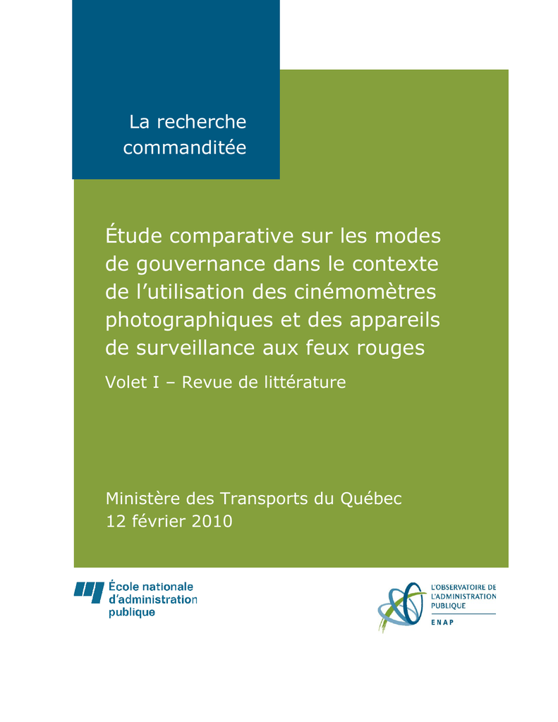 La recherche commanditée Étude comparative sur les modes de gouvernance dans le contexte de l’utilisation des cinémomètres photographiques et des appareils de surveillance aux feux rouges Volet I – Revue de littérature Ministère des Transports du Québec 12 février 2010 AVANT-PROPOS AVANT-PROPOS Le ministère des Transports du Québec (MTQ) a confié à L’Observatoire de l’administration publique de l’ENAP (L’Observatoire) le mandat d’effectuer une étude comparative portant sur les modes de gouvernance liés à l’utilisation des cinémomètres photographiques et des systèmes de contrôle de la circulation aux feux rouges et leur efficacité relative, et ce, dans plusieurs administrations de l’OCDE. L’étude a été menée en trois volets : ▪ Volet I – Réalisation d’une revue de la littérature relative à la thématique de même que certaines études de cas sommaires. L’objectif est d’établir un portrait de la situation dans plusieurs provinces canadiennes, États américains et pays de l’OCDE afin de cerner quelles seraient les administrations les plus pertinentes pour une étude détaillée; ▪ Volet II – Étude détaillée des modes de gouvernance utilisés au sein des administrations choisies; ▪ Volet III – Rapport de synthèse et d’analyse de l’ensemble des résultats. Le présent rapport fait état des résultats du Volet I de l’étude, soit la revue de littérature accompagnée de plusieurs études de cas sommaires. Les travaux ont été réalisés sous la supervision de Michelle Jacob, chef de l’équipe de recherche. La revue de littérature de même que les études de cas sommaires ont été effectuées par Estelle Mongbé, agente de recherche, ainsi que par Mathieu Carrier et Marc Demers, agents de recherche. Patricia Pelletier a procédé à la révision linguistique du rapport et Corinne Sarian en a effectué la mise en page. Pierre Cliche Administrateur invité Coordonnateur de la recherche commanditée L’Observatoire de l’administration publique – ENAP [email protected] ÉTUDE COMPARATIVE SUR LES MODES DE GOUVERNANCE DANS LE CONTEXTE DE L’UTILISATION DES CINÉMOMÈTRES PHOTOGRAPHIQUES ET DES APPAREILS DE SURVEILLANCE AUX FEUX ROUGES VOLET I – REVUE DE LITTERATURE I TABLE DES MATIÈRES TABLE DES MATIÈRES AVANT-PROPOS........................................................................................................................... I LISTE DES SIGLES ET ACRONYMES ......................................................................................... V INTRODUCTION ET APPROCHE MÉTHODOLOGIQUE ............................................................. 1 PREMIÈRE PARTIE POINT SUR L’UTILISATION DES CINÉMOMÈTRES PHOTOGRAPHIQUES ET DES CAMÉRAS AUX FEUX ROUGES ................................................................................... 7 1 DÉFINITION ............................................................................................................................ 7 2 ENJEUX .................................................................................................................................. 8 2.1 QUESTIONS D’ORDRE ETHIQUE ET JURIDIQUE ...........................................................................................8 2.1.1 2.1.2 2.2 2.3 2.4 3 QUESTIONS D’ORDRE ORGANISATIONNEL ET INSTITUTIONNEL....................................................................9 ENJEUX FINANCIERS .............................................................................................................................10 L’ACCEPTABILITE ..................................................................................................................................10 ÉVALUATION DE L’UTILISATION DES CINÉMOMÈTRES PHOTOGRAPHIQUES ET DES CAMÉRAS AUX FEUX ROUGES ................................................................................. 12 3.1 RESULTATS SUR LA SECURITE ROUTIERE ...............................................................................................12 3.1.1 3.1.2 3.2 4 Protection de la vie privée ............................................................................................ 8 Responsabilité du propriétaire ou du conducteur ......................................................... 8 Réduction de la vitesse et du nombre d’accidents ..................................................... 13 Modification du comportement des conducteurs ........................................................ 15 IMPACTS ECONOMIQUES .......................................................................................................................16 PISTES DE DÉVELOPPEMENT ........................................................................................... 18 DEUXIEME PARTIE BREF APERÇU AU SEIN DE QUELQUES ADMINISTRATIONS CANADIENNES ET ETRANGERES...................................................................................................................... 21 ALBERTA ................................................................................................................................... 31 ARIZONA .................................................................................................................................... 35 FRANCE ..................................................................................................................................... 41 NEW SOUTH WALES ................................................................................................................. 47 NORVÈGE .................................................................................................................................. 51 PAYS-BAS .................................................................................................................................. 55 ROYAUME-UNI .......................................................................................................................... 5
