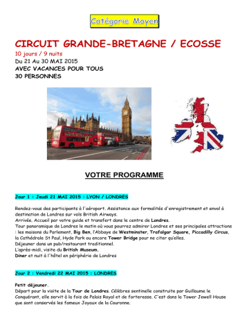 CIRCUIT GRANDE-BRETAGNE / ECOSSE 10 jours / 9 nuits Du 21 Au 30 MAI 2015 AVEC VACANCES POUR TOUS 30 PERSONNES VOTRE PROGRAMME Jour 1 : Jeudi 21 MAI 2015 : LYON / LONDRES Rendez-vous des participants à l'aéroport. Assistance aux formalités d'enregistrement et envol à destination de Londres sur vols British Airways. Arrivée. Accueil par votre guide et transfert dans le centre de Londres. Tour panoramique de Londres le matin où vous pourrez admirer Londres et ses principales attractions : les maisons du Parlement, Big Ben, l’Abbaye de Westminster, Trafalgar Square, Piccadilly Circus, la Cathédrale St Paul, Hyde Park ou encore Tower Bridge pour ne citer qu’elles. Déjeuner dans un pub/restaurant traditionnel. L’après-midi, visite du British Museum. Diner et nuit à l'hôtel en périphérie de Londres Jour 2 : Vendredi 22 MAI 2015 : LONDRES Petit déjeuner. Départ pour la visite de la Tour de Londres. Célèbres sentinelle construite par Guillaume le Conquérant, elle servit à la fois de Palais Royal et de forteresse. C'est dans la Tower Jewell House que sont conservés les fameux Joyaux de la Couronne. Déjeuner dans un pub/restaurant traditionnel. Après-midi consacrée à la visite du Victoria et Albert Muséum. Diner et nuit à l'hôtel en périphérie de Londres Jour 3 : Samedi 23 Mai 2015 : LONDRES / OXFORD / STRATFORD UPON AVON / REGION BIRMINGHAM Petit déjeuner. Départ pour la ville d'Oxford. Visite du Christ Church College, le plus réputé d’Oxford. Déjeuner dans un pub/restaurant traditionnel. L’après-midi, continuation vers Stratford-upon-Avon pour visiter la maison natale de Shakespeare. Route vers Birmingham. Diner et nuit dans les environs de Birmingham. Jour 4 : Dimanche 24 Mai 2015 : REGION BIRMINGHAM / LIVERPOOL / LAKE DISTRICT Petit déjeuner. Le matin, tour panoramique de Liverpool, la ville qui a vu naitre les Beatles. Elue capitale européenne de la culture en 2008, elle détient le plus grand nombre de musées en dehors de Londres. Déjeuner dans un pub/restaurant traditionnel. L’après-midi, route à travers le Lake District, le plus grand parc national de Grande-Bretagne. Diner et nuit dans les environs de Liverpool. Jour 5 : Lundi 25 Mai 2015 : LIVERPOOL / GLASGOW Petit déjeuner. Départ vers l'Ecosse et plus particulièrement la ville de Glasgow. Arrivée et déjeuner dans un pub/restaurant Visite de la ville pour la découverte de la plus grande ville d’Ecosse et l’un des centres financiers les plus importants d’Europe. Visite de la cathédrale de Glasgow (St Mungo). Diner et nuit dans les environs de Glasgow. Jour 6 : Mardi 26 Mai 2015 : GLASGOW / LOCH LOMOND / OBAN FORT WILLIAM Petit déjeuner. Le matin, continuation de la visite de Glasgow et avec le Lighthouse, centre de design et d’architecture. Déjeuner dans un pub/restaurant traditionnel. L’après-midi, continuation pour une croisière sur le Loch Lomond, le plus grand des lochs de Grande Bretagne au Coeur du parc national des Trossachs. Diner et nuit dans la région d’Oban/Fort Willliam Jour 7 : Mercredi 27 Mai 2015 : OBAN FORT WILLIAM / LOCH NESS / INVERNESS / AVIENMORE GRANTOWN NEWTONMORE Petit déjeuner. Aujourd’hui, immersion dans la région des Highlands. Passage le long du mystérieux Loch Ness, célèbre par son monstre légendaire. Visite du château d’Urqhardt, dont il ne reste que les vestiges suite aux nombreuses batailles qui ont marqué l'histoire des lieux. Déjeuner dans un pub/restaurant traditionnel. Continuation vers Inverness, capitale des Highlands pour un tour panoramique de la ville la plus culturelle du nord de l’Ecosse. Diner et nuit dans la région d’Aviemore/Grantown/Newtonmore Jour 8 : Jeudi 28 Mai 2015 : PERTH / ST ANDREWS / EDIMBOURG Petit déjeuner. Départ vers Perth. En chemin, visite d’une des plus anciennes distilleries d’Ecosse avec dégustation de whisky. Déjeuner dans un pub/restaurant traditionnel. Continuation vers la charmante station balnéaire St Andrews, la capitale du golf située sur la côte est. Tour panoramique et découverte de la cathédrale. Diner et nuit dans les environs d’Edimbourg. Jour 9 : Vendredi 29 Mai 2015 : EDIMBOURG Petit déjeuner. Départ pour un tour panoramique d’Edimbourg, la capitale Ecossaise. Vous y découvrirez la Vieille Ville dominée par le château et la nouvelle Ville avec ses maisons de style géorgien. Visite du château. Déjeuner 2 plats dans un pub/restaurant traditionnel. L’après-midi, visite de la Scottish National gallery. Diner et nuit dans les environs d’Edimbourg. Jour 10 : Samedi 30 Mai 2015 : EDIMBOURG / LYON Petit déjeuner. Libération des chambres à 10h00. Dépôt des bagages. En fonction des horaires aériens, transfert à l'aéroport et envol à destination de Lyon sur vols réguliers British airways (via Londres). La commission voyage vous précise que les horaires de vols indiqués peuvent être soumis à des modifications indépendantes de la volonté du voyagiste et du CE mais ne changent pas le coût pour les participants. CIRCUIT Grande-Bretagne/Ecosse Coût réel du voyage : 1489 € Coût Agent ( participation CE 60 % ) 595,60 € Acompte à verser : 297,60 € Coût Conjoint ou concubin ( participation CE 30 % ) 1042,30 € Acompte à verser : 521,30 € LE PRIX COMPREND : L’assistance Vacances Pour Tous à l’aéroport le jour du départ. Le transport aérien Lyon/Londres et Edimbourg/Lyon sur vols réguliers British Airways (via Londres pour le retour). Les transferts en autocar aéroport/hôtel/aéroport avec assistance francophone. L’hébergement durant 9 nuits en hôtels 2/3 étoiles. La pension complète, du déjeuner du jour 1 au petit déjeuner du jour 10. Le circuit en autocar de tourisme Un guide accompagnateur francophone de Londres à Liverpool et de Liverpool à Edimbourg. Les excursions et visites mentionnées au programme, droits d’entrée inclus. Les taxes et service hôtelier. Les taxes aéroportuaires : +170€ à ce jo
