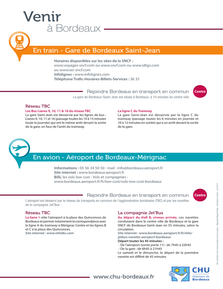 Venir à Bordeaux En train - Gare de Bordeaux Saint-Jean Horaires disponibles sur les sites de la SNCF : www.voyages-sncf.com ou www.sncf.com ou www.idtgv.com ou www.ter-sncf.com Infolignes : www.infolignes.com Téléphone Trafic-Horaires-Billets-Services : 36 35 Rejoindre Bordeaux en transport en commun La gare de Bordeaux-Saint-Jean est située à Bordeaux, à 10 minutes du centre ville Réseau TBC Les Bus Lianes 9, 10, 11 & 16 du réseau TBC La gare Saint-Jean est desservie par les lignes de bus : Lianes 9, 10, 11 et 16 (passage toutes les 10 à 15 minutes toute la journée) qui ont le même arrêt devant la sortie de la gare, en face de l’arrêt du tramway. La ligne C du Tramway La gare Saint-Jean est desservie par la ligne C du tramway (passage toutes les 6 minutes en journée et 10 à 12 minutes en soirée) qui a un arrêt devant la sortie de la gare. Informations : 05 56 34 50 50 - mail : [email protected] Site internet : www.bordeaux.aeroport.fr Billi, les vols low cost - Vols et compagnies : www.bordeaux.aeroport.fr/fr/low-cost/vols-low-cost-bordeaux Rejoindre Bordeaux en transport en commun L’aéroport est desservi par le réseau de transports en commun de l’agglomération bordelaise (TBC) et par les navettes de la compagnie Jet’Bus : Réseau TBC La compagnie Jet’Bus La liane 1 relie l’aéroport à la place des Quinconces de Bordeaux et permet notamment la correspondance avec la ligne A du tramway à Mérignac Centre et les lignes B et C à la place des Quinconces. Site internet : www.infotbc.com Au départ du Hall B, niveau arrivée, ces navettes conduisent dans le centre ville de Bordeaux et la gare SNCF de Bordeaux-Saint-Jean en 55 minutes, selon la circulation. Site internet : www.bordeaux.aeroport.fr/fr/info/ jetbus-navette-aeroport-bordeaux Départ toutes les 45 minutes : - De l’aéroport (sortie porte 11) : de 7h45 à 22h45 - De la gare : de 6h45 à 21h45 Le samedi et le dimanche, le départ de la première navette est différé de 45 minutes www.chu-bordeaux.fr © La direction de la communication et de la culture - Maquette Magali Bordier - Illustrations Fotolia - Juin 2014 En avion - Aéroport de Bordeaux-Mérignac Venir à Bordeaux En voiture 4 autoroutes : Nord : A10 depuis Paris et les régions de l’Ouest et du Nord via Poitiers, Nantes, Orléans Sud-Est : A62 depuis la Méditerranée via Toulouse, Montauban et Agen Sud-Ouest : A63 depuis l’Espagne via Bayonne et Dax Est : A89 depuis le Sud-Est et l’Est via Lyon, Clermont-Ferrand et Périgueux Plus d’informations : www.bison-fute.gouv.fr/ Parcs Relais Les parcs relais sont des aires de stationnement gardiennées, permettant aux clients du réseau TBC de garer leur véhicule pour emprunter les lignes de tram ou de bus de la CUB. Bordeaux compte 18 parcs relais. Voici les 14 principaux : 7 aux alentours de la ligne du tramway A : La Gardette, Les Lauriers, Buttinière, Galin, Stalingrad, Arlac et Quatre Chemins 4 aux alentours de la ligne de tramway B : Bougnard, Unitec, Arts & Métiers et Bradenburg, 3 aux alentours de la ligne du tramway C : Les Aubiers, Ravezies-Le Bouscat et Carle Vernet Horaires d’ouverture, tarifs et conditions d’accès : www.infotbc.com/le-reseau-tbc/parc-relais/parc-relaistout-public Pour plus d’informations L’office du tourisme de Bordeaux se situe en plein centre, à proximité de la place des Quinconces et de la rue Sainte Catherine. Ces dernières sont desservies par les lignes de tramway B et C, et de nombreux bus. Adresse : 12 Cours du 30 Juillet, 33000 Bordeaux - Tél. 05 56 00 66 00 - mail : [email protected] Site internet : www.bordeaux-tourisme.com/ www.chu-bordeaux.fr © La direction de la communication et de la culture - Maquette Magali Bordier - Illustrations Fotolia - Juin 2014 Venir en covoiturage : www.covoiturage.fr/bordeaux