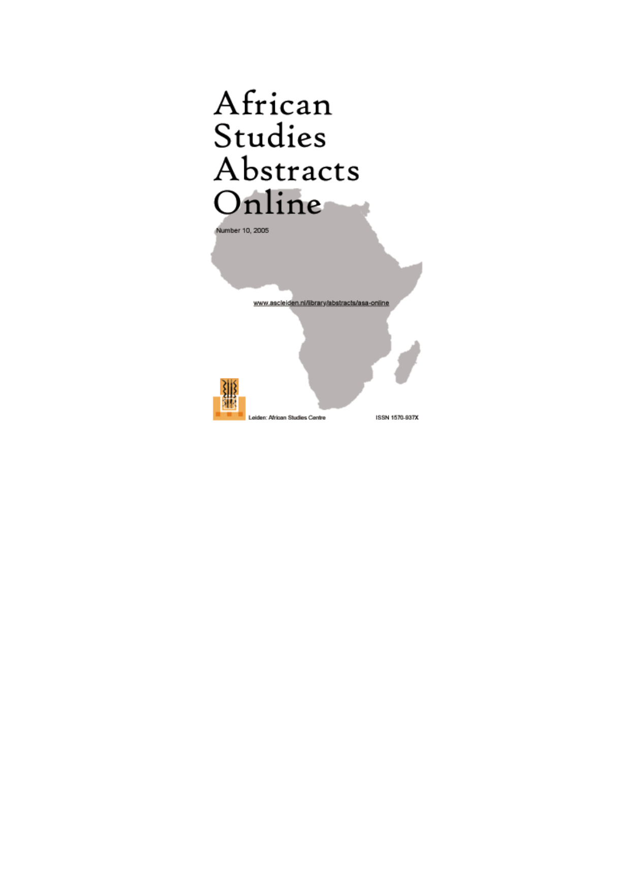 AFRICAN STUDIES ABSTRACTS ONLINE Number 10, 2005 Contents Editorial policy ............................................................................................................... iii Geographical index ....................................................................................................... 1 Subject index................................................................................................................. 4 Author index .................................................................................................................. 8 Periodicals abstracted in this issue ............................................................................... 15 Abstracts ....................................................................................................................... 19 Abstracts produced by Michèle Boin, Elvire Eijkman, Katrien Polman, Tineke Sommeling, Marlene C.A. Van Doorn ii EDITORIAL POLICY African Studies Abstracts Online provides an overview of articles from periodicals and edited works on sub-Saharan Africa in the field of the social sciences and the humanities available in the African Studies Centre library. Coverage African Studies Abstracts Online covers edited works (up to 50 in each issue) and a wide range of journals in the field of African studies. Some 240 journals are systematically scanned for abstracting or indexing. Just over half of these are English-language journals, just under a quarter are French, and most of the rest are German. A few Afrikaans, Dutch, Italian and Portuguese-language journals are also covered. Some 40 percent of all the journals are published in Africa. Newspapers and weeklies, popular magazines and current affairs bulletins, statistical digests, directories, annual reports and newsletters are, with rare exceptions, not scanned. Articles from journals published in Africa and from leading Africanist journals published outside the continent are provided with abstracts. Articles from other journals, including journals on North Africa, are catalogued and indexed without abstracts. All articles are included in the African Studies Centre Library OPAC at http://opc4-ascl.pica.nl/?DB=3/LNG=EN/ To be selected for abstracting/indexing an article must be at least two to three pages long, and have been published within the past two years (though some allowance is made for journals which have fallen behind on publication schedules or which, for whatever reason, have taken a long time to arrive). In a few specific cases, an article may be excluded on the grounds of subject. In particular, articles in the field of linguistics and those in the field of literature dealing with only one work are normally not selected. This also applies to purely descriptive articles covering current political events or economic developments, which could be expected to become quickly outdated, though this rule is applied less rigorously in the case of a country about which very little is otherwise published. Review articles and book reviews are not covered. Contents and arrangement In principle African Studies Abstracts Online is published four times a year. Each issue contains up to 450 titles with abstracts of collective volumes and journal articles. Items are iii numbered sequentially and arranged geographically according to the broad regions of Africa. There is a preliminary general section for entries whose scope extends beyond Africa, followed by a separate section for entries dealing with the continent as a whole. There is also a section for entries dealing with sub-Saharan Africa. Within the broad geographical regions of Northeast, West, West Central, East, Southeast Central and Southern Africa and the Indian Ocean islands, entries are arranged by country, and within each country, alphabetically according to author. Entries covering two countries appear twice, once under each country heading. Entries covering three or more countries are generally classified under the relevant regional heading. Each entry provides the conventional bibliographical information together with an abstract written in the language of the original document. The abstract covers the essentials of the publication in 10-20 lines. It includes a description of subject and purpose, disciplinary approach and nature of the research, and source materials (fieldwork, archives, oral traditions, etc.). Where applicable an indication of the time period, as well as specific geographical information (such as names of towns, villages or districts), as well as the names of persons, languages and ethnic groups are also included. Indexes and list of sources Each issue of African Studies Abstracts Online contains a geographical index, a subject index, and an author index, all referring to abstract number. The geographical index is at a region and country level. It refers to both abstract and page number, and for some may serve as a surrogate table of contents. The subject index is self-devised and is intended as a first and global indication of subjects. It follows roughly the main classes of the UDC, with categories for general, religion and philosophy, culture and society, politics, economics, law, education, anthropology, medical care and health services, rural and urban planning and geography, language and literature, and history and biography. Each category is further subdivided into a number of subcategories. Abstracts of items included under more than one country heading are indexed in the geographical index under each country. In the subject and author indexes they are indexed only once; the reference is always to the first time an entry appears. In addition, each issue of African Studies Abstracts Online contains a list of periodicals abstracted which provides information on title, current place of publication and ISSN of all periodicals from which articles have been selected, as well as indicating which issues of the periodical in question have been covered. A 