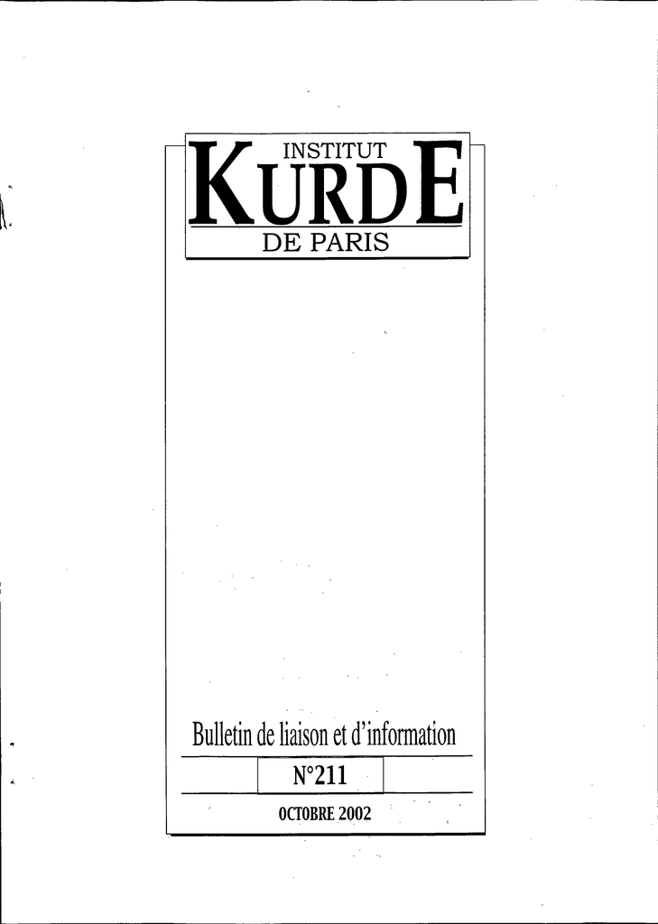 INSTITUT URD DE PARIS .. Bulletin de liaison et d'information [ W211 OCTOBRE2002 .1 ~ La publication de ce Bulletin béni.ficie de subvemions du Ministère fraTlfais des Affaires étrangères (DGClD) et du Fonds d'action et de soutien pour l'intégration et la lutte contre les discriminations (FASlW) Ce bulletin parait en français et anglais Prix au numéro: France: 6 € - Etranger: 7,5 € Abonnement annuel (12 numéros) France: 60 € - Etranger: 75 € Périodique mensuel Directeur de la publication : Mohamad HASSAN Numéro de la Commission Paritaire: 65913 A.S. ISBN 0761 1285 INSTITUT KURDE, 106, rue La Fayette - 75010 PARIS Tél. : 01- 48 24 64 64 - Fax: 01- 48 24 64 66 www.fikp.org E-mail: [email protected] I I ~ Sommaire: • .LE PARLEMENT KURDE RÉUNI EN SESSION PLÉNIÈRE RATIFIE C4CCORD DE WASHINGTON • MENACE TURC SUR LE KURDISTAN IRAKIEN .• LE SOMMET DE BRUXELLES NE FIXE PAS DE DATE À LA TURQUIE: LE PRÉSIDENT TURC CRITIQUE ET SON MINISTRE DES AFFAIRES ÉTRANGÈRES PARLE DE " RÉÉVALUER LES RELATIONS AVEC L'UE Il • LA CRISE IRAKIENNE: LES ETATS-UNIS VEULENT UN DURCISSEMENT DE LA RÉSOLUTION ONUSIENNE, LA FRANCE ET LA RUSSIE RESTENT RÉSERVEES . • NECHIRVAN BARZANI EN VISITE OFFICIELLE EN TURQUIE • AINSI QUE ... LE PARLEMENT. KURDE RÉUNI EN SESSION PLÉNIÈRE RATIFIE L:ACCORD DE WASH.INGTON E processus de réconciliation nàtionale au Kurdistan irakien est entré dans une phase décisive avec la réunion, le 4 octobre, de l'Assemblée nationale, du Kurdistan en session plénière. Cette assemblée élue en mai 1992au suffrage universel avait dû, dans la période d'affrontements interkurdes de 1994-1996, interrompre ses travaux. Depuis, en raison du boycott de la plupart des députés de l'Union patriotique du Kurdistan (UPK), elle se réunissait en formation. restreinte, avec la participation d'une soixantaine de ses 105membres. L'accord de paix signé en septembre 1998à Washington entre les leaders kurdes Massoud Barzani et Jalal Talabani, en présence de Mme Madeleine Albright, secrétaire d'Etat américaine, prévoyait la réunion plénière du Parlement pour une période intérimaire afin d'organiser de nouvelles élections et de parachever ainsi le processus de réconciliation et d'institutionnalisation démocratique. Après une longue série de réunions et des mesures de normalisation, les dirigeants des deux principaux partis kurdes, à l'approche d'importantes échéances politiques en Irak, ont finalement décidé qu'il était temps de mettre de l'ordre dans la maison kurde. -1. nlli/dlll d,' IlIlh,ll/ d ,l'I//Ill/I/IU/Il/II , 211 - , , Une 'réunion au sommet- entre du PDK, Massoud Barzani,a M. Barzani et J. Talabani avait, le 8 rappelé la gravité et l'importance septembre, permis d'aplanir les historique de cette journée, réitéré derniers obstacles et de fixer au 4 son attachement à la primauté du octobre la date de la session plénière Droit et de la Loi, souligné le rôle du Parlement du Kurdistan. Cette fondamental du Parlement comme l'unique ,lieu de légitimité date, hau~ent symbolique marque le dixième' anniversaire de la , démocratique habilitée à statuer'Sur proclamation par le Parlement du les questions de gouvernement du fédéralisme comme solution au pays. Au nom de son parti et en son . problème kurde en Irak et comme nom personnel, il a présenté des système politique pour l'Irak exeusesau peuple kurde pour les d'après-Saddam. affrontements internes de la période de 1994-1996. Si le Parlement et le Préparée aveC'minutie, la réunion peuple ne nous accordent pas le plénière du Parlement a eu lieu le 4 pardon j'adme'ts d'avance le octobre à Erbil en présence des jugement d'un tribunal impartial personnalités étrangères et kurdes sur les responsabilités des uns et des de marque et d'un grand nombre de autres dans la guerre fratricide a-t-il journalistes-des média conclu au milieu des internationaux.' Après une applaudissements des députés. allocution d'ouverture du Dr. Roj Schawesh, président du Parlement, Ensuite, c'est le secrétaire général de un message de félicitation et l'UPK, Jalal Talabani qui a pris la d'encouragement du secrétaire parole pour évoquer également d'Etat américain, Colin Powell, a été l'importance historique de cette lu. Ensuite, c'est Mme Danielle journée, la confiance enfin retrouvée Mitterrand qui s'est adressée aux entre les principales forces kurdes et députés kurdes pour les féliciter de leurs dirigeants. fi a tenu à remercier leur cohésion retrouvée et les M. Barzani de son rôle « très positif a encourager à redoubler d'efforts dans le diffiçile dialogue qui a p.our la, construction d'un avenir de permis la réconciliation. Présentant paix et de démocratie pour leur à son tour ses excuses pour la guerre peuple. « Si vous êtes unis, si vous fratricide, il a affirmé que cette page agissez en démocrates, vous aurez la noire était désormais .définitivement sympathie et le soutien de l'opinion tournée, que les Kurdes n'auraient , publique internationale a a-t-elle plus jamais recours auX armes pour ajouté, avant de saluer les progrès régler leur litiges. remarquables faits par les Kurdes dans le domaine de développement Après les interventions de deux de leur pays depuis sa visite de repréSentants dù, Haut comité de la 1992. paix, qui ont fait l'historique de leurs travaux en concluant que . Intervenant à son toUr, le président « cent années de négociations valent (lllllbll' 2(1(12 mieux qu'une journée de guerre fratricide »,' la présidence du Parlement a procédé à la cérémonie de serment des 29 suppléants qui vont remplacer les députés décédés, démissionnaires ou partis à l'étranger (28 de la liste de l'UPK et 1 du PDK). Ainsi reconstitué le Parlement compte 51 députés du PDK, 49 de l'UPK et 5 Assyrochaldéens. Au cours de cette session historique, les députés ont ratifié à l'unanimité l'accord de paix de Wa