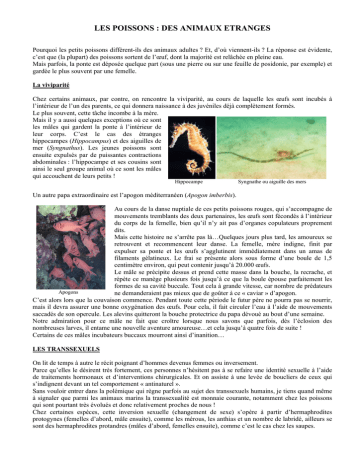 LES POISSONS : DES ANIMAUX ETRANGES Pourquoi les petits poissons diffèrent-ils des animaux adultes ? Et, d’où viennent-ils ? La réponse est évidente, c’est que (la plupart) des poissons sortent de l’œuf, dont la majorité est relâchée en pleine eau. Mais parfois, la ponte est déposée quelque part (sous une pierre ou sur une feuille de posidonie, par exemple) et gardée le plus souvent par une femelle. La viviparité Chez certains animaux, par contre, on rencontre la viviparité, au cours de laquelle les œufs sont incubés à l’intérieur de l’un des parents, ce qui donnera naissance à des juvéniles déjà complètement formés. Le plus souvent, cette tâche incombe à la mère. Mais il y a aussi quelques exceptions où ce sont les mâles qui gardent la ponte à l’intérieur de leur corps. C’est le cas des étranges hippocampes (Hippocampus) et des aiguilles de mer (Syngnathus). Les jeunes poissons sont ensuite expulsés par de puissantes contractions abdominales : l’hippocampe et ses cousins sont ainsi le seul groupe animal où ce sont les mâles qui accouchent de leurs petits ! Hippocampe Syngnathe ou aiguille des mers Un autre papa extraordinaire est l’apogon méditerranéen (Apogon imberbis). Au cours de la danse nuptiale de ces petits poissons rouges, qui s’accompagne de mouvements tremblants des deux partenaires, les œufs sont fécondés à l’intérieur du corps de la femelle, bien qu’il n’y ait pas d’organes copulateurs proprement dits. Mais cette histoire ne s’arrête pas là…Quelques jours plus tard, les amoureux se retrouvent et recommencent leur danse. La femelle, mère indigne, finit par expulser sa ponte et les œufs s’agglutinent immédiatement dans un amas de filaments gélatineux. Le frai se présente alors sous forme d’une boule de 1,5 centimètre environ, qui peut contenir jusqu’à 20.000 œufs. Le mâle se précipite dessus et prend cette masse dans la bouche, la recrache, et répète ce manège plusieurs fois jusqu’à ce que la boule épouse parfaitement les formes de sa cavité buccale. Tout cela à grande vitesse, car nombre de prédateurs Apogons ne demanderaient pas mieux que de goûter à ce « caviar » d’apogon. C’est alors lors que la couvaison commence. Pendant toute cette période le futur père ne pourra pas se nourrir, mais il devra assurer une bonne oxygénation des œufs. Pour cela, il fait circuler l’eau à l’aide de mouvements saccadés de son opercule. Les alevins quitteront la bouche protectrice du papa dévoué au bout d’une semaine. Notre admiration pour ce mâle ne fait que croître lorsque nous savons que parfois, dès l’éclosion des nombreuses larves, il entame une nouvelle aventure amoureuse…et cela jusqu’à quatre fois de suite ! Certains de ces mâles incubateurs buccaux mourront ainsi d’inanition… LES TRANSSEXUELS On lit de temps à autre le récit poignant d’hommes devenus femmes ou inversement. Parce qu’elles le désirent très fortement, ces personnes n’hésitent pas à se refaire une identité sexuelle à l’aide de traitements hormonaux et d’interventions chirurgicales. Et on assiste à une levée de boucliers de ceux qui s’indignent devant un tel comportement « antinaturel ». Sans vouloir entrer dans la polémique qui règne parfois au sujet des transsexuels humains, je tiens quand même à signaler que parmi les animaux marins la transsexualité est monnaie courante, notamment chez les poissons qui sont pourtant très évolués et donc relativement proches de nous ! Chez certaines espèces, cette inversion sexuelle (changement de sexe) s’opère à partir d’hermaphrodites protogynes (femelles d’abord, mâle ensuite), comme les mérous, les anthias et un nombre de labridé, ailleurs se sont des hermaphrodites protandres (mâles d’abord, femelles ensuite), comme c’est le cas chez les saupes. Chez la plupart des poissons, cette inversion sexuelle s’opère sous l’influence de stimulis sociaux liés à la place qu’occupe un individu au sein de la hiérarchie. Mérou Anthias Saupes HERMAPHRODITE Fils d’hermès et d’Aphrodite ,c’était un éphèbe d’une grande beauté.Un jour, alors qu’il se baignait dans une fontaine près d’Halicarnasse, la nymphe de la source, Salmacis, s’éprit de lui, l’enlaça et demanda aux dieux d’unir leurs deux corps en un seul. Cette prière fut exaucée, et quiconque venait se baigner dans cette fontaine subissait une transformation analogue. Cette conception d’une divinité double est en réalité d’origine asiatique. Chypre l’a transmise à la Grèce qui, au lieu d’accuser, en art, les différences sexuelles, s’est plu au contraire à donner à Hermaphrodite un aspect ambigu. La crépidule (Crépidula fornicata) C’est un mollusque gastéropode de nos côtes européennes. Ces animaux vivent fixés sur le rocher, les huîtres, les moules ou les cailloux. Souvent, ils forment une chaîne d’individus vivants les uns sur les autres, les gros individus de dessous étant des femelles âgées, qui se font féconder par les jeunes petits mâles vivant en bout de chaîne. Pour quelques individus au milieu, l’inversion sexuelle n’est pas encore complète. Ne pensez pas que le terme fornicata est une allusion grivoise au comportement sexuel de l’animal. «Fornicata » signifie simplement « vouté » et décrit seulement la forme de la coquille… Crépidule Il en est de même chez l’astérine pentagonale (Asterina gibbosa) petite étoile de mer commune de nos côtes, qui est mâle en début de vie, bisexuelle ensuite et enfin femelle. Lors de la reproduction, il n’est pas rare de voir plusieurs mâles entourer la femelle. Astérine pentagonale Serran Chez certaines espèces hermaphrodites synchrones les individus sont mâles et femelles à la fois. Ce sont les véritables hermaphrodites, à la fois dieu (Hermès) et déesse (Aphrodite). C’est le cas des serrans, poissons capables