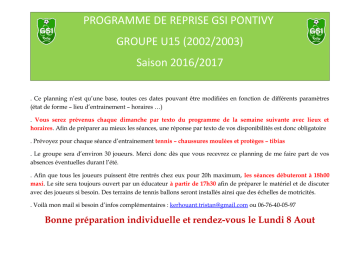 PROGRAMME DE REPRISE GSI PONTIVY GROUPE U15 (2002/2003) Saison 2016/2017 . Ce planning n’est qu’une base, toutes ces dates pouvant être modifiées en fonction de différents paramètres (état de forme – lieu d’entrainement – horaires …) . Vous serez prévenus chaque dimanche par texto du programme de la semaine suivante avec lieux et horaires. Afin de préparer au mieux les séances, une réponse par texto de vos disponibilités est donc obligatoire . Prévoyez pour chaque séance d’entrainement tennis – chaussures moulées et protèges – tibias . Le groupe sera d’environ 30 joueurs. Merci donc dès que vous recevrez ce planning de me faire part de vos absences éventuelles durant l’été. . Afin que tous les joueurs puissent être rentrés chez eux pour 20h maximum, les séances débuteront à 18h00 maxi. Le site sera toujours ouvert par un éducateur à partir de 17h30 afin de préparer le matériel et de discuter avec des joueurs si besoin. Des terrains de tennis ballons seront installés ainsi que des échelles de motricités. . Voilà mon mail si besoin d’infos complémentaires : [email protected] ou 06-76-40-05-97 Bonne préparation individuelle et rendez-vous le Lundi 8 Aout MOIS D’AOUT Pendant le Mois de JUILLET, pratiquer d’autres sports : Tennis, Natation, Beach-volley…. Essayer de pratiquer 2 fois par semaine du sport. LUNDI 08 AOUT MARDI 09 AOUT MERCREDI 10 AOUT JEUDI 11 AOUT VENDREDI 12 AOUT Entrainement 2 Toulboubou T2 18h/19h30 Entrainement 3 Toulboubou T2 18h/19h30 Opposition interne Toulboubou T2 10h/12h JEUDI 18 AOUT VENDREDI 19 AOUT Entrainement 1 Toulboubou T2 18h/19h30 Repos LUNDI 15 AOUT MARDI 16 AOUT MERCREDI 17 AOUT Entrainement 4 Toulboubou T2 18h/19h30 Entrainement 5 Toulboubou T2 18h/19h30 Entrainement 6 Toulboubou T2 18h/19h30 LUNDI 22 AOUT MARDI 23 AOUT MERCREDI 24 AOUT JEUDI 25 AOUT Entrainement 9 Toulboubou T2 18h/19h30 Entrainement 10 Toulboubou T2 18h/19h30 JEUDI 1er SEPTEMBRE Entrainement 8 Toulboubou T2 18h/19h30 Repos LUNDI 29 AOUT MARDI 30 AOUT MERCREDI 31 AOUT Entrainement 11 Toulboubou T2 17h30/19h00 Entrainement 12 Toulboubou T2 17h30/19h00 Match Amical A et B contre la ST CO Repos Repos Entrainement 7 Toulboubou T2 18h/19h30 VENDREDI 26 AOUT Repos VENDREDI 02 SEPTEMBRE Entrainement 14 Toulboubou T2 17h30/19h00 SAMEDI 13 AOUT DIMANCHE 14 AOUT Repos Repos SAMEDI 20 AOUT DIMANCHE 21 AOUT Match Amical A et B La montagne A Repos SAMEDI 27 AOUT DIMANCHE 28 AOUT Tournoi à CARHAIX A et B SAMEDI 03 SEPTEMBRE Repos Repos DIMANCHE 04 SEPTEMBRE Repos