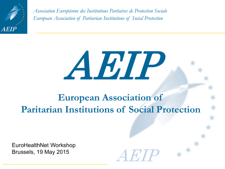 Association Européenne des Institutions Paritaires de Protection Sociale European Association of Paritarian Institutions of Social Protection AEIP European Association of Paritarian Institutions of Social Protection EuroHealthNet Workshop Brussels, 19 May 2015 Association Européenne des Institutions Paritaires de Protection Sociale European Association of Paritarian Institutions of Social Protection 1.Who we are? 2.Healthy Mind at work: why do we care? 3.What do we call for? 4. How do we commit? Association Européenne des Institutions Paritaires de Protection Sociale European Association of Paritarian Institutions of Social Protection Who we are? A paritarian institution: Association Européenne des Institutions Paritaires de Protection Sociale European Association of Paritarian Institutions of Social Protection MANAGEMENT BOARD Equal (parity in) number of employers’ and unions representatives from “parity”- “Paritarian” ) Collective agreement setting up the social institution (and pension plan) Employers Trade Unions Associations Employers Employees Association Européenne des Institutions Paritaires de Protection Sociale European Association of Paritarian Institutions of Social Protection Association Européenne des Institutions Paritaires de Protection Sociale European Association of Paritarian Institutions of Social Protection AEIP General Overview Social Protection Coordinated Retirement Schemes Pension funds Health & Provident Benefits Health & Safety Paid Holiday Schemes Unemployment Funds Our Values Solidarity Transparency Paritarian Management (employees et employers) Mission Promoting the Paritarian Model Monitoring European activities Representing & defending the interest of AEIP to the EU Institutions (Lobbying) Promoting cooperation between members Defending the interest of the members at the European level Promoting the exchange information and experience Association Européenne des Institutions Paritaires de Protection Sociale European Association of Paritarian Institutions of Social Protection Healthy mind at work: why do we care? Association Européenne des Institutions Paritaires de Protection Sociale European Association of Paritarian Institutions of Social Protection ANNUAL DIRECT COSTS (work-related) EMPLOYERS (absenteeism and presenteeism) ECONOMY (lost output) HEATHCARE SYSTEMS(treatment) SOCIAL WELFARE (disability benefit payments) €610 billion € 270 billion € 240 billion € 60 billion € 40 billion Costs of mental disorders as a percentage of the country’s GDP, 2010 Source: OECD (2015 Fit Mind, Fit Job) Association Européenne des Institutions Paritaires de Protection Sociale European Association of Paritarian Institutions of Social Protection • There is no inclusive Europe and sustainable Social Protection when mental health and wellbeing are not prioritised • The impact of mental ill health could be reduced Association Européenne des Institutions Paritaires de Protection Sociale European Association of Paritarian Institutions of Social Protection Benefits of positive well-being to employers, employees, and the government Association Européenne des Institutions Paritaires de Protection Sociale European Association of Paritarian Institutions of Social Protection Benefits of positive wellbeing include: • • • • • Improved employer-employee dialogue Encouraging creativity and innovation Reduced absenteeism Better workplace performance Organisation Performance Association Européenne des Institutions Paritaires de Protection Sociale European Association of Paritarian Institutions of Social Protection “ Good working conditions and prevention of mental health disorders contribute to a healthy workforce, which contributes to sustainable Social Protection and strengthen social cohesion across Member States.” AEIP – AIM Joint Position on Mental Health and Well-Being Promotion Association Européenne des Institutions Paritaires de Protection Sociale European Association of Paritarian Institutions of Social Protection What do we call for? • Stronger commitment to raise awareness on mental health related issues • Strengthen prevention and well-being promotion at work places • Comprehensive and coordinated policies both at EU and national level to implement the active inclusion of people suffering from mental disorders • Access to quality mental health care • Exchange of evidence- and practice -based experiences Association Européenne des Institutions Paritaires de Protection Sociale European Association of Paritarian Institutions of Social Protection What do we do? • AEIP is an Official Partner of the EU-OSHA Campaigns (20142015 « Healthy Workplaces Manage Stress ») • AEIP members actively involved in projects for prevention of psychosocial risks at the workplace • Annual Conference in Venice (2014 Psycho-Social Risks Workshop in partnership with the EU-OSHA) • AEIP-AIM Joint Position « Mental Health Promotion and Well-Being » adopted in May 2015 • Knowledge dissemination through conferences, seminars, and working groups • Active Member of the European Alliance on Mental Health in All Policies (kick off event September 2015) Association Européenne des Institutions Paritaires de Protection Sociale European Association of Paritarian Institutions of Social Protection « Mental Health is not just the absence of illness. » [email protected] www.aeip.net