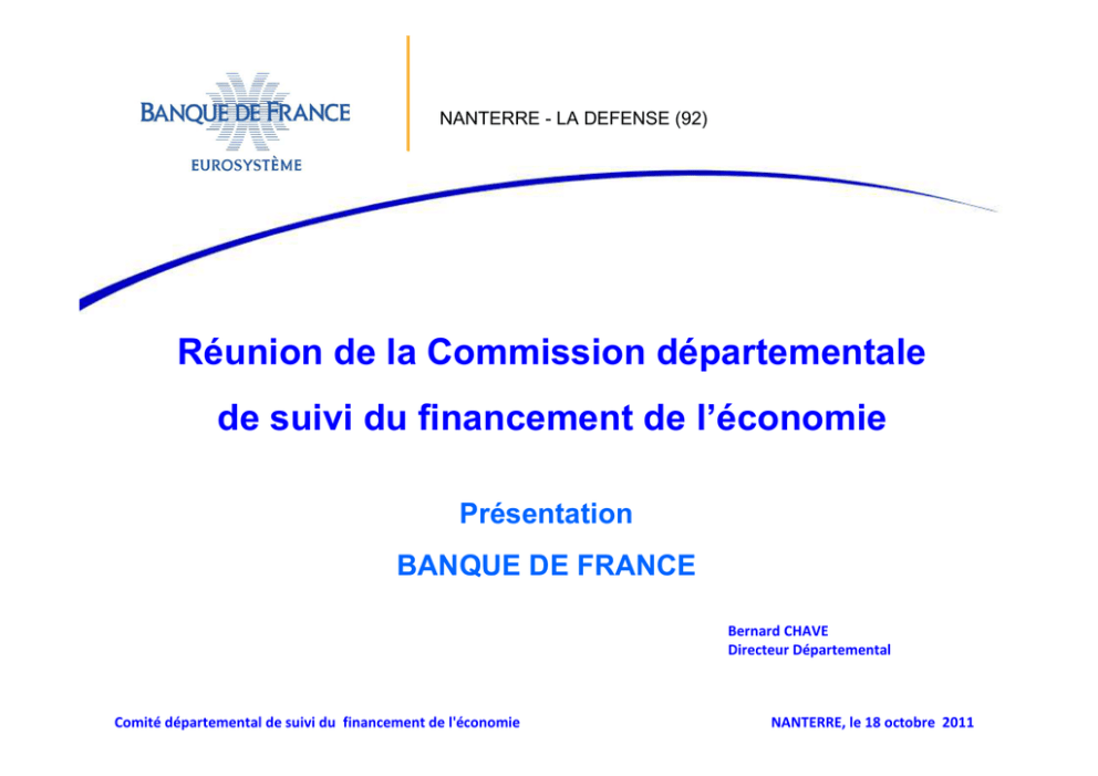 NANTERRE - LA DEFENSE (92) Réunion de la Commission départementale de suivi du financement de l’économie Présentation BANQUE DE FRANCE Bernard CHAVE Directeur Départemental Comité départemental de suivi du financement de l'économie NANTERRE, le 18 octobre 2011 1. La situation économique en Île de France Industrie : évolution de la production (fin septembre 2011) En septembre, la production industrielle francilienne a de nouveau ralenti sa progression. En recul dans le secteur des équipements électriques et électroniques, elle a retrouvé une orientation positive dans le matériel de transport. Les effectifs se sont globalement maintenus. Les industriels envisagent à court terme de nouvelles mises en production à la faveur du carnet de commandes toujours bien garni. Comité départemental de suivi du financement de l'économie NANTERRE, le 18 octobre 2011 2 1. La situation économique en Île de France Industrie : carnets et capacités de production (fin 09/2011) 09/2011) La demande globale s’est révélée particulièrement ferme notamment dans sa composante étrangère. L’état des carnets de commandes est globalement estimé satisfaisant. Les stocks de produits finis sont dans l’ensemble jugés adaptés à la production. Les prix des matières premières sont demeurés inchangés à l’exception du secteur de la fabrication des denrées alimentaires où un renchérissement des cours est observé. Le taux d’utilisation des capacités de production s’est légèrement amélioré, se situant néanmoins toujours en deçà de sa moyenne de longue période. Comité départemental de suivi du financement de l'économie NANTERRE, le 18 octobre 2011 3 1. La situation économique en Île de France Services : évolution de l’activité (fin septembre 2011) En septembre, l’activité a été légèrement mieux orientée : hausses dans les secteurs de la location automobile, du conseil en publicité et de la réparation automobile ne compensant pas le ralentissement observé dans les secteurs du transport routier de marchandises et de l’ingénierie informatique. Les prix sont restés stables, sauf dans le secteur de la location automobile où des concessions tarifaires ont été pratiquées. Les effectifs se sont renforcés, notamment dans les secteurs de l’ingénierie informatique et du nettoyage. Les prévisions d’activité marquent un léger fléchissement à court terme. Comité départemental de suivi du financement de l'économie NANTERRE, le 18 octobre 2011 4 2. La centralisation des risques - nature Hauts de Seine – Situation à fin août 2011 ENCOURS en M. € août 2011 juin 2011 déc 2010 juin 2010 déc 2009 Crédits mobilisés 75 796 75 392 75 876 79 323 80 659 Crédits mobilisables 61 347 59 147 55 828 56 003 56 255 Crédits 137 143 134 539 131 705 135 326 136 915 glissements annuels Crédits mobilisés -3,2% -5,0% -5,9% Crédits mobilisables 0,0% -17,7% -0,8% Crédits 0,0% 1,3% -3,8% Comité départemental de suivi du financement de l'économie NANTERRE, le 18 octobre 2011 5 2. La centralisation des risques - taille Hauts de Seine – Situation à fin août 2011 Encours de Crédits mobilisés (dont court terme) Variation annuelle dont court terme Août 2010 Août 2011 Août 2010 Mobilisés 39 552 37 385 8 869 8 373 5,8% 5,9% GE + Holdings 127 646 130 067 24 120 22 166 -1,9% 8,8% Activités im m obilières 119 038 113 463 6 629 6 887 4,9% -3,7% 286 236 280 915 39 619 37 426 1,9% 5,9% 130 667 135 435 79 996 84 971 -3,5% -5,9% Total 416 903 416 350 119 614 122 397 0,1% -2,3% TPE + PME 5 638 5 263 1 239 1 193 7,1% 3,8% GE + Holdings 42 408 44 459 6 609 6 415 -4,6% 3,0% Activités im m obilières 17 194 15 818 1 201 1 288 8,7% -6,7% 65 240 65 540 9 049 8 896 -0,5% 1,7% 10 557 12 728 2 779 4 938 -17,1% -43,7% 75 797 78 268 11 828 13 834 -3,2% -14,5% Sous-Total Activités financières et adm . 92 Hauts de Seine Mobilisés Août 2011 TPE + PME Région Ile de France Montants en millions d'euros Sous-Total Activités financières et adm . Total Court term e Progression de la distribution du crédit aux TPE et PME du département supérieure à l’évolution observée au niveau régional (7.1 % vs 5,8 %). Comité départemental de suivi du financement de l'économie NANTERRE, le 18 octobre 2011 6 3. La médiation du crédit Hauts de Seine – Situation à fin septembre 2011 MEDIATION DU CREDIT Dossiers reçus France Ile de HdS France 92 32 232 5 074 614 Dossiers acceptés éligibilité en % 26 361 81,8% 4 294 84,6% 540 87,9% Dossiers instruits instruction en % 23 496 3 769 491 Dossiers cloturés positivement issue positive en % Dossiers en instance 89,1% 14 711 62,6% 563 87,8% 2 263 60,0% 94 90,9% 320 65,2% 7 La part du département est stable (12 % de la région) ; mais l’érosion des saisies se poursuit (6 en septembre et 71 dans l’année) Comité départemental de suivi du financement de l'économie NANTERRE, le 18 octobre 2011 7 3. La médiation du crédit Hauts de Seine – Situation à fin septembre 2011 MEDIATION DU CREDIT Principales difficultés - difficultés bancaires Répartition des effectifs - Inférieurs à 11 personnes - Inférieurs à 51 personnes Répartition par encours - Inférieurs à 50 K € - Supérieurs à 500 K € Répartition par encours - Commerce - BTP - Services - Industrie Ile de HdS France 92 77,1% 76,9% 84,5% 81,1% 96,1% 78,3% 95,4% 76,4% 93,8% 58,6% 6,3% 55,0% 7,8% 51,8% 10,9% 27,0% 37,9% 18,0% 12,9% 27,4% 51,0% 11,6% 9,7% 25,8% 58,3% 8,5% 7,5% France La typologie départementale conserve sa spécificité (taille intermédiaire des entreprises / secteur des services sur représenté / encours de crédits plus élevés) mais les nouvelles saisines sont plus proches de la moyenne nationale (TPE). Comité départemental de suivi du financement de l'économie NANTERRE, le 18 octobre 2011 8 4. Le surendettement Hauts de Seine // Île de France à fin septembre 2011 SURENDETTEMENT France Ile de HdS France 92 Dossiers dépos