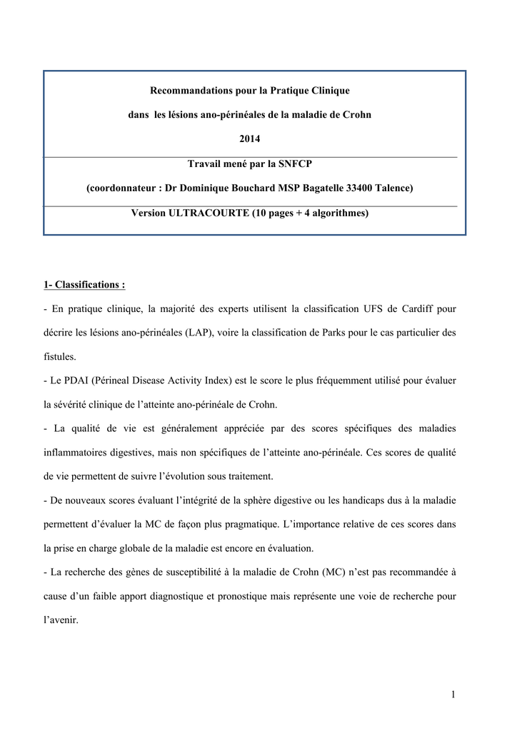 Recommandations pour la Pratique Clinique dans les lésions ano-périnéales de la maladie de Crohn 2014 Travail mené par la SNFCP (coordonnateur : Dr Dominique Bouchard MSP Bagatelle 33400 Talence) Version ULTRACOURTE (10 pages + 4 algorithmes) 1- Classifications : - En pratique clinique, la majorité des experts utilisent la classification UFS de Cardiff pour décrire les lésions ano-périnéales (LAP), voire la classification de Parks pour le cas particulier des fistules. - Le PDAI (Périneal Disease Activity Index) est le score le plus fréquemment utilisé pour évaluer la sévérité clinique de l’atteinte ano-périnéale de Crohn. - La qualité de vie est généralement appréciée par des scores spécifiques des maladies inflammatoires digestives, mais non spécifiques de l’atteinte ano-périnéale. Ces scores de qualité de vie permettent de suivre l’évolution sous traitement. - De nouveaux scores évaluant l’intégrité de la sphère digestive ou les handicaps dus à la maladie permettent d’évaluer la MC de façon plus pragmatique. L’importance relative de ces scores dans la prise en charge globale de la maladie est encore en évaluation. - La recherche des gènes de susceptibilité à la maladie de Crohn (MC) n’est pas recommandée à cause d’un faible apport diagnostique et pronostique mais représente une voie de recherche pour l’avenir. 1 2- Explorations radiologiques : - L’exploration radiologique est recommandée pour les lésions secondaires complexes notamment en cas d’échec de précédents traitements chirurgicaux et/ou médicaux (grade B). - L’exploration radiologique peut être recommandée aussi pour les lésions secondaires simples, du fait des implications pronostiques et thérapeutiques (grade B). - En cas de recours à l’imagerie, l’IRM doit être l’examen de première intention (grade B). - L’association à un examen sous anesthésie générale pourrait améliorer la précision de cet examen (grade B). - L’intérêt pronostique de l’imagerie, notamment de l’IRM, dans l’évaluation thérapeutique et son impact sur la prise en charge des patients est encore à définir (grade B). - L’écho-endo-anale réalisée de préférence en 3D, éventuellement associée à l’injection d’eau oxygénée, pourrait être équivalente à l’IRM (grade B). - L’inaccessibilité ou une contre-indication à l’IRM et à l’EEAR impose un examen sous AG (grade C). - La tomodensitométrie et la fistulographie n’ont plus de place dans cette indication (respectivement, grade B et grade C). 3- Prise en charge des lésions anales primaires (ulcérations anales de la maladie de Crohn = UAC) : Cf algorithme 1. - Un traitement médical maximum avec des anti-TNF d’emblée est recommandé en cas d’ulcérations anales sévères liées à la maladie de Crohn, en raison de leur risque de complications (grade C). - L’infliximab est un traitement de choix des UAC en induction et en entretien, de préférence en association avec les thiopurines (grade C). 2 - L’efficacité de l’adalimumab n’est pas spécifiquement documentée pour les UAC, mais elle pourrait être similaire à l’infliximab (AP). - Si l’UAC est superficielle, unique, peu étendue et sans rectite associée, une surveillance rapprochée est recommandée, parfois associée à un traitement par thiopurine (AP). - Ces traitements immunosuppresseurs utilisés seuls n’ont pas fait la preuve de leur efficacité dans le traitement des UAC, même s’ils pourraient en diminuer la fréquence de survenue (AP). - Le seul traitement chirurgical recommandé en cas d’ulcération anale crohnienne est le drainage d’une suppuration ano-rectale, abcès ou fistule complexe associée. - Il doit être réalisé avant d’initier un traitement immunosuppresseur, et en particulier avant la mise en route d'un anti-TNF (grade B). En raison des risques pour la continence anale, il est recommandé de ne pas réaliser de sphinctérotomie dans un contexte de maladie de Crohn avérée (AP). En cas d’échec du traitement médical sur des UAC très symptomatiques et invalidantes, une dérivation digestive d’amont ou une protectomie peuvent être discutées (AP). 4- Prise en charge d’une fistule anale simple : 4a- Bilan : - Une fistule est décrite selon la classification UFS et son trajet selon la classification de Parks. - Une fistule simple est définie selon la classification de l’AGA. - L’évaluation du retentissement repose sur des scores de symptômes (PDAI, Allan), au mieux couplés avec un score de qualité de vie spécifique des maladies inflammatoires. - L’IRM doit faire partie du bilan de départ sauf en cas de malade facile à examiner et lorsqu’il n’existe aucun doute sur l’éventuelle complexité du trajet ou la présence de collections (grade B). 4b- Traitement : 3 - Il est essentiel d’assurer le contrôle d’une éventuelle atteinte luminale quelle que soit l’option retenue pour traiter la fistule anale (AP). - En cas d’abcès, leur drainage et la mise sur seton de la fistule sont un préalable à toute prise en charge, sauf en cas de fistule sans abcès, sèche et non productive (grade B). - La prise en charge des fistules complexes de la MC repose sur un traitement médico-chirurgical (grade B). - Volet médical : o On peut recommander le recours temporaire à un traitement par ciprofloxacine en cas de fistule anale inflammatoire pendant les premières semaines du traitement d’induction par une biothérapie (grade B). Ce traitement antibiotique ne doit pas se substituer au drainage chirurgical. o En cas de fistule anale simple symptomatique et/ou inflammatoire à l’IRM, l'utilisation de l’azathioprine (AZA) se justifie par son efficacité modérée à fermer des fistules (grade B), mais surtout à diminuer le risque d'apparition de lésion et de chirurgie (grade C). o En cas de fistule anale simple symptomatique et/ou inflammatoire à l’I