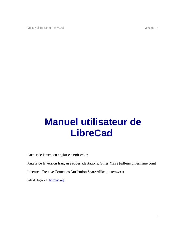 Manuel d'utilisation LibreCad Version 1.6 Manuel utilisateur de LibreCad Auteur de la version anglaise : Bob Woltz Auteur de la version française et des adaptations: Gilles Maire [[email protected]] License : Creative Commons Attribution Share Alike (CC BY-SA 3.0) Site du logiciel : librecad.org 1 Manuel d'utilisation LibreCad Version 1.6 Table des matières Chapitre I - Introduction......................................................................................................5 I.1 - Notes de l'auteur...........................................................................................................5 I.2 - Notes du traducteur......................................................................................................5 I.3 - Pourquoi un logiciel de CAO ?....................................................................................6 Chapitre II - Avant Propos...................................................................................................8 Chapitre III - Réglages du logiciel ....................................................................................10 III.1 - Préférences générales..............................................................................................10 III.2 - Préférences du dessin courant..................................................................................11 Chapitre IV - Tracer des lignes avec Librecad...................................................................13 2 Manuel d'utilisation LibreCad Version 1.6 IV.1 - Les lignes ................................................................................................................13 IV.2 - Les rectangles..........................................................................................................16 IV.3 - Les cercles................................................................................................................16 IV.4 - Les courbes (splines)...............................................................................................18 A - Présentation .................................................................................................................18 B - Utilisation ....................................................................................................................18 IV.5 - Les icônes................................................................................................................21 IV.6 - Déplacement d'une ligne..........................................................................................22 IV.7 - Modification des propriétés de ligne.......................................................................23 Chapitre V - Cotations et textes.........................................................................................25 V.1 - Cotations...................................................................................................................26 V.2 - Dessiner une ligne de repère.....................................................................................29 V.3 - Ajout de texte à un dessin..........................................................................................30 Chapitre VI - Les calques..................................................................................................33 Chapitre VII - Utilisation de la zone ligne de commandes................................................37 Chapitre VIII - Panoramique et zoom................................................................................40 Chapitre IX - Icone d'information......................................................................................42 Chapitre X - La grille isométrique ....................................................................................43 X.1 - Modification de la ligne............................................................................................47 X.2 - En utilisant le compensateur.....................................................................................49 3 Manuel d'utilisation LibreCad Version 1.6 X.3 - Création de lignes parallèles.....................................................................................50 X.4 - Connexion des coins ................................................................................................52 X.5 - Rallonger la ligne......................................................................................................54 X.6 - Création d'un rayon dans un coin.............................................................................57 X.7 - Cotation d'une partie isométrique.............................................................................62 Chapitre XI - Auto évaluation............................................................................................65 XI.1 - Titre de block...........................................................................................................68 XI.2 - Projection View.......................................................................................................70 Chapitre XII - Copier coller des objets..............................................................................71 Chapitre XIII - Les icônes de modification.......................................................................73 Chapitre XIV - Suivi des versions.....................................................................................80 A - Version 1.0 ..................................................................................................................80 B - Version 1.1...................................................................................................................80 C - Version 1.2...................................................................................................................80 D - Version 1.3...................................................................................................................80 E - Version