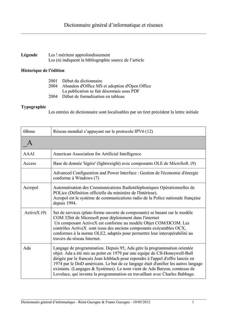 Dictionnaire général d’informatique et réseaux Légende Les ! méritent approfondissement Les (n) indiquent la bibliographie source de l’article Historique de l'édition 2001 2004 2004 Début du dictionnaire Abandon d'Office MS et adoption d'Open Office La publication se fait désormais sous PDF Début de formalisation en tableau Typographie Les entrées de dictionnaire sont localisables par un tiret précédent la lettre initiale 6Bone Réseau mondial s’appuyant sur le protocole IPV6 (12) _A AAAI American Association for Artificial Intelligence Access Base de donnée 'légère' (lightweight) avec composants OLE de MicroSoft. (9) Advanced Configuration and Power Interface : Gestion de l'économie d'énergie conforme à Windows (7) Acropol Automatisation des Communications Radiotéléphoniques Opérationnelles de POLice (Définition officielle du ministère de l'Intérieur). Acropol est le système de communications radio de la Police nationale française depuis 1994. ActiveX (9) Set de services (plate-forme ouverte de composants) se basant sur le modèle COM 32bit de Microsoft pour déploiement dans l'internet Un composant ActiveX est conforme au modèle Objet COM/DCOM. Les contrôles ActiveX sont issus des anciens composants exécutables OCX, conformes à la norme OLE2, adaptés pour permettre leur interopérabilité au travers du réseau Internet. Ada Langage de programmation. Depuis 95, Ada gère la programmation orientée objet. Ada a été mis au point en 1979 par une equipe de CII-Honeywell-Bull dirigée par le francais Jean Ichblach pour repondre à l'appel d'offre lancée en 1974 par le DoD américain. Le but de ce langage était d'unifier les autres langage existants. (Langages & Systèmes). Le nom vient de Ada Baryon, comtesse de Lovelace, qui inventa la programmation en travaillant avec Charles Babbage. Dictionnaire général d’informatique - Rémi Gacogne & Frantz Gacogne - 10/05/2012 1 Dictionnaire général d’informatique et réseaux Ad-Hoc ou Adhoc (réseeau) Terminologie employée pour désigner une connexion directe entre ordinateurs. Cela s'applique au Wifi (802.11x). ADO Active data Object modèle d’accès aux données proposé par Microsoft s’appuyant sur des composants ActiveX. (5) ADSL Asymetric Digital Subscriber Line, déclinaison de DSL. Liaison d’abonné numérique et asymétrique. Système poussé sur le marché par les opérateurs de téléphone qui vise à exploiter les paires torsadées (fils téléphonqiues classiques) à des vitesses supérieures à celles que la bande passante autorise en théorie. En théorie le débit est en voie descendante de 1.5 à 8Mbits/s et en voie montante de 16 à 640 Kbits/s. le débit dépend de la distance entre le modem ADSL et le DSLAM (équipement ADSL côté central téléphonique) qui ne peut être supérieure à 6Km. Le débit diminue en fonction de la distance comme suit (pour la voie descendante) :3 Km : 8Mbits/s 4 Km : 6Mbit/s 5 Km : 2Mbit/s 6 Km : 1Mbit/s L’ADSL utilise des techniques de codage numérique pour permettre de créer une connexion à haut débit sur une ligne téléphonique classique, tout en conservant les services téléphoniques habituels. Cela est rendu possible par l’utilisation de fréquences différentes de celles exploitées par les services téléphoniques habituels. (source MultiTech Février 2001) AFUL Association francophone des utilisateurs de Linux et des logiciels libres AGL Atelier de génie Logiciel. AGP Accelerated Graphic Port. Spécifications Intel présentées en 1996 et qui permettent d’augmenter la débit de données vers un périphérique d’affichage. L’architecture PCI (32 bits) cadencé à 133 Mhz permet un débit maximal de 16 Mo/s. Le bus AGP permet un débit de 66 Mhz. L’une des méthodes consiste à utiliser le front montant et le front descendant d’horloge pour transmettre les données sur le bus. D’autres méthodes de gestion de mémoire complète l’AGP et permettent d’atteindre des vitesses d’affichage compatibles avec des applications 3D sur des ordinateurs de puissance modeste. AIFF Format de stockage de fichier son (sur Mac) Algol (ALGOrithmic Language) Langage de programmation. Langage scientifique datant es années 1950. La première formalisation est ALGOL 58. Anticrénelage Fonction logicielle permettant de lisser les contours d'une image bitmap ainsi que . Antialiasing les zones de transitions entre couleurs. Dictionnaire général d’informatique - Rémi Gacogne & Frantz Gacogne - 10/05/2012 2 Dictionnaire général d’informatique et réseaux Apache Serveur Web (HTTP). Apache gère actuellement environ la moitié des sites Internet. API Application Programming Interface. Bibliothèque de fonctions indépendantes permettant d’utiliser les routines d’un logiciel à partir d’un langage de programmation compatible avec les API. Windows fournit par exemple des API (sous forme de DLL) que l’on peut appeler en C ou en Pascal. Applet En français “appliquette”. Une applet est une portion de code JAVA résidant sur un serveur et apte à être téléchargée sur un navigateur Web doté d’une machine virtuelle JAVA APM Advanced Power Management. Gestion avancée de l’énergie : fonctionnalité utilisée par quelques BIOS pour faire entrer la machine dans un état d'attente après une période d'inactivité donnée. Sur les ordinateurs portables, l'APM est aussi chargé de reporter le statut de la batterie et, si l'ordinateur le permet, la "durée de vie" restante estimée. Apple Corp. (USA). Macintosh et MacOS Appliance Nom ou qualificatif donné à tout système vendu comme “prêt à l’emploi”. Par extension s’applique à un ensemble matériel logiciel bridé pour un usage particulier. ARIBA Inventeur du principe de MarketPlace (voir ce terme) ARM Marque de processeur qui équipent les Pocket Compaq. Le iPaq est équipé d’un StrongArm cadencé à 206 Mhz (décembre 2000). En septembre 2001 il est quest