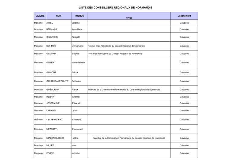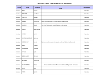 LISTE DES CONSEILLERS REGIONAUX DE NORMANDIE CIVILITE NOM PRENOM Département TITRE Madame AMIEL Caroline Calvados Monsieur BERNARD Jean-Marie Calvados Monsieur CHAUVOIS Raphaël Calvados Madame DORMOY Emmanuelle 13ème Vice-Présidente du Conseil Régional de Normandie Calvados Madame GAUGAIN Sophie 1ère Vice-Présidente du Conseil Régional de Normandie Calvados Madame GOBERT Marie-Jeanne Calvados Monsieur GOMONT Patrick Calvados Madame GOURNEY-LECONTE Catherine Calvados Monsieur GUÉGUÉNIAT Franck Madame HENRY Chantal Calvados Madame JOSSEAUME Elisabeth Calvados Madame LAHALLE Lynda Calvados Madame LECHEVALIER Christelle Calvados Monsieur MEZERAY Emmanuel Calvados Madame MIALON-BURGAT Hélène Monsieur MILLET Marc Calvados Madame PORTE Nathalie Calvados Membre de la Commission Permanente du Conseil Régional de Normandie Membre de la Commission Permanente du Conseil Régional de Normandie Calvados Calvados CIVILITE NOM PRENOM Département TITRE Monsieur ROY Jean-Philippe Calvados Monsieur THOMAS Rodolphe Monsieur TOUGARD Serge Calvados Monsieur VERGY Didier Calvados Madame BEAUVILLARD Karêne Eure Monsieur CAMOIN Emmanuel Eure Madame CHEVALIER Marie-Noëlle Eure Madame DELACOUR Fabienne Eure Monsieur HOUSSIN Timothée Monsieur JAMET Marc-Antoine Eure Madame LAMARRE Nathalie Eure Monsieur LEFRAND Guy Madame MAMMERI Mélanie Madame MARTEAU Anne-Laure Monsieur MAUREY Hervé Membre de la Commission Permanente du Conseil Régional de Normandie Eure Monsieur MORIN Hervé Président de la Région Normandie Eure Monsieur OUZILLEAU François Eure Madame PIEL Alexandra Eure 4ème Vice-Président du Conseil Régional de Normandie Membre de la Commission Permanente du Conseil Régional de Normandie Calvados Eure 8ème Vice-Président du Conseil Régional de Normandie Eure Membre de la Commission Permanente du Conseil Régional de Normandie Eure Eure CIVILITE NOM PRENOM Département TITRE Monsieur PRIOLLAUD François-Xavier 14ème Vice-Président du Conseil Régional de Normandie Madame ROUVEIX Michèle Eure Madame SANCHEZ Laëtitia Eure Monsieur VEYRI Timour Eure Monsieur ARRIVE Benoit Manche Madame COUSIN Anne-Marie Monsieur COUSIN Jean-Manuel Manche Madame JOZEAU-MARIGNE Muriel Manche Madame KURDZIEL Marie-Françoise Membre de la Commission Permanente du Conseil Régional de Normandie Manche Madame LAUNOY Claudie Membre de la Commission Permanente du Conseil Régional de Normandie Manche Monsieur LEFEVRE Hubert Monsieur MARGUERITTE David Monsieur MARIE Pascal Madame MAZIER Florence Membre de la Commission Permanente du Conseil Régional de Normandie Manche Monsieur NOËL Jean-Jacques Membre de la Commission Permanente du Conseil Régional de Normandie Manche Monsieur RETOUT Robert Madame ROUSSEAU Claire Monsieur TRAVERT Stéphane 7ème Vice-Présidente du Conseil Régional de Normandie Eure Manche Manche 2ème Vice-Président du Conseil Régional de Normandie Manche Manche Manche 15ème Vice-Présidente du Conseil Régional de Normandie Manche Manche CIVILITE NOM PRENOM Département TITRE Monsieur VOGT Pierre Manche Madame VULVERT Christiane Manche Monsieur ASSIER Ludovic Monsieur BEAUVAIS Laurent Membre de la Commission Permanente du Conseil Régional de Normandie Orne Monsieur DENIAUD Bertrand 6ème Vice-Président du Conseil Régional de Normandie Orne Madame LAVANRY Francine Orne Monsieur MARTING Laurent Orne Madame MEUNIER Catherine Orne Madame PIOLINE Gaëlle Orne Monsieur STIEFEL Lionel Orne Madame YVARD Séverine Orne Monsieur BAY Nicolas Seine-Maritime Monsieur BLOC Jean-François Seine-Maritime Madame BRULIN Céline Madame CHERRIERE Malika Seine-Maritime Monsieur de LAMAZE Edouard Seine-Maritime Monsieur DEJEAN DE LA BATIE Hubert Orne Membre de la Commission Permanente du Conseil Régional de Normandie 12ème Vice-Président du Conseil Régional de Normandie Seine-Maritime Seine-Maritime CIVILITE NOM PRENOM Département TITRE Monsieur DEMAZURE Julien Seine-Maritime Madame DUCHAUSSOY Françoise Monsieur DULIÈRE Thierry Seine-Maritime Madame EGLOFF Valérie Seine-Maritime Madame EUDIER Clotilde Monsieur FOUCHE-SAILLENFEST Philippe Monsieur GAILLARD Jacques Madame GARRAUD Valérie Monsieur GASTINNE Jean-Baptiste 10ème Vice-Président du Conseil Régional de Normandie Seine-Maritime Madame GILBERT-JEANNIN Isabelle Membre de la Commission Permanente du Conseil Régional de Normandie Seine-Maritime Madame GRELIER Estelle Madame GUÉGOT Françoise 3ème Vice-Présidente du Conseil Régional de Normandie Seine-Maritime Madame GUGUIN Marie-Françoise 9ème Vice-Présidente du Conseil Régional de Normandie Seine-Maritime Monsieur HOUBRON Pascal Seine-Maritime Monsieur HOUDOUIN Gilles Seine-Maritime Monsieur JUMEL Sébastien Madame LALANNE DE HAUT Elizabeth Seine-Maritime Monsieur LEFRANÇOIS Xavier Seine-Maritime Membre de la Commission Permanente du Conseil Régional de Normandie 11ème Vice-Présidente du Conseil Régional de Normandie Seine-Maritime Seine-Maritime Seine-Maritime Membre de la Commission Permanente du Conseil Régional de Normandie Seine-Maritime Seine-Maritime Seine-Maritime Membre de la Commission Permanente du Conseil Régional de Normandie Seine-Maritime CIVILITE NOM PRENOM Département TITRE Monsieur LENOIR Damien Seine-Maritime Monsieur MAYER-ROSSIGNOL Nicolas Madame MORIN-DESAILLY Catherine Seine-Maritime Monsieur MOYSE Joachim Seine-Maritime Madame NIANG-FOUQUET Oumou Seine-Maritime Monsieur PENNELLE Guillaume Monsieur PERALTA Didier Madame POUSSIER-WINSBACK Marie-Agnès Madame SALVISBERG Geneviève Seine-Maritime Monsieur SANCHEZ Frédéric Seine-Maritime Monsieur TALEB Claude Madame THIERRY Nathalie Seine-Maritime Madame TROALLIC Catherine Seine-Maritime Madame VANDENBERGHE Isabelle Seine-Maritime Membre de la Commission Permanente du Conseil Régional de Normandie Membre de la Commission Permanente du Conseil Régional de Normandie Seine-Maritime Seine-Maritime Seine-Maritime 5ème Vice-Présidente du Conseil Régional de Normandie Membre de la Commission Perma