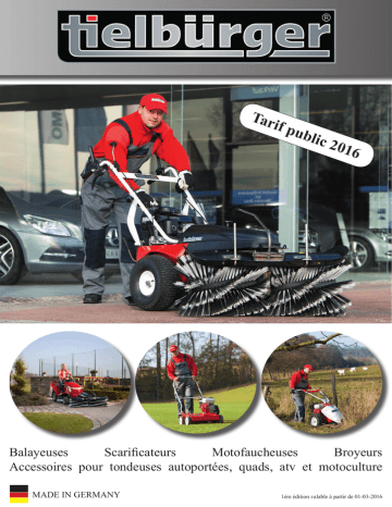 Tar if pub lic 2 016 Balayeuses Scarificateurs Motofaucheuses Broyeurs Accessoires pour tondeuses autoportées, quads, atv et motoculture MADE IN GERMANY 1ère édition valable à partir de 01-03-2016 ACCESSOIRES POUR TONDEUSE AUTOPORTÉE Page 23 - 42 BALAYEUSES Page 4 - 22 Accessoires 4-5 Entry Class Balayeuse TK17 6-9 Balayeuse TK18 7-9 Special Class Balayeuse TK20 8-9 Compact Class Balayeuse TK36 10-11 Balayeuse TK38 10-11 Balayeuse TK48 12-13 Balayeuse TK58 12-13 Professional Class Balayeuse TK36 PRO 2 Balayeuse TK38 PRO 14-16 15-16 PROMOTION Balayeuse TK48 PRO 17-19 PROMOTION Balayeuse TK58 PRO 20-21 Hydraulic Class Balayeuse TK48 HYDRO Balayeuse TK58 HYDRO 18-19 Page 43 - 45 Accessoires Accessoires Balayeuse TK520 ACCESSOIRES POUR QUADS ET ATV 24-25 Lame à neige TS125 26 Fraise à neige TS1020 27 Épandeur TM30 28 Épandeur TM320 28 Épandeur TM420 29 Remorque TA250 30 Remorque TA260 30 Ramassage TA720 30 Scarificateur TV920 31 Support de l‘outil TA1020 32 Greenkeeper110 33 Pare-chocs 33 Poids avant 33 Chaîne à neige 33 Polar-Trec roues arrière 33 Lame à neige RS120 42 Débroussailleuse T920 45 Raccordement rapide 23 Levier 23 Adaptations 34-41 Kits de commande 34-41 Balayeuse TK620 43 Lame à neige TS150 44 Débroussailleuse T920 45 Scarificateur TV920 32 Support d’outils ta1020 33 Épandeur TM320 29 Remorque TA250 31 Remorque TA260 31 Raccordement rapide 44 Adaptations 44 BROYEUR Page 46 -47 Broyeur TH80 46-47 20-21 Electric Class Balayeuse TK1100 2 22 ..pour toute la vie SCARIFICATEURS MOTOFAUCHEUSES Page 48 -49 Page 50 - 52 Entry Class Scarificateur TV405 48 Professional Class Scarificateur TV410 48 Scarificateur TV510 49 Scarificateur TV610 49 Scarificateur TV920 32 ACCESSOIRES POUR MOTOCULTURES HONDA Page 53 - 55 Motofaucheuse T40 50 Motofaucheuse T50 50 Motofaucheuse T60 51 Motofaucheuse T70 52 Accessoires Honda F560 / 610 / 660 / F720 / F810 Faucheuses 53 Fraise 53 Balayeuse 54-55 Lame à neige 55 MATÉRIEL DE PRÉSENTATION sur demande Display standard Display deluxe Plateau pour Balayeuses (réglable) 3 3 Réservoir Réservoir avec mécanisme basculante. Commande ergonomique sur le guidon, protection aux poussières et quatre roues pivotantes. Lame à neige Lame à neige pousser et balayer dans une même opération. Coiffe protectrice Cadre et tube d‘acier stable et vernis. Bâche de protection pour gros gravier. Système d‘arrosage Récepteurs pour réduction de la poussière (réservoir d‘eau avec des connexions). Ramasseur Ramasseur de feuilles, de paille, de foin et de fumier. Montage avant des brosses. Lumière Batterie rechargeable inclus. Balayeuses Tielbürger pour toute l‘année 4 Réservoir avec mécanisme basculante Commande ergonomique sur le guidon, protection aux poussières et quatre roues pivotantes 4 ... Made in Germany Brosses speciaux à double range 8 rangée (un range de matériaux souples et de matériaux fermes). Aussi pour gazon artificiel. Brosses à neige 8 rangée Brosses très fermes 12 rangée Brosses très souple 8 rangée Élargissement des brosses Chaîne à neige Roues polar-trec Roues profil agraire 5 5 ENTRY CLASS TK17 Moteur Numéro d‘article HT TTC B&S Ready Start 575EX AD-380-240TS 1.177,50 1.413,00 B&S 675 IS / Démarreur électrique AD-383-240TS 1.343,33 1.612,00 Honda GCV135 AD-381-240TS 1.260,00 1.512,00 Puissance 3,4 kW (4,6 pk) Capacité 2.200 m²/h Vitesse 3,1 km/h Traction 1 vitesse (boite de vitesse au bain d‘huile) Diamètre 30 cm (livraison des brosses inclus) Largeur de travail 70 cm Réglages des brosses Réglages d‘hauteur des brosses en continu 6 Poids 60 kg Roues 4.00-4 des pneus gonflables (all-weather), jantes en acier Guidon Réglage d‘hauteur par 6 positions Direction Balai inclinable par 5 positions de droite et gauche sur le guidon Différentieel Automatique (360°) ENTRY CLASS TK18 Moteur Numéro d‘article HT TTC B&S Ready Start AD-390-040TS 1.428,33 1.714,00 B&S 675 IS / Démarreur électrique AD-393-040TS 1.595,00 1.914,00 Honda GCV135 AD-391-040TS 1.478,33 1.774,00 Puissance 3,4 kW (4,6 pk) Capacité 2.800 m²/h Vitesse 3,5 km/h Traction 1 vitesse, boite de vitesse au bain d‘huile + transmission supplémentaire Diamètre 30 cm (livraison des brosses inclus) Largeur de travail 80 cm Réglages des brosses Réglages d‘hauteur des brosses en continu Poids 65 kg Roues 13.00 x 5-6 des pneus gonflables (all-weather), jantes en acier Guidon Réglage d‘hauteur par 6 positions Direction Balai inclinable par 5 positions de droite et gauche sur le guidon Différentieel Automatique (360°) 7 SPECIAL CLASS TK20 Moteur Numéro d‘article 8 HT TTC B&S Ready Start AD-341-040TS 1.590,83 1.909,00 Honda GCV135 AD-342-040TS 1.624,17 1.949,00 Puissance 3,4 kW (4,6 pk) Capacité 2.200 m²/h Vitesse 2,8 km/h Traction 1 vitesse (boite de vitesse au bain d‘huile) Diamètre 30 cm (des brosses spéciales à double range compris) Largeur de travail 80 cm Réglages d‘hauteur Réglages d‘hauteur des brosses automatique (easy-use-system) Poids 59 kg Roue 3.00-4 all-weather profil Guidon 880 mm - 1030 mm réglable Direction Balai inclinable par 5 positions de droite et gauche sur le guidon Différentieel 360º ACCESSOIRES TK17 & TK18 & TK20 Numéro d‘article HT TTC Réservoir TK17, TK18 et TK20 Commande ergonomique sur le guidon. AD-310-030TS 265,00 318,00 Coiffe protectrice TK17, TK18 et TK20 Bâche de protection pour gros gravier. AY-030-001TS 92,50 111,00 Ramasseur de feuilles TK17 et TK18 Montage avant de brosses. AE-004-035TS 231,67 278,00 TK17 70cm AE-004-030TS 185,00 222,00 TK18 80cm AE-004-031TS 188,33 226,00 TK17 KC-002-009 97,50 117,00 TK18 KC-002-001 111,67 134,00 AD-090-128 107,50 129,00 AD-090-073 AD-090-080 103,33 150,83 124,00 181,00 AD-090-082 150,83 181,00 Brosses à neige 80 cm TK18 et TK20 Par paire. AD-090-081 150,83 181,00 Brosses très fermes 80 cm TK18 et TK20 Par paire. AD-090-087 128,33 154,00 AD-090-089 150,83 181,00 Roues profil agraire TK17 Par paire. AD-380-241TS 145,83 17
