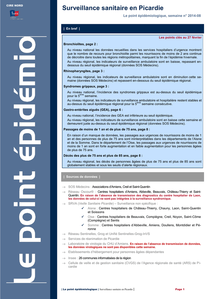 CIRE NORD Surveillance sanitaire en Picardie Le point épidémiologique, semaine n° 2014-08 | En bref | Les points clés au 27 février Bronchiolites, page 2 : Au niveau national les données recueillies dans les services hospitaliers d’urgence montrent que le nombre de recours pour bronchiolite parmi les nourrissons de moins de 2 ans continue de décroitre dans toutes les régions métropolitaines, marquant la fin de l’épidémie hivernale. Au niveau régional, les indicateurs de surveillance ambulatoire sont en baisse, repassant endessous du seuil épidémique régional (données SOS Médecins). Rhinopharyngites, page 3 : Au niveau régional, les indicateurs de surveillance ambulatoire sont en diminution cette semaine (données SOS Médecins) et repassent en-dessous du seuil épidémique régional. Syndromes grippaux, page 3 : Au niveau national, l’incidence des syndromes grippaux est au-dessus du seuil épidémique ème pour la 5 semaine. Au niveau régional, les indicateurs de surveillance ambulatoire et hospitalière restent stables et ème au-dessus du seuil épidémique régional pour la 5 semaine consécutive. Gastro-entérites aiguës (GEA), page 6 : Au niveau national, l’incidence des GEA est inférieure au seuil épidémique. Au niveau régional, les indicateurs de surveillance ambulatoire sont en baisse cette semaine et demeurent juste au-dessus du seuil épidémique régional (données SOS Médecins). Passages de moins de 1 an et de plus de 75 ans, page 8 : En raison d’un manque de données, les passages aux urgences de nourrissons de moins de 1 an et des personnes de plus de 75 ans sont ininterprétables dans les départements de l’Aisne et de la Somme. Dans le département de l’Oise, les passages aux urgences de nourrissons de moins de 1 an sont en forte augmentation et en faible augmentation pour les personnes âgées de plus de 75 ans. Décès des plus de 75 ans et plus de 85 ans, page 8 : Au niveau régional, les décès de personnes âgées de plus de 75 ans et plus de 85 ans sont globalement stables et sous les seuils d’alerte régionaux. | Sources de données | SOS Médecins : Associations d’Amiens, Creil et Saint-Quentin Réseau Oscour® : Centres hospitaliers d’Amiens, Abbeville, Beauvais, Château-Thierry et SaintQuentin. En raison de l’absence de transmission des diagnostics du centre hospitalier de Laon, les données de celui-ci ne sont pas intégrées à la surveillance syndromique. SRVA (Veille Sanitaire Picardie) – Surveillance non spécifique : Aisne : Centres hospitaliers de Château-Thierry, Chauny, Laon, Saint-Quentin et Soissons Oise : Centres hospitaliers de Beauvais, Compiègne, Creil, Noyon, Saint-Côme (Compiègne) et Senlis Somme : Centres hospitaliers d’Abbeville, Amiens, Doullens, Montdidier et Péronne Réseau Sentinelles, Grog et Unifié Sentinelles-Grog-InVS Services de réanimation de Picardie Laboratoire de virologie du CHU d’Amiens. En raison de l’absence de transmission de données, les données virologiques ne sont pas disponibles cette semaine. Etablissements d’hébergement pour personnes âgées dépendantes Insee : 26 communes informatisées de la région Cellule de veille et de gestion sanitaire (CVGS) de l’Agence régionale de santé (ARS) de Picardie | Le point épidémiologique | Surveillance sanitaire en Picardie | Page 1 | Informations | Si vous souhaitez recevoir – ou ne plus recevoir – les publications de la Cire Nord, merci d’envoyer un e-mail à [email protected]. Retour au résumé | Bronchiolites | Surveillance en France métropolitaine Contexte Situation au 25 février 2014 La saison automnale a été marquée par le début de la saison épidémique de bronchiolite chez les nourrissons en France métropolitaine. La surveillance nationale est basée sur les données recueillies dans les services hospitaliers d’urgences participant au réseau Oscour® (Organisation de la surveillance coordonnée des urgences) [1]. Cette surveillance se renforce chaque année avec un nombre plus important d’hôpitaux participants (406 hôpitaux en 2013, soit 67 % de l’ensemble des passages aux urgences en France métropolitaine, contre 375 en 2012 et 281 en 2011). La bronchiolite aigue du nourrisson touche environ un tiers des enfants de moins de 2 ans chaque saison [2]. Comme habituellement, les garçons sont plus souvent touchés que les filles et la bronchiolite est surtout observée parmi les nourrissons de moins de 6 mois [3]. La létalité reste faible et inférieure à 0,1 % [4]. Pour en savoir plus Les données recueillies dans les services hospitaliers d’urgence montrent que le nombre de recours pour bronchiolite parmi les nourrissons de moins de 2 ans continue de décroitre dans toutes les régions métropolitaines, marquant la fin de l’épidémie hivernale. L’épidémie hivernale 2013-2014 a connu une dynamique similaire à celles observées les années précédentes. er Depuis le 1 septembre 2013, parmi les nourrissons ayant eu recours aux services hospitaliers d’urgence pour bronchiolite, 59 % étaient des garçons et 57 % avaient moins de 6 mois, ce qui est habituellement observé. Le pourcentage d’hospitalisation après le recours au service hospitalier d’urgence était plus élevé parmi les nourrissons de moins de 6 mois (environ 50 %) que parmi ceux de 6 mois à 2 ans (environ 30 %). Les caractéristiques des cas sont comparables à celles décrites dans la littérature. http://www.invs.sante.fr/Dossiers-thematiques/Maladies-infectieuses/Infectionsrespiratoires/Bronchiolite/Situation-epidemiologique-de-la-bronchiolite-enFrance-metropolitaine Surveillance en Picardie Surveillance ambulatoire Surveillance virologique | Associations SOS Médecins | En raison de l’absence de transmission de données, les données virologiques ne sont pas disponibles cette semaine. Le nombre de diagnostics de bronchiolites posés par les SOS Médecins d’Amiens et Creil est en baisse ce