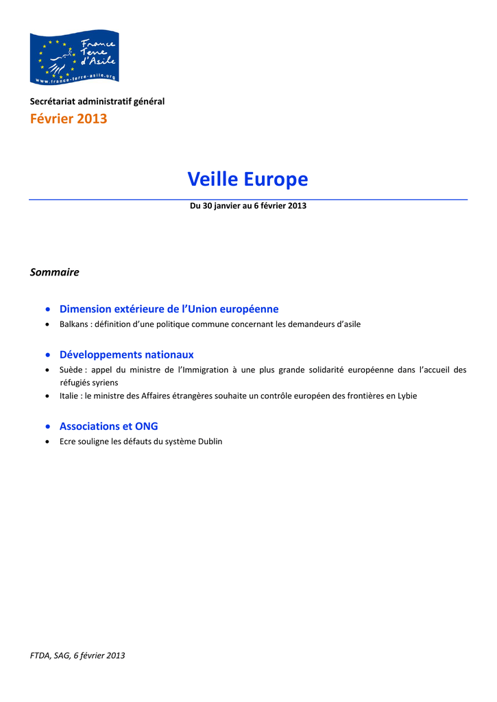 Secrétariat administratif général Février 2013 Veille Europe Du 30 janvier au 6 février 2013 Sommaire Dimension extérieure de l’Union européenne Balkans : définition d’une politique commune concernant les demandeurs d’asile Développements nationaux Suède : appel du ministre de l’Immigration à une plus grande solidarité européenne dans l’accueil des réfugiés syriens Italie : le ministre des Affaires étrangères souhaite un contrôle européen des frontières en Lybie Associations et ONG Ecre souligne les défauts du système Dublin FTDA, SAG, 6 février 2013 Dimension extérieure de l’Union européenne Balkans : définition d’une politique commune concernant les demandeurs d’asile, 31 janvier 2013 La réunion de l’Initiative régionale sur les migrations, l’asile et les réfugiés s’est déroulée à Sarajevo en présence de l’Albanie, de la Bosnie Herzégovine, de la Croatie, de la Macédoine, du Monténégro et de la Serbie afin de définir une politique commune concernant l’asile. Devant l’importance des flux de migrations en provenance de cette région, l’Union européenne a menacé d’y réintroduire des visas. Le premier ministre serbe Ivica Dacic a souligné l’importance d’une réponse régionale à ce problème. Devant l’afflux de demandeurs d’asile transitant par la Serbie pour rejoindre l’Europe, il a aussi insisté sur la nécessité d’une aide européenne afin de déterminer le pays devant traiter ces demandes. Pour plus d’informations, consultez l’article de Balkan Insight (en anglais uniquement) et l’article de B92 (en anglais uniquement). Développements nationaux Suède : appel du ministre de l’Immigration à une plus grande solidarité européenne dans l’accueil des réfugiés syriens, 31 janvier 2013 Depuis le début du conflit en Syrie, la Suède et l’Allemagne ont reçu les deux tiers des demandeurs d’asile en provenance de ce pays. La Suède a ainsi reçu plus de 8 000 demandeurs d’asile syriens au cours de l’année 2012 et en attend plus du double pour l’année à venir. Devant cet afflux, les autorités suédoises délivrent des permis de résidence temporaires et font face à une pénurie de logement pour les arrivants. Le ministre de l’Immigration, repris par de nombreuses associations, a regretté l’absence d’une solidarité européenne autour de cette problématique et a appelé les pays européens à adopter des législations similaires quant à l’accueil de ces réfugiés. Pour plus d’informations, consultez l’article du Washington Post (en anglais uniquement). FTDA, SAG, 6 février 2013 Italie : le ministre des Affaires étrangères souhaite un contrôle européen des frontières en Lybie, 31 janvier 2013 L’Italie, par la voix de son ministre des Affaires étrangères Giulio Terzi, a appelé au déploiement d’une mission européenne de contrôle des frontières en Lybie le plus rapidement possible. Sortant du conseil des Affaires étrangères de l’Union européenne, Giulio Terzi a indiqué avoir appelé au déploiement de cette mission dans le but de lancer une collaboration dans les missions de sécurité et de contrôle des frontières. Les participants à cette réunion ont aussi abordés les crises en Syrie et au Mali. Pour plus d’informations, consultez le site du ministère des Affaires étrangères italien (en anglais uniquement). Associations et ONG Ecre souligne les défauts du système Dublin, 31 janvier 2013 Dans son allocution finale aux participants de la conférence finale du projet « Réseau européen de coopération technique sur l’application du règlement Dublin II », le Secrétaire général du Conseil européen sur les réfugiés et l’exil (Ecre), Michael Drieding, a souligné les défauts de ce système, « un obstacle à la protection efficace des droits de réfugiés aussi bien qu'à leurs perspectives d'intégration à long terme en Europe ». Il a insisté notamment sur l’usage fréquent de la détention afin d’assurer les transferts de demandeurs d’asile entre les pays et sur les longs délais induits par la recherche de l’État membre responsable. Il a également insisté sur les pratiques de certains États se servant du système Dublin afin d’échapper à leurs obligations. Pour plus d’informations, consultez l’allocution sur le site de l’Ecre (en anglais uniquement). FTDA, SAG, 6 février 2013 Secrétariat administratif général Veille Europe Du 6 au 20 février 2013 Sommaire Union européenne Le Comité Meijers adresse ses recommandations au Parlement européen sur la refonte de la directive procédures Les dix ans du règlement Dublin : publication d’une étude comparative sur son application - Conseil de l’Europe Le Comité européen des droits sociaux condamne la France en raison des conditions de vie des Roms Organisation des Nations unies Le Comité des droits de l’enfant s’inquiète du traitement des migrants mineurs à Malte Le HCR publie un rapport sur la protection des femmes réfugiées - Développement nationaux L’Italie met fin au dispositif d’accueil de 18 000 réfugiés originaires d’Afrique du Nord République tchèque : élargissement des droits pour les réfugiés - Associations et ONG Asylum Aid publie trois rapports pour réformer l’aide juridique au Royaume-Uni FTDA, SAG, 6 février 2013 Union européenne Le Comité Meijers adresse ses recommandations au Parlement européen sur la refonte de la directive procédures, 11 février 2013 Dans une lettre adressée le 11 février à la commission LIBE du Parlement européen, le comité Meijers, comité d’experts sur les questions liées aux migrations et à l’asile, a exprimé ses positions sur la refonte de la directive procédures. À cette date, deux articles faisaient toujours l’objet de discussions : l’article 24 relatif aux demandeurs nécessitant des garanties procédurales spéciales et l’article 25 concernant l