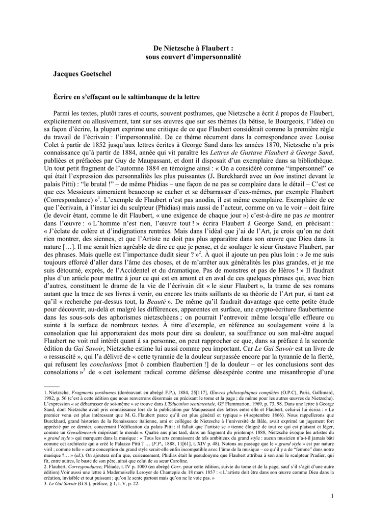 De Nietzsche à Flaubert : sous couvert d’impersonnalité Jacques Goetschel Écrire en s’effaçant ou le saltimbanque de la lettre Parmi les textes, plutôt rares et courts, souvent posthumes, que Nietzsche a écrit à propos de Flaubert, explicitement ou allusivement, tant sur ses œuvres que sur ses thèmes (la bêtise, le Bourgeois, l’Idée) ou sa façon d’écrire, la plupart exprime une critique de ce que Flaubert considérait comme la première règle du travail de l’écrivain : l’impersonnalité. De ce thème récurrent dans la correspondance avec Louise Colet à partir de 1852 jusqu’aux lettres écrites à George Sand dans les années 1870, Nietzsche n’a pris connaissance qu’à partir de 1884, année qui vit paraître les Lettres de Gustave Flaubert à George Sand, publiées et préfacées par Guy de Maupassant, et dont il disposait d’un exemplaire dans sa bibliothèque. Un tout petit fragment de l’automne 1884 en témoigne ainsi : « On a considéré comme “impersonnel” ce qui était l’expression des personnalités les plus puissantes (J. Burckhardt avec un bon instinct devant le palais Pitti) : “le brutal !” – de même Phidias – une façon de ne pas se complaire dans le détail – C’est ce que ces Messieurs aimeraient beaucoup se cacher et se débarrasser d’eux-mêmes, par exemple Flaubert (Correspondance) »1. L’exemple de Flaubert n’est pas anodin, il est même exemplaire. Exemplaire de ce que l’écrivain, à l’instar ici du sculpteur (Phidias) mais aussi de l’acteur, comme on va le voir – doit faire (le devoir étant, comme le dit Flaubert, « une exigence de chaque jour ») c’est-à-dire ne pas se montrer dans l’œuvre : « L’homme n’est rien, l’œuvre tout ! » écrira Flaubert à George Sand, en précisant : « J’éclate de colère et d’indignations rentrées. Mais dans l’idéal que j’ai de l’Art, je crois qu’on ne doit rien montrer, des siennes, et que l’Artiste ne doit pas plus apparaître dans son œuvre que Dieu dans la nature […]. Il me serait bien agréable de dire ce que je pense, et de soulager le sieur Gustave Flaubert, par des phrases. Mais quelle est l’importance dudit sieur ? »2. À quoi il ajoute un peu plus loin : « Je me suis toujours efforcé d’aller dans l’âme des choses, et de m’arrêter aux généralités les plus grandes, et je me suis détourné, exprès, de l’Accidentel et du dramatique. Pas de monstres et pas de Héros ! » Il faudrait plus d’un article pour mettre à jour ce qui est en amont et en aval de ces quelques phrases qui, avec bien d’autres, constituent le drame de la vie de l’écrivain dit « le sieur Flaubert », la trame de ses romans autant que la trace de ses livres à venir, ou encore les traits saillants de sa théorie de l’Art pur, si tant est qu’il « recherche par-dessus tout, la Beauté ». De même qu’il faudrait davantage que cette petite étude pour découvrir, au-delà et malgré les différences, apparentes en surface, une crypto-écriture flaubertienne dans les sous-sols des aphorismes nietzschéens ; on pourrait l’entrevoir même lorsqu’elle effleure ou suinte à la surface de nombreux textes. À titre d’exemple, en référence au soulagement voire à la consolation que lui apporteraient des mots pour dire sa douleur, sa souffrance ou son mal-être auquel Flaubert ne voit nul intérêt quant à sa personne, on peut rapprocher ce que, dans sa préface à la seconde édition du Gai Savoir, Nietzsche estime lui aussi comme peu important. Car Le Gai Savoir est un livre de « ressuscité », qui l’a délivré de « cette tyrannie de la douleur surpassée encore par la tyrannie de la fierté, qui refusent les conclusions [mot ô combien flaubertien !] de la douleur – or les conclusions sont des consolations »3 de « cet isolement radical comme défense désespérée contre une misanthropie d’une ––––– 1. Nietzsche, Fragments posthumes (dorénavant en abrégé F.P.), 1884, 25[117], Œuvres philosophiques complètes (O.P.C), Paris, Gallimard, 1982, p. 56 (c’est à cette édition que nous renverrons désormais en précisant le tome et la page ; de même pour les autres œuvres de Nietzsche). L’expression « se débarrasser de soi-même » se trouve dans L'Education sentimentale, GF Flammarion, 1969, p. 73, 98. Dans une lettre à George Sand, dont Nietzsche avait pris connaissance lors de la publication par Maupassant des lettres entre elle et Flaubert, celui-ci lui écrira : « Le premier venu est plus intéressant que M. G. Flaubert parce qu’il est plus général et typique » (4 septembre 1866). Nous rappellerons que Burckhard, grand historien de la Renaissance italienne, ami et collègue de Nietzsche à l’université de Bâle, avait exprimé un jugement fort apprécié par ce dernier, concernant l’édification du palais Pitti : il fallait que l’artiste se « tienne éloigné de tout ce qui est plaisant et léger, comme un Gewaltmensch méprisant le monde ». Quatre ans plus tard, dans un fragment du printemps 1888, Nietzsche évoque les artistes du « grand style » qui marquent dans la musique : « Tous les arts connaissent de tels ambitieux du grand style : aucun musicien n’a-t-il jamais bâti comme cet architecte qui a créé le Palazzo Pitti ? … (F.P., 1888, 11[61], t. XIV p. 48). Notons au passage que le « grand style » est par nature viril ; comme telle « cette conception du grand style serait-elle enfin incompatible avec l’âme de la musique – ce qu’il y a de “femme” dans notre musique ?… » (id.). On ajoutera enfin que, curieusement, Phidias était le pseudonyme que Flaubert attribua à son ami le sculpteur Pradier, qui fit, entre autres, le buste de son père, ainsi que celui de sa sœur Caroline. 2. Flaubert, Correspondance, Pléiade, t. IV p. 1000 (en abrégé Corr. pour cette édition, suivie du tome et de la page, sauf s’il s’agit d’une autre édition).Vo