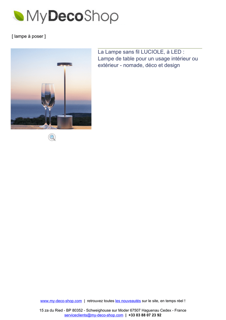 [ lampe à poser ] La Lampe sans fil LUCIOLE, à LED : Lampe de table pour un usage intérieur ou extérieur - nomade, déco et design www.my-deco-shop.com | retrouvez toutes les nouveautés sur le site, en temps réel ! 15 za du Ried - BP 80352 - Schweighouse sur Moder 67507 Haguenau Cedex - France [email protected] | +33 03 88 07 23 92 Utile à l’intérieur ou à l’extérieur, la Luciole est la réponse immédiate à tous vos besoins d’éclairage. Elle trouve sa place en lampe de table, de chevet, de bureau ou d’appoint, sur une terrasse : voici une lampe qui se fait une place discrète et qui devient vite indispensable. La plus puissante des lampes LED sans fil : LEDS 3 X 1,2 W pour une puissance de 45 W : 1 Luciole convient à une table de 6 personnes, sans effet d’éblouissement. Un simple effleurement sur l’interrupteur tactile, pour choisir entre les quatres intensités proposées, selon vos besoins. La conception de la lampe nomade Luciole permet de la laisser branchée en continu sur le secteur : elle sera ainsi toujours chargée, prête à l'usage, au moment voulu. Luciole se recharge complètement en 4 heures (chargeur 12 V fourni) et dispose d'une automonie de 5 à 25 heures selon l’intensité lumineuse choisie (batterie lithuim-Ion sans effet mémoire). Le design épuré de la Luciole a été pensé pour répondre de manière efficace autant qu’esthétique à toutes les contraintes d’éclairement spécifiques. Elle est d'une grande stabilité, prend très peu de place, s'utilise aussi bien à l'extérieur qu'à l'intérieur, et ne craint pas les chocs. Conception et fabrication françaises. Matériau : aluminium. Source lumineuse (fournie) : Leds 3 X 1,2 W (consommation réduite, valeur puissance 45W teinte chaude (2600°K), angle d'éclairement 160°), chargeur 12V livré avec la lampe. Module LED : P3W / I 350 mAh / U 9,6 V Photométrie : 2600°K / CRI 97 / FLUX 215 Lm Energie : batterie lithium-ion sans effet mémoire, 7,4V / 2600 mAh. Durée de vie + de 1000 cycles de charge / remplaçable. Alimentation : chargeur 12V/1A (fourni) - prise EU, UK ou US. Interrupteur tactile, quatre intensités lumineuses sélectionnables. Dimensions : Hauteur : 34 cm ou 26 cm - diamètre du pied : 8 cm NORME CE IP 31 Garantie retour atelier : 3 ans pour la lampe, 1 an pour la batterie Option : chargeur d'alimentation pour recharger 5 lampes en simultané. (sur demande) Désignation Ref Prix HT Prix TTC LUCIOLE, lampe sans fil rechargeable : pour l'intérieur et l'extérieur, chargeur 12V fourni Aluminum naturel, hauteur : 26 cm 375.00 EUR 450.00 EUR LUCIOLE, lampe sans fil rechargeable : pour l'intérieur et l'extérieur, chargeur 12V fourni 375.00 EUR 450.00 EUR www.my-deco-shop.com | retrouvez toutes les nouveautés sur le site, en temps réel ! 15 za du Ried - BP 80352 - Schweighouse sur Moder 67507 Haguenau Cedex - France [email protected] | +33 03 88 07 23 92 Aluminum naturel, hauteur : 34 cm LUCIOLE, lampe sans fil rechargeable : pour l'intérieur et l'extérieur, chargeur 12V fourni Chrome satin, aluminium anodisé, hauteur : 26 cm 400.00 EUR 480.00 EUR LUCIOLE, lampe sans fil rechargeable : pour l'intérieur et l'extérieur, chargeur 12V fourni Chrome satin, aluminium anodisé, hauteur : 34 cm 400.00 EUR 480.00 EUR LUCIOLE, lampe sans fil rechargeable : pour l'intérieur et l'extérieur, chargeur 12V fourni Doré, aluminium anodisé, hauteur : 26 cm 408.33 EUR 490.00 EUR LUCIOLE, lampe sans fil rechargeable : pour l'intérieur et l'extérieur, chargeur 12V fourni Doré, aluminium anodisé, hauteur : 34 cm 408.33 EUR 490.00 EUR LUCIOLE, lampe sans fil rechargeable : pour l'intérieur et l'extérieur, chargeur 12V fourni Noir, aluminium anodisé, hauteur : 26 cm 408.33 EUR 490.00 EUR LUCIOLE, lampe sans fil rechargeable : pour l'intérieur et l'extérieur, chargeur 12V fourni Noir, aluminium anodisé, hauteur : 34 cm 408.33 EUR 490.00 EUR chargeur 12V/1A fourni Prise EU (standard Europe) -NO 375.00 EUR 450.00 EUR chargeur 12V/1A fourni Prise UK (standard Royaume Uni) -NO 377.50 EUR 453.00 EUR chargeur 12V/1A fourni Prise US (standard USA) -NO 375.00 EUR 450.00 EUR www.my-deco-shop.com | retrouvez toutes les nouveautés sur le site, en temps réel ! 15 za du Ried - BP 80352 - Schweighouse sur Moder 67507 Haguenau Cedex - France [email protected] | +33 03 88 07 23 92