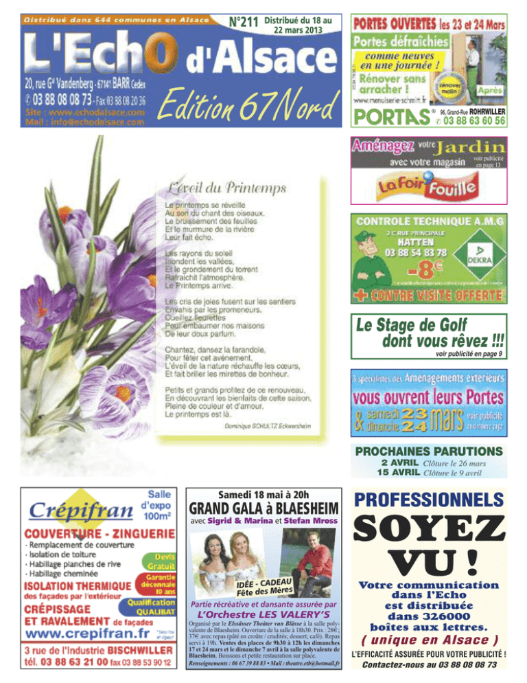 Distribué du 18 au 22 mars 2013 Edition 67Nord 312 084 718 000 21 N°211 96, Grand-Rue ROHRWILLER ✆ 03 88 63 60 56 voir publicité en page 13 Le Stage de Golf dont vous rêvez !!! voir publicité en page 9 PROCHAINES PARUTIONS 2 AVRIL Clôture le 26 mars 15 AVRIL Clôture le 9 avril Samedi 18 mai à 20h GRAND GALA à BLAESHEIM PROFESSIONNELS avec Sigrid & Marina et Stefan Mross U IDÉE - CADEA es èr M Fête des Partie récréative et dansante assurée par L’Orchestre LES VALERY’S Organisé par le Elssässer Theàter vun Blässe à la salle polyvalente de Blaesheim. Ouverture de la salle à 18h30. Prix : 28€; 37€ avec repas (pâté en croûte / crudités; dessert; café). Repas servi à 19h. Ventes des places de 9h30 à 12h les dimanches 17 et 24 mars et le dimanche 7 avril à la salle polyvalente de Blaesheim. Boissons et petite restauration sur place. Renseignements : 06 67 39 88 83 • Mail : [email protected] SOYEZ VU ! Votre communication dans l’Echo est distribuée dans 326000 boîtes aux lettres. ( unique en Alsace ) L’EFFICACITÉ ASSURÉE POUR VOTRE PUBLICITÉ ! Contactez-nous au 03 88 08 08 73 Les meilleurs conseils pour vendre son OR au prix fort A qui vendre son Or en Alsace en parfaite confiance et au meilleur prix? Entre les officines, les acheteurs ambulants, les offres sur internet...il est difficile de faire LE bon choix pour vendre son Or. Les différences dans les montants proposés, sont parfois très importantes pouvant aller du simple au double. Nous avons demandé à Michèle, professionnelle des métaux précieux depuis 27 ans, responsable de ARGOR à Haguenau, de nous donner des conseils. A qui s'adresser pour revendre ses bijoux? Michèle, a fait le choix de la transparence dans son magasin ARGOR de Haguenau en face de la maison de retraite. Les tests et la pesée sont effectués devant les clients. Pour des lots importants ou des successions, nous recevons sur rendez-vous ou pouvons même nous déplacer à domicile. L’envoi à distance de vos bijoux est risqué. Vous n’avez pas de preuve sur la qualité et le poids. Les désillusions sont parfois très importantes et les recours très difficiles voire impossibles. Les ambulants qui achètent dans les hôtels ou tabacs sur un jour viennent “faire des affaires”. Des centaines de clients ont comparé et recommandent ARGOR. S’il est facile de vendre de l’or, qu’il s’agisse de pièces, de lingots, ou de l’or destiné à la fonte, il n’en est pas de même pour vendre des bijoux en état. Adressez-vous à un professionnel qui saura les apprécier! Nous ne sommes pas fondeur, Nous ache- ARGOR tons des bijoux ! Pour les lingots, les pièces et les débris ARGOR calcule le prix de rachat en fonction du cours de l’or en valeur instantanée. Nous n’obligeons pas à vendre après expertise. Comment se passe une expertise? Notre procédure s’adresse aux particuliers ainsi qu’aux professionnels. L’expertise se réalise immédiatement et gratuitement devant le client sur la base de trois critères: le poids, la teneur en or ou en argent, le travail du bijou. La pesée est faite visiblement devant le client. La politique de l’établissement est claire : expertise transparente et prix nets. ARGOR propose les meilleurs prix ! Contrairement à certains “acheteurs d’or”, aucune commission n’est prélevée pour des frais de dossiers ou autres. Les plus d’ARGOR sont la relation-client et la confiance. Le règlement se fait par chèque, un décret du 29 juillet 2011 interdit le paiement en espèces pour les métaux. Quels sont les avantages de s'adresser à ARGOR? Nous exerçons dans un lieu fixe. Contrairement à certains qui se prétendent expert, après une formation de quelques jours, Michèle est une vrai professionnelle qui a travaillé les métaux précieux pendant 27 années. Renseignez-vous sur les compétences et formations de ceux qui s'inventent spécialistes ou professionnels ! Offre ARGOR SPECIAL PAQUES + 5% pour la vente d’or + 20% pour la vente d’argent en plus du montant estimé du lundi au samedi 9h/12h et 13h30/18h30 4, rue du Château 67500 HAGUENAU 03 88 94 35 08 ILL ÉTAIT UNE FOIS… STRASBOURG La journaliste Marie-Christine Périllon publie aux éditions du Signe un livre monumental de 600 pages qui fait date pour le vingt-cinquième anniversaire de l’éditeur et dresse le portrait haut en couleur d’une ville en perpétuel devenir… L’ouvrage s’ouvre sur une citation de Marc Bloch : “L’ignorance du passé ne se borne pas à nuire à la connaissance du présent : elle compromet, dans le présent, l’action même”. Il se déploie comme un triptyque : la première partie, “Ill était une fois”, retrace la naissance et la croissance de la cité puis “les colosses de la Neustadt” font revivre la période impériale allemande et enfin “la ville sans frontières” brasse l’extension de la capitale depuis la seconde moitié du XXe siècle jusqu’aux derniers grands projets qui en font une “ville-pont” accomplissant sa destination européenne… Cinq photographes (Patrick Bogner, Christophe Hamm, Bernard Naegelen, François Nussbaumer et Frantisek Zvardon) éclairent ce parcours dans la mémoire d’une ville remarquablement bien contée, fabuleusement élégante dans ses habits de lumière ou en sa robe couleur de temps - une ville toute affairée à s’offrir un avenir. Marie-Christine Périllon, L’invention perpétuelle de Strasbourg, éditions du Signe, 25X34cm, 600 pages, 69 € SOIRÉE DÎNATOIRE PREUSCHDORF - Grande soirée dînatoire privée avec défilé de mode (vêtements, coiffure, sacs à main, chaussures, lunettes), présentation de décoration de table, ambiance florale et animation musicale. Samedi 6 avril à partir de 19h30 à la salle des fêtes. Au menu (entrée, plat, dessert) : cocktail d'avocat aux écrevisses, Suprême de volaille farcie, Fondue de tomates, Polenta et Caprice exotique. Le prix d’entr