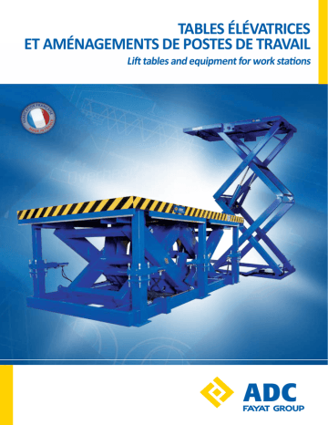 TABLES ÉLÉVATRICES et aménagements de postes de travail Lift tables and equipment for work stations DE L’éTUDE à l’installat Parce que chaque projet est unique, ADC mobilise ses équipes techniques pour vous proposer des solutions de levage sur mesure, à la hauteur de vos ambitions ! ADC studies, develops and provides you with the perfectly adapted lifting solution for your needs. Your project is unique, our teams will assist you in realizing it ! RECHERCHE ET DEVELOPPEMENT Selon votre cahier des charges précis, le bureau d’études d’ADC développe et optimise des solutions spécifiques ou adapte des produits standard à vos besoins pour vous permettre d’atteindre vos ambitions. Dédié à la conception de vos produits de demain, ADC se situe à la pointe de la technologie dans le développement de solutions opérationnelles de levage. 1 FabriCATION Filiale du groupe international FAYAT, ADC met à votre disposition depuis 1919 son expertise dans le domaine de la production de matériel de manutention et de levage. Certifiées ISO 9001, nos équipes (méthodes, achats, assemblage, essais, homologation et bureau d’études) optimisent à chaque phase du process la qualité, le service et la fiabilité du matériel livré. INSTALLATION ET MISE EN SERVICE ADC dispose de spécialistes pour organiser la livraison de votre matériel, l’installation sur votre site, la mise en service et les essais afin de vous garantir une véritable solution clés en main. SERVICE ASSISTANCE MAINTENANCE ADC complète ses prestations de mise en route par un service d’Assistance Maintenance couvrant l’ensemble des matériels de levage (tables, ponts roulants, palans…). 2 3 4 Toutes nos tables élévatrices sont conformes à la directive machine 2006/42/CE et sont basées sur les normes en vigueur, notamment : NF EN 1570 “Prescription de sécurité des tables élévatrices” NF EN 280 “Plateformes élévatrices mobiles de personnel (PEMP)” NF EN 1495 “Plateforme de travail se déplaçant le long de mâts” NF EN 1915 + 12312-8 Matériel au sol pour aéronefs / escabeaux et plateformes de maintenance etc... 2 tallation sur site, un service clés en main ! From R&D to the final installation : a turnkey solution ! R&D The ADC Advanced R&D teams study, develop and optimize standard-range or purposebuilt solutions that will meet your requirements. Entirely dedicated to the development of cutting-edge products of the future, ADC is a major actor in the development field of lifting equipment worldwide. MANUFACTURING Since 1919, ADC has been providing strong expertise in the manufacturing of lifting equipment. As a subsidiary of the worldwide leader Fayat Group, ADC is certified with the ISO 9001 quality standard. Extra-special attention is paid to quality, service and reliability at each step of the process from the engineering, purchasing and assembly phases to the testing and final approval. INSTALLATION & STARTING UP In order to provide you with a 100% Turnkey solution, ADC’s team of experts organizes the delivery, on-site installation, starting up and testing of your equipment for optimum satisfaction. MAINTENANCE Complete service from A to Z ! ADC is at your disposal and provides you with a team specially dedicated to the constant maintenance of your lifting equipment: tables, bridge cranes, hoists, etc. Lifting tables are built in accordance with the safety conditions stipulated in Machinery Directive 2006/42/CE and are based on standards, especially : Le bureau d’études d’ADC est composé de 25 experts spécialisés dans les secteurs de la mécanique, de l’électricité et de la structure métallique. Pour cela ADC déploie ses savoirfaire en utilisant le logiciel de CAO/DAO 3D «Solid Edge» pour le développement, et le logiciel «NX NASTRAN For Windows» et «Solid Edge Simulation» pour les calculs par éléments finis. ADC’s Product Development team includes 25 experts in the fields of Mechanics, Electricity and Metallic stuctures. Development and simulation studies are carried out on the 3D CAD software “Solid Edge”, “NX NASTRAN for Windows” and “Solid edge simulation”. With strong benchmarking expertise and innovation capacity, ADC provides relevant, cutting-edge solutions to meet the demands of a permanently developing market. Veille technologique et innovation permanente vous assurent des solutions toujours plus efficaces. NF EN 1570 safety requirements of lifting tables NF EN 280 Mobile tables NF EN 1495 working platform moving along the masts NF EN 1915+12312-8 ground equipment for aircraft / stepladders and maintenance platform 3 les TABLES élévatrices en 5 points LIFT TABLES IN 5 POINTS Pionnier dans le matériel de levage, ADC vous propose une vaste gamme de tables élévatrices pouvant atteindre des hauteurs de levage de 10 m et des capacités de 80 tonnes. Nos équipes d’experts conçoivent et fabriquent pour vous des solutions de levage adaptées à vos besoins, vos contraintes et vos installations. 1 LA TABLE A CISEAUX SCISSOR TABLE Le plateau De largeur et longueur adaptées, sa construction très robuste lui garantit une grande résistance. Platform Width and length of the platform are adaptable. Built to be sturdy and reliable, the platform offers stability and reliability. 2 Les ciseaux De construction robuste, ils assurent une bonne stabilité latérale. Leur nombre varie en fonction de la hauteur de levage désirée. Scissor arms The scissor arms are built to be strong, reliable and to provide greater lateral stability. Their number can be adapted depending on the desired lifting height. 3 Les vErins Associés à la centrale hydraulique, ils apportent la puissance nécessaire pour soulever les charges les plus lourdes. Cylinders Linked to the hydraulic station, the cylinders provide the necessary strength to lift heavy loads. Le chAssis 4 Fixé au sol, il comporte les butées basses et les béquilles de maintenance, la centrale