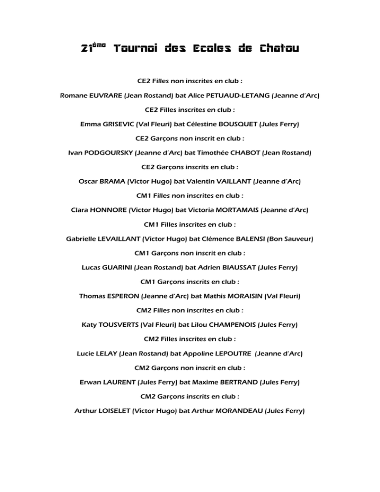 21ème Tournoi des Ecoles de Chatou CE2 Filles non inscrites en club : Romane EUVRARE (Jean Rostand) bat Alice PETUAUD-LETANG (Jeanne d’Arc) CE2 Filles inscrites en club : Emma GRISEVIC (Val Fleuri) bat Célestine BOUSQUET (Jules Ferry) CE2 Garçons non inscrit en club : Ivan PODGOURSKY (Jeanne d’Arc) bat Timothée CHABOT (Jean Rostand) CE2 Garçons inscrits en club : Oscar BRAMA (Victor Hugo) bat Valentin VAILLANT (Jeanne d’Arc) CM1 Filles non inscrites en club : Clara HONNORE (Victor Hugo) bat Victoria MORTAMAIS (Jeanne d’Arc) CM1 Filles inscrites en club : Gabrielle LEVAILLANT (Victor Hugo) bat Clémence BALENSI (Bon Sauveur) CM1 Garçons non inscrit en club : Lucas GUARINI (Jean Rostand) bat Adrien BIAUSSAT (Jules Ferry) CM1 Garçons inscrits en club : Thomas ESPERON (Jeanne d’Arc) bat Mathis MORAISIN (Val Fleuri) CM2 Filles non inscrites en club : Katy TOUSVERTS (Val Fleuri) bat Lilou CHAMPENOIS (Jules Ferry) CM2 Filles inscrites en club : Lucie LELAY (Jean Rostand) bat Appoline LEPOUTRE (Jeanne d’Arc) CM2 Garçons non inscrit en club : Erwan LAURENT (Jules Ferry) bat Maxime BERTRAND (Jules Ferry) CM2 Garçons inscrits en club : Arthur LOISELET (Victor Hugo) bat Arthur MORANDEAU (Jules Ferry)