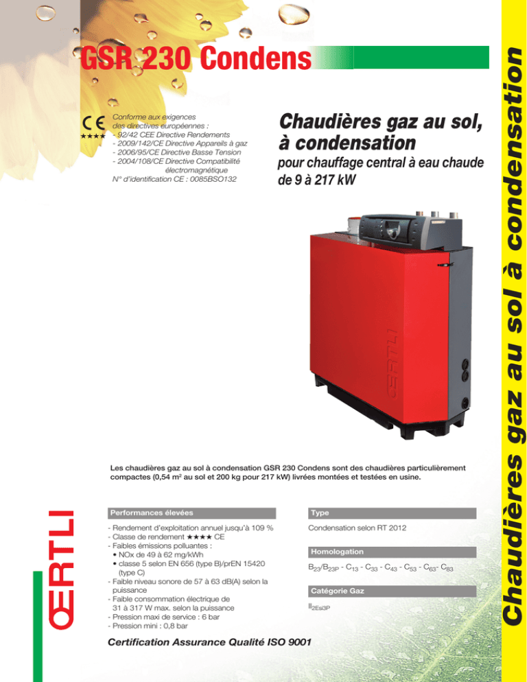 Conforme aux exigences des directives européennes : ++++ - 92/42 CEE Directive Rendements - 2009/142/CE Directive Appareils à gaz - 2006/95/CE Directive Basse Tension - 2004/108/CE Directive Compatibilité électromagnétique N° d’identification CE : 0085BSO132 Chaudières gaz au sol, à condensation pour chauffage central à eau chaude de 9 à 217 kW Les chaudières gaz au sol à condensation GSR 230 Condens sont des chaudières particulièrement compactes (0,54 m2 au sol et 200 kg pour 217 kW) livrées montées et testées en usine. Performances élevées - Rendement d’exploitation annuel jusqu’à 109 % - Classe de rendement ++++ CE - Faibles émissions polluantes : • NOx de 49 à 62 mg/kWh • classe 5 selon EN 656 (type B)/prEN 15420 (type C) - Faible niveau sonore de 57 à 63 dB(A) selon la puissance - Faible consommation électrique de 31 à 317 W max. selon la puissance - Pression maxi de service : 6 bar - Pression mini : 0,8 bar Type Condensation selon RT 2012 Homologation B23/B23P - C13 - C33 - C43 - C53 - C63- C83 Catégorie Gaz II2Esi3P *LY[PÄJH[PVU(ZZ\YHUJL8\HSP[t0:6 Chaudières gaz au sol à condensation GSR 230 Condens Chaudières gaz au sol à condensation PRÉSENTATION DE LA GAMME Leurs points forts - Tableau de commande Œ-tronic 3® dont la régulation électronique est ouverte à tous les cas d’installation, y compris les plus complexes (fonctionnement en cascade possible de 2 jusqu’à 10 chaudières) pour un maximum de confort et une grande simplicité d’utilisation. Il est conçu pour communiquer avec les commandes à distance et avec des systèmes de télégestion compatibles. - Séparation des retours possible en option pour une exploitation maximale de la condensation. - Maintenance facilitée : • corps condenseur autonettoyant, • accès rapide au brûleur grâce au capot avant clipsé, • accès aisé à l’échangeur par la trappe de visite. - Echangeur composé d’éléments en fonte d’aluminium/silicium d’une grande résistance à la corrosion, aux propriétés autonettoyantes et ne nécessitant pas de débit minimum d’irrigation (sauf en cas de fonctionnement > 75 °C). - Brûleur à gaz cylindrique en inox avec revêtement en fibres métalliques tressées, modulant de 18 à 100 %, à pré-mélange total pour : • une parfaite adaptation de la puissance chaudière aux besoins réels de l’installation, • une qualité de combustion optimale sur toute la plage de puissance grâce au SMI (Système de Mélange Intégré) pour un ratio air/gaz constant. - Allumage électronique. - Sonde d’ionisation. Conditions d’utilisation - Temp. maxi. de service : 90 °C - Thermostat de sécurité : 110 °C - Pression maxi. de service : 6 bar - Pression mini. de service : 0,8 bar - Alimentation : 230 V/50 HZ - Indice de protection : IP 21 LES MODÈLES PROPOSÉS OE_C230_Q0001 Chaudière Pour chauffage seul (production eau chaude sanitaire par préparateur indépendant) Modèle Puissance en kW à 50/30 ° C GSR 233 Condens 18 à 93 GSR 234 Condens 24 à 129 GSR 235 Condens 33 à 179 GSR 236 Condens 44 à 217 2 Descriptif Retour chauffage Départ chauffage ® Tableau de bord Œ-tronic 3 Arrivée gaz Évacuation des fumées Pressostat de sécurité des gaz brûlés Sonde de départ chauffage Corps de chauffe en fonte d’aluminium/silicium Tube de mélange air/gaz Ventilateur Électrode d’allumage et sonde d’ionisation Multibloc gaz Venturi GSR230_sans_capot Trappe de visite du corps de chauffe Socle support avec collecteur de condensats Entrée d’air comburant avec silencieux Pressostat de sécurité des gaz brûlés Sonde de départ chauffage Amenée d’air comburant Tube de mélange air/gaz Ventilateur Électrode d’allumage et sonde d’ionisation Brûleur modulant à prémélange total Venturi Sonde chaudière Corps de chauffe en fonte d’aluminium/silicium Multibloc gaz Entrée d’air comburant avec silencieux C230_Q0013 GSR230-condens_coupe 5 C230_Q0010 Conduit d’évacuation des fumées 3 Sonde de retour chauffage Sortie condensats pour raccordement du siphon (livré) Chaudières gaz au sol à condensation CARACTÉRISTIQUES TECHNIQUES DES CHAUDIÈRES Chaudières gaz au sol à condensation CARACTÉRISTIQUES TECHNIQUES DES CHAUDIÈRES Chaudière type Puissance nominale max. à 50/30 °C Rendement en % Pci - 100 % Pn à temp. moy. 70 °C à charge... % Pn - 30 % Pn à temp. retour 30 °C et temp. eau... °C - 100 % Pn à temp. retour 30 °C Débit nominal d’eau à t 20 K Pertes à l’arrêt à t 30 K Puissance électrique auxil. à Pn chaudière Puissance électrique auxil. à P mini chaudière Puissance nominale mini à 50/30 °C Puissance nominale maxi à 80/60 °C Puissance nominale mini à 80/60 °C Pertes de charge côté eau à t 20 K - gaz naturel H Débit gaz - gaz naturel L - propane Débit massique des fumées Température maxi des fumées à 40/30 °C Pression disponible en sortie de chaudière Contenance en eau Débit d’eau minimal nécessaire (1) Surface au sol Poids à vide GSR 233 Condens 93 97,4 107,9 104,3 3,73 230 125 34 18 87 16 165 9,4 11 6,91 149,7 43 130 12 1,12 0,54 115 kW % % % m3/h W W W kW kW kW mbar m3/h m3/h kg/h kg/h °C Pa L m3/h m2 kg GSR 234 Condens 129 97,5 108,1 104,7 5,16 257 193 36 24 120 22 135 13 14,4 9,56 206,9 43 130 16 1,49 0,54 135 GSR 235 Condens 179 97,5 108,3 105,2 7,14 276 206 56 33 166 29 170 18 20,9 13,21 286 43 130 20 2,14 0,54 165 GSR 236 Condens 217 97,6 108,4 105,7 8,17 288 317 59 44 200 39 180 21,7 25,2 15,93 344,9 43 130 24 2,59 0,54 188 (1) à respecter uniquement si la température maximum dépasse 75 °C. Nota : Le Syndicat des industries aérauliques et frigorifiques (UNICLIMA) intègre dans sa base de données centralisée sur le site “www.rt2012-chauffage.org” les caractéristiques RT 2012 des chaudières et préparateurs d’eau chaude sanitaire. Nos données peuvent y être consultées et importées sous forme de fichier Excel. Elles y sont réactualisées 