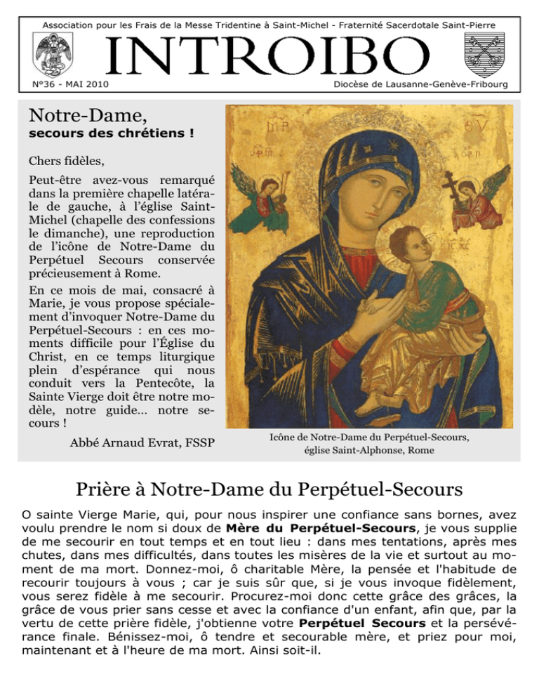 Association pour les Frais de la Messe Tridentine à Saint-Michel - Fraternité Sacerdotale Saint-Pierre N°36 - MAI 2010 Diocèse de Lausanne-Genève-Fribourg Notre-Dame, secours des chrétiens ! Chers fidèles, Peut-être avez-vous remarqué dans la première chapelle latérale de gauche, à l’église SaintMichel (chapelle des confessions le dimanche), une reproduction de l’icône de Notre-Dame du Perpétuel Secours conservée précieusement à Rome. En ce mois de mai, consacré à Marie, je vous propose spécialement d’invoquer Notre-Dame du Perpétuel-Secours : en ces moments difficile pour l’Église du Christ, en ce temps liturgique plein d’espérance qui nous conduit vers la Pentecôte, la Sainte Vierge doit être notre modèle, notre guide… notre secours ! Abbé Arnaud Evrat, FSSP Icône de Notre-Dame du Perpétuel-Secours, église Saint-Alphonse, Rome Prière à Notre-Dame du Perpétuel-Secours O sainte Vierge Marie, qui, pour nous inspirer une confiance sans bornes, avez voulu prendre le nom si doux de Mère du Perpétuel-Secours, je vous supplie de me secourir en tout temps et en tout lieu : dans mes tentations, après mes chutes, dans mes difficultés, dans toutes les misères de la vie et surtout au moment de ma mort. Donnez-moi, ô charitable Mère, la pensée et l'habitude de recourir toujours à vous ; car je suis sûr que, si je vous invoque fidèlement, vous serez fidèle à me secourir. Procurez-moi donc cette grâce des grâces, la grâce de vous prier sans cesse et avec la confiance d'un enfant, afin que, par la vertu de cette prière fidèle, j'obtienne votre Perpétuel Secours et la persévérance finale. Bénissez-moi, ô tendre et secourable mère, et priez pour moi, maintenant et à l'heure de ma mort. Ainsi soit-il. L’icône de Notre-Dame du Perpétuel-Secours Histoire d’une image miraculeuse Description de l’icône de Jésus regardent au loin comme pour L’icône de Notre-Dame du Perpétuel Sevoir quelque chose qui n’apparaît pas cours fait partie de la famille des icônes dans l’icône, c’est la vision de sa Passion. appelées « conductrices » à cause de la Les instruments de la Passion sont tenus main allongée de Marie qui pointe vers le précieusement par les anges comme des visage de Jésus. trophées, instruL’icône de Notrements de victoire, Saint Bernadette Dame du Perpépar lesquels le saLorsqu'on montra cette image à sainte tuel Secours reprélut a été acquis. Bernadette de Lourdes (qui récusait sente le mystère de un flot d'images) elle y reconnut la Dame de Massabielle en s'exclamant : la Rédemption et Son histoire : de « il y a quelque chose là ! ». de l’intercession Crète à Rome de Marie. Les anL’icône de Notreges portent les instruments de la Passion. Dame du Perpétuel Secours vient de l’île Marie voit, dans cette révélation, la réalide Crète en Méditerranée où elle aurait sation de la prophétie qu’un jour un glaiété peinte sur bois après l’an 1400. Elle ve de douleur lui transpercera le cœur. aurait été emportée à Rome vers 1490 Cette pensée explique une certaine trispar un marchand qui voulait la protéger tesse dans le regard de Marie. C’est une des Turcs qui menaçaient l’île de Crète. Vierge de la Passion qui connaît la soufSur son lit de mort, le marchand confia france et peut compatir à la nôtre. l’icône à un ami en lui demandant de faiCette icône est l’image du Christ rédempre placer l’image dans une église. L’épouteur dans les bras de sa Mère. Les yeux se de cet ami trouva l’image si belle qu’el- 2 le voulut la garder chez elle. L’ami mouEn 1863, un père jésuite qui prêche une rut lui aussi avant d’avoir accompli sa retraite à Rome demande où est passée promesse. l’image miraculeuse qui était dans l’anSa fille de six ans eut une apparition de la cienne église Saint-Mathieu. Des recherSainte Vierge qui demandait que l’image ches sont entreprises. Le jeune Marchi, soit déposée à l’église Saint-Mathieu à devenu rédemptoriste, rappelle qu’il a vu Rome, dirigée par les moines augustins. cette image au moment où il était jeune Ce fut fait le 27 mars 1499. Des moines servant de messe chez les Augustins et augustins irlandais, chassés d’Irlande par qu’il savait où elle se trouvait. des persécutions, prirent la direction de En décembre 1865, le supérieur général l’église Saint-Mathieu en 1739 et héritèdes Rédemptoristes fait une demande au rent de l’icône. pape Pie IX pour que cette image revienL’église Saint-Mathieu fut détruite au ne chez eux près du lieu où elle avait été cours de l’invasion déposée à l’origine. de Rome par NaLe pape accepte. Saint Alphonse de Liguori poléon en 1798, L’icône de NotreCette image était très vénérée par Saint Alphonse de Liguori (fondateur mais, heureuseDame du Perpétuel des Rédemptoristes) car la sandale de ment, l’icône fut Secours est donc l'Enfant Jésus qui se détache signifiait sauvée. concédée aux Répour lui le « rachat », (selon la coutume Ce qui restait de la demptoristes en Israélite de donner sa sandale pour communauté des 1866 avec la misconclure un marché) et donc la RédempAugustins irlantion (du latin redimere, racheter). sion de « la faire dais s’installa en connaître dans le 1819 à l’église Sainte-Marie in Posterula monde entier ». Après des travaux de près du Tibre, à Rome. Comme on y vénettoyage, l’icône est installée solennellenérait déjà Notre-Dame de Grâce, l’image ment dans la chapelle le 26 avril 1866 et de Notre-Dame du Perpétuel Secours fut les Rédemptoristes en sont devenus les placée dans un oratoire secondaire où grands propagandistes dans tout l’unielle tomba dans l’oubli, sauf pour un vers. Elle se trouve donc désormais dans vieux frère augustin qui l’avait souvent l’église consacrée à Saint-Alphonse de vue à l’église Saint-Mathieu. Il l’a monLiguori,