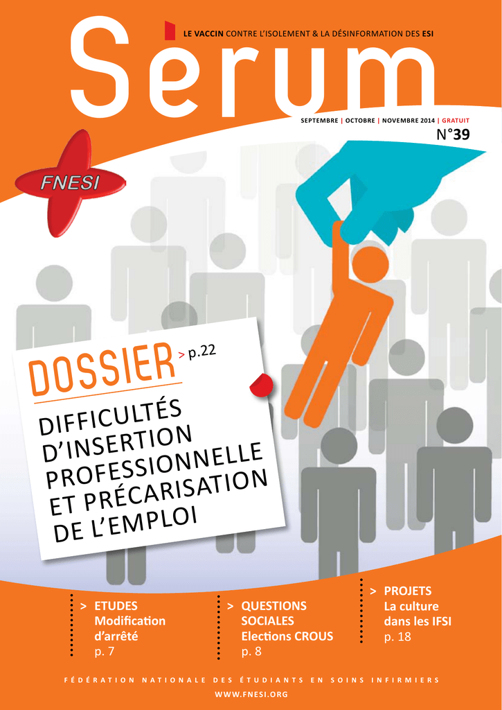 Serum le vaccin contre l’isolement & la désinformation des esi SEPTEMBRE | OCTOBRE | NOVEMBRE 2014 | gratuit n°39 R E I S S DO > p.22 s é t l u c Diffi n o i t r e e l d’i n s l e n n o i s s e f o n pr o i t a s i r a c é r p et i o l p m e ’ de l > ETUDES Modification d’arrêté p. 7 F é d é r at i o n n at i o n a l e >QUESTIONS SOCIALES Elections CROUS p. 8 d e s é t u d i a n t s w w w.f n e s i.o r g e n s o i n s > PROJETS La culture dans les IFSI p. 18 i n f i r m i e r s som mai re > 2 Actualités Retour sur... > 4 Les Universités d’été et l’élection du nouveau bureau Études > 6 Loi Santé > 7 Modification de l’arrêté et évolution des stages QUESTIONS SOCIALES > 8 Elections CROUS ÉVENEMENT > 10 Congrès 2014 > 12 En direct d’Infirmiers.com > 14 > 16 INTERNATIONAL Les tuteurs de stage en Suisse Les aventures d’une infirmière française aux USA (Partie 2) > 18 PCS La culture dans les IFSI > 20 TOP/FLOP - VDM > 22 DOSSIER Difficultés d’insertion professionnelle et précarisation de l’emploi > 26 LA BOITE À OUTILS Valoriser son projet > 27 ADHÉRER À LA FNESI > 28 ANNONCES > 30 DANS VOTRE ASSO > 32 DIVERTISSEMENTS Fédération nationale des étudiants en soins infirmiers Présente pour l’ensemble des étudiants infirmiers de France, la FNESI, association loi 1901, est l’unique structure reconnue représentative de notre filière. La FNESI fonde son engagement autour de la défense des intérêts matériels et moraux des étudiants infirmiers. Pour davantage d’informations venez visiter notre site internet : fnesi.org Revue éditée par la FNESI association loi 1901 Directeur de publication Loïc MASSARDIER Rédactrices en chef Camille WARGNIER, Charlène REYNE Ont participé à ce numéro : Loïc MASSARDIER, Camille WARGNIER, Charlène REYNE, Anaïs GILLOT, Irving MONTORIER, Merlin DESCOURS, Gaëtan BEGOUT, Delphine THEZE, Doriane COUDURIER, Anthony CONTARDO, Lisa CANN Editeur Délégué IZEOS Collaboration éditoriale Bernadette Fabregas, rédactrice en chef Infirmiers.com Régie publicitaire Infirmiers.com, 5 avenue de Verdun, Le Panoramique 94200 Ivry-sur-seine, www.infirmiers.com Contact FNESI 5 rue Frédérick Lemaitre 75020 PARIS [email protected] 06 58 56 99 71 www.fnesi.org Conception graphique Christine GARNIER. Toute reproduction, même partielle, est soumise à l’autorisation de l’éditeur et de la régie publicitaire. Les annonceurs sont seuls responsables du contenu de leur annonce. Serum septembre|octobre|novembre 2014| N°39 édito ce à la tenue blanche ! Finie la tenue estivale, pla de les routes de nos IFSI et Nous voilà de retour sur tions à vous qui cita féli , ord d’ab t Tou nos stages… ces ntrée ! Bienvenue dans avez réussi le concours d’e . études passionnantes la lez votre blouse pour Mais alors que vous enfi à t nen pei , eux és, ux diplôm première fois, les nouvea t « vendu » rtan pou it ava s nou On i. trouver un emplo is tectrice du chômage… ma cette formation comme pro les chiffres sont là. rir la pour vous de (re)découv Ce Sérum sera l’occasion -t-il en vous era cré re t-êt Peu . tion FNESI, votre Fédéra de ntation, d’engagement, une volonté de représe Les ! us z-vo age eng , cas s ce défense des étudiants… Dan ant mos, des BDE… sont aut élections des élus de pro ent. rem aut des étu vos e d’occasions de vivr mettra également L’engagement nous per nir pour notre ave vel nou un r d’envisage possibilités de es vell nou profession, de poursuivre ses de ité carrières, l’éventual chée pour faire affi é ont vol Une . des étu fessionnelle. avancer notre vision pro et tous ! Bonne rentrée à toutes Merlin Des co urs HM Sud Marseille Etudiant en L1 à l’IFSI APdes affaires sociales rge Vice-président en cha mot du président Bonjour à tout es et à tous ! Le bureau natio na les nouveaux ar l de la FNESI souhaite la bien rivants dans la venue à tous formation en so ins infirmiers ! Le Sérum, seul e infirmiers (ESI) revue rédigée par des étud iants en pour de accompagnera, s étudiants en soins infirmie soins rs, vous tout comme la cette nouvelle FNESI, tout au année 2014 / 20 long de 15. Elle sera, je l’e spère, riche en engagement et site pour tous. en réusLa de vous permett FNESI a toujours eu comme pr re d’être au co eur de votre fo iorité et d’en être le rmation s ac et nous l’avons teurs. Nous devons être ca pables, déjà montré, d’en être le vé moteur ! ritable Je vous laisse pr ofiter de ces pa ges de rentrée permettro qui vous et de continuer nt sans nul doute, de mettre le pied à l’étrier à vous tenir in formés de l’act formation. ualité de votre Bonne lecture et tous mes vo eux de réussit e! Loïc M as sa rd ie r Etu diant en L3 à l’IR FSS de Saint-Eti enne Président de la FNESI >ACTUALITÉS... Salon infirmier 2014 Le rendez-vous à ne pas manquer ! Depuis de nombreuses années, l'équipe du Salon Infirmier a pour ambition d'accompagner les professionnels du soin, et ce tout au long de leur carrière. Toutes les thématiques touchant à notre profession y seront abordées : pédiatrie, psychiatrie, conditions d'exercice, formation... En plus des conférences, vous pourrez participer à des tables rondes, des ateliers, rencontrer des structures institutionnelles et des associations réunies dans un village prévu à cet effet. Les étudiants bientôt diplômés auront l'occasion de visiter les stands de nombreux hôpitaux français et étrangers. > Les 5, 6 et 7 novembre La FNESI vous attend prochains aura lieu La FNESI sera bien évidemment présente. Elle y tiendra son propre stand, lieu d'échanges et de rencontres étudiantes dans un cadre convivial et chaleureux. Elle le Salon Infirmier qui vous proposera également différentes conférences sur les études à l’étranger pour rassemble chaque valoriser son parcours, l'atelier mémoire en fin de licence, l'accès à la formation universitaire 