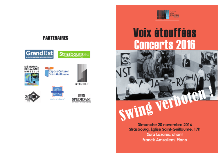 PARTENAIRES Voix étouffées Concerts 2016 i w S r e v g n ! n e t o b Dimanche 20 novembre 2016 Strasbourg, Église Saint-Guillaume, 17h Sara Lazarus, chant Franck Amsallem, Piano Les artistes FRANCK AMSALLEM, pianiste, compositeur et chanteur, a enregistré 8 CD sous son nom, passé vingt ans aux Etats-Unis et accompagné Gerry Mulligan, Charles Lloyd, Joshua Redman, Maria Schneider et Harry Belafonte. Le jazz noir américain (ou yazz comme le prononcent ses détracteurs) arrive dans l’espace germanique avec les troupes alliées au lendemain de la défaite de 1918. L’occupation de la Ruhr et ses tirailleurs sénégalais, l’influence américaine croissante, la présence de jazz-bands dans les clubs allemands dès la fin de la 1ère Guerre mondiale sont comprises par ceux qui ne renoncent pas à l’avènement d’un Reich allemand unifié comme autant d’agressions contre la culture allemande et de symptômes de pourrissement (Pfitzner). Pour les jeunes compositeurs, le jazz représente en revanche une formidable opportunité de renouvellement du langage musical. Il est associé à la plupart des mouvements d’avant-garde de l’époque, tel le Groupe Novembre auquel participent Stefan Wolpe et Erwin Schulhoff, et trouve sa consécration dans l’ouverture de la première classe de jazz au Conservatoire Hoch de Francfort, confiée à Matyas Seiber. Son incarnation en 1926 dans l’opéra d’Ernst Krenek Jony spielt auf suscite des réactions racistes particulièrement violentes de la part des conservateurs et des nationaux-socialistes, qui manifestent contre l’ouvrage à Berlin et à Vienne. En 1930, le jazz est interdit en Thuringe par le ministre nazi de la culture du Land, Wilhelm Frick, et subira le même sort dans l’Allemagne entière à partir de 1933, où les établissements publics devront inscire sur leurs murs la mention « Swing verboten ». Redécouvrons avec l’Ensemble Voix Etouffées la fraicheur apportée par ce nouveau langage dans la musique européenne de l’entre-deux guerres. Amaury du Closel, directeur du Forum Voix étouffées En 1992 il remporte le 2ème prix au Jacksonville Great American Jazz Piano Competition et publie son premier CD, Out a Day, avec Gary Peacock et Bill Stewart. Il s’est depuis produit sous son nom dans les plus grands festivals européens, en Amérique du Sud, Afrique et Asie. Parallèlement, il mène une carriere de compositeur pour big band, notamment avec le WDR, pour orchestre à cordes et orchestre de chambre. En 2002, Franck se réinstalle en France et enregistre Summer Times, puis A week in Paris. Jazzman et Jazz Magazine saluent une nouvelle fois très chaudement ces opus. En parallèle, Franck joue régulièrement et enregistre avec des musiciens aussi prestigieux que Tim Ries, Rick Margitza et Jerry Bergonzi, ainsi que les chanteuses Sara Lazarus, Elisabeth Kontomanou et Melanie Dahan. Ces dernières années, le Pérou, le festival Jazzavienne, des concerts en Israël, Hollande, Lituanie, Algérie et dans toute l’Amérique du Sud étaient au programme. Avec Amsallem Sings, Franck met en valeur ses talents de pianistechanteur sur douze chansons tirées du Great American Songbook. Un 2eme album Franck Amsallem Sings Vol. II, enregistré en trio, est sorti en 2014. Les artistes SARA LAZARUS est native de Wilmington dans le Delaware comme Clifford Brown. Elle étudie dès 8 ans le piano puis le saxophone ténor et joue dans une comédie musicale en tournée européenne jusqu’à Montreux. Elle apprend les standards de jazz et son talent de chanteuse est remarqué par Illinois Jacquet lors de ses études de littérature anglaise à l’université d’Harvard. Elle intègre alors sa formation et le magazine DownBeat lui décerne le prix de meilleure soliste de jazz vocal, niveau universitaire. Diplôme en poche, elle s’installe à Paris et participe aux grands festivals tels Jazz in Marciac, Crest Jazz Vocal ou JVC Paris Festival, et rencontre notamment Manuel Rocheman, Jacky Terrasson ou Riccardo Del Fra. L’obtention du 1er Prix au Concours international Thelonious Monk à Washington en 1994 est l’occasion d’une improvisation avec Herbie Hancock, Ron Carter et d’autres jazzmen. Elle participe à l’enregistrement d’Anything Goes en 2000, projet dirigé par Patrice Caratini autour de Cole Porter. Programme du concert Des shtetls à Broadway Irving Berlin (1888 - 1989) : Let’s Face the Music and Dance Change Partners Blue Skies Cheek to Cheek Jacob Jacobs (1890 - 1977), Sholom Secunda (1894 - 1974) : Bei Mir Bistu Shein Harold Arlen (1905 - 1986) : I’ve Got the World on a String George Gershwin (1898 - 1937) : Porgy And Bess Medley Isn’t it a Pity How Long Has This Been Going On? Nice Work If You Can Get It Someone to Watch Over Me But Not For Me Les compositeurs IRVING BERLIN reçoit ses premiers cours de piano à l’âge de sept ans par Antonin Dvorák. Sur la recommandation de ce dernier, il est accepté au Conservatoire de Prague à l’âg de dix ans. Il continue ses études de piano et de composition à Vienne, Leipzig et Cologne où, en 1913, il reporte le prix Wüllner. Après son service militaire dans l’armée austro-hongroise pendant la Première Guerre mondiale, il vit en Allemagne jusqu’en 1923. Dans ces années, il est fasciné par les courants radicaux de l’avant-garde, du dadaïsme au jazz, mais trouve aussi de l’inspiration dans l’impressionnisme, l’expressionnisme et le néoclassicisme de l’époque. Le compositeur fut un ardent défenseur du système tonal d’Alois Hába et de ses élèves. À cause de ses convictions politiques (membre du parti communiste allemand, il mit en musique le manifeste communiste en 1932), Schulhoff devint une cible des nazis. Après l’interdiction en 1933 de la première à Berlin de son premier opéra Flammen, le compositeur retourne en Tchécoslovaquie où il vit très modestement comme pianiste de jazz. En juin 1941, alors que Schul