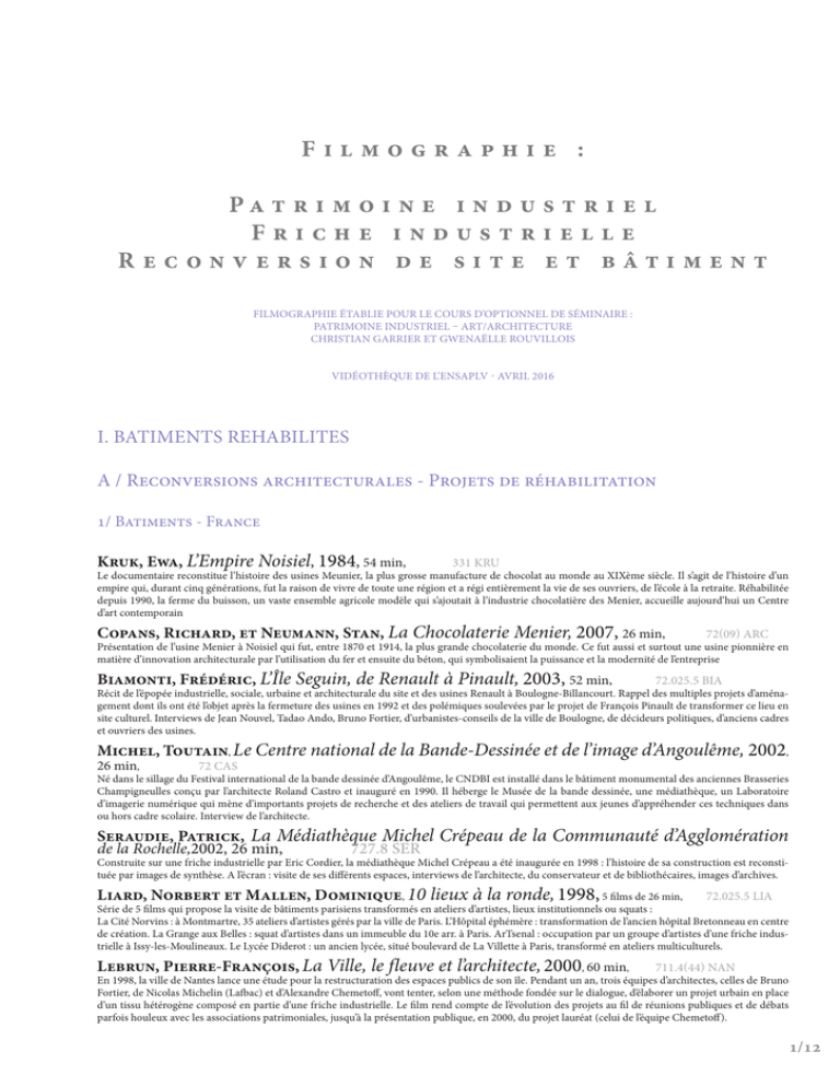 Filmographie : Pat r i m o i n e i n d u s t r i e l Friche industrielle Reconversion de site et bâtiment Filmographie établie pour le cours d’Optionnel de séminaire : Patrimoine industriel – Art/Architecture Christian Garrier et Gwenaëlle Rouvillois Vidéothèque de l’Ensaplv - Avril 2016 I. BATIMENTS REHABILITEs A / Reconversions architecturales - Projets de réhabilitation 1/ Batiments - France Kruk, Ewa, L’Empire Noisiel, 1984, 54 min, 331 KRU Le documentaire reconstitue l’histoire des usines Meunier, la plus grosse manufacture de chocolat au monde au XIXème siècle. Il s’agit de l’histoire d’un empire qui, durant cinq générations, fut la raison de vivre de toute une région et a régi entièrement la vie de ses ouvriers, de l’école à la retraite. Réhabilitée depuis 1990, la ferme du buisson, un vaste ensemble agricole modèle qui s’ajoutait à l’industrie chocolatière des Menier, accueille aujourd’hui un Centre d’art contemporain Copans, Richard, et Neumann, Stan, La Chocolaterie Menier, 2007, 26 min, 72(09) ARC Présentation de l’usine Menier à Noisiel qui fut, entre 1870 et 1914, la plus grande chocolaterie du monde. Ce fut aussi et surtout une usine pionnière en matière d’innovation architecturale par l’utilisation du fer et ensuite du béton, qui symbolisaient la puissance et la modernité de l’entreprise Biamonti, Frédéric, L’Île Seguin, de Renault à Pinault, 2003, 52 min, 72.025.5 BIA Récit de l’épopée industrielle, sociale, urbaine et architecturale du site et des usines Renault à Boulogne-Billancourt. Rappel des multiples projets d’aménagement dont ils ont été l’objet après la fermeture des usines en 1992 et des polémiques soulevées par le projet de François Pinault de transformer ce lieu en site culturel. Interviews de Jean Nouvel, Tadao Ando, Bruno Fortier, d’urbanistes-conseils de la ville de Boulogne, de décideurs politiques, d’anciens cadres et ouvriers des usines. Michel, Toutain, Le Centre national de la Bande-Dessinée et de l’image d’Angoulême, 2002, 26 min, 72 CAS Né dans le sillage du Festival international de la bande dessinée d’Angoulême, le CNDBI est installé dans le bâtiment monumental des anciennes Brasseries Champigneulles conçu par l’architecte Roland Castro et inauguré en 1990. Il héberge le Musée de la bande dessinée, une médiathèque, un Laboratoire d’imagerie numérique qui mène d’importants projets de recherche et des ateliers de travail qui permettent aux jeunes d’appréhender ces techniques dans ou hors cadre scolaire. Interview de l’architecte. Seraudie, Patrick, La Médiathèque Michel Crépeau de la Communauté d’Agglomération de la Rochelle,2002, 26 min, 727.8 SER Construite sur une friche industrielle par Eric Cordier, la médiathèque Michel Crépeau a été inaugurée en 1998 : l’histoire de sa construction est reconstituée par images de synthèse. A l’écran : visite de ses différents espaces, interviews de l’architecte, du conservateur et de bibliothécaires, images d’archives. Liard, Norbert et Mallen, Dominique, 10 lieux à la ronde, 1998, 5 films de 26 min, 72.025.5 LIA Série de 5 films qui propose la visite de bâtiments parisiens transformés en ateliers d’artistes, lieux institutionnels ou squats : La Cité Norvins : à Montmartre, 35 ateliers d’artistes gérés par la ville de Paris. L’Hôpital éphémère : transformation de l’ancien hôpital Bretonneau en centre de création. La Grange aux Belles : squat d’artistes dans un immeuble du 10e arr. à Paris. ArTsenal : occupation par un groupe d’artistes d’une friche industrielle à Issy-les-Moulineaux. Le Lycée Diderot : un ancien lycée, situé boulevard de La Villette à Paris, transformé en ateliers multiculturels. Lebrun, Pierre-François, La Ville, le fleuve et l’architecte, 2000, 60 min, 711.4(44) NAN En 1998, la ville de Nantes lance une étude pour la restructuration des espaces publics de son île. Pendant un an, trois équipes d’architectes, celles de Bruno Fortier, de Nicolas Michelin (Lafbac) et d’Alexandre Chemetoff, vont tenter, selon une méthode fondée sur le dialogue, d’élaborer un projet urbain en place d’un tissu hétérogène composé en partie d’une friche industrielle. Le film rend compte de l’évolution des projets au fil de réunions publiques et de débats parfois houleux avec les associations patrimoniales, jusqu’à la présentation publique, en 2000, du projet lauréat (celui de l’équipe Chemetoff). 1/12 Lebrun, Pierre-François, Entre deux eaux : les métamorphoses d’une île, 2011, 52 min, 711.4(44) NAN Depuis dix ans, Nantes est le théâtre d’une opération urbaine hors du commun. Sur l’île de Nantes, là où se trouvait le cœur industriel et portuaire de la ville, les décideurs ont choisi d’étendre le centre de la métropole. Sur les vestiges architecturaux du passé (port, chantiers navals, usines), ils dessinent des perspectives nouvelles où la culture, les loisirs et le tourisme viennent occuper la place fraichement libérée par les industries. Voyage dans un territoire en plein bouleversement, avec comme guide l’architecte-urbaniste Alexandre Chemetoff, premier maître d’œuvre du projet. A l’écran : déambulations sur l’île (dont une visite de la Galerie des Machines) ; commentaires de A. Chemetoff ; entretiens avec des élus, d’anciens ouvriers, des commerçants, des habitants ; images d’archives. Copier, Myriam, Suivi de chantiers, 2004, 51 min, 72.025.5 COP Dans un faubourg de Grenoble, dans les murs où se fabriquaient les chauffe-eau Pacific, un lieu voué à la danse contemporaine voit le jour en 2004-2005. Le tournage s’étale sur toute la durée des travaux, accompagnant les étapes de la transformation de cette friche industrielle jusqu’à l’inauguration et l’ouverture au public. Le documentaire montre les échanges entre la chorégraphe, Christiane Bl