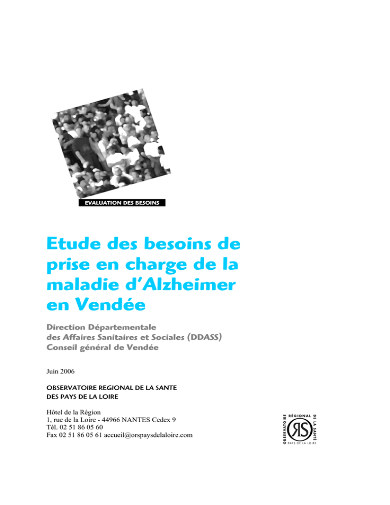 EVALUATION DES BESOINS Etude des besoins de prise en charge de la maladie d’Alzheimer en Vendée Direction Départementale des Affaires Sanitaires et Sociales (DDASS) Conseil général de Vendée Juin 2006 OBSERVATOIRE REGIONAL DE LA SANTE DES PAYS DE LA LOIRE Hôtel de la Région 1, rue de la Loire - 44966 NANTES Cedex 9 Tél. 02 51 86 05 60 Fax 02 51 86 05 61 [email protected] PRISE EN CHARGE DE LA MALADIE D’ALZHEIMER EN VENDEE OBSERVATOIRE RÉGIONAL DE LA SANTE DES PAYS DE LA LOIRE Remerciements Cette étude a été réalisée grâce à la participation de nombreux professionnels : médecins généralistes, gériatres, neurologues, psychiatres, centres médicopsychologiques (CMP) et établissements publics de santé, qui ont accepté de répondre aux différentes enquêtes, et aux membres du Comité de pilotage. Comité de pilotage Madame le Dr Nathalie Aubry Service de gériatrie le Pont Rouge, Centre hospitalier départemental (CHD) Madame le Dr Yvette Bibard Centre hospitalier Georges Mazurelle, La Roche-sur-Yon Monsieur André Bouvet Directeur départemental des affaires sanitaires et sociales (DDASS) Monsieur le Dr Emmanuel Branthomme Conseil de l’ordre des médecins de Vendée Madame le Dr Marie-Christine Butreau Service de gériatrie, Centre hospitalier Côte de Lumière, Les Sables d’Olonne Monsieur le Dr Dominique Delor Médecin-conseil chef de service, Caisse primaire d'assurance maladie (CPAM) Madame le Dr Annick Grolleau Direction de la solidarité et de la famille (DSF), Actions médico-sociales, Conseil général de Vendée Mme Marie-Hélène Gavrel Présidente de l’Association Vendée Alzheimer Monsieur le Dr Thomas Hérault Union régionale des médecins libéraux (URML) des Pays de Loire Monsieur Loïc Le Nevé-Ricordel Union régionale des caisses d'assurance maladie (URCAM) des Pays de Loire Monsieur le Dr Pierre Lermite Service de gériatrie le Pont Rouge, Centre hospitalier départemental (CHD) Madame Viviane Massinon Echelon statistique, Direction régionale des affaires sanitaires et sociales (DRASS) des Pays de Loire Monsieur le Dr Hervé Viarouge Médecin-conseil, Mutualité sociale agricole (MSA) de Vendée Cette étude a également bénéficié du concours : - de l’Union régionale des caisses d’assurance maladie (URCAM) des Pays de la Loire et des caisses d’assurance maladie de Vendée qui ont mis à disposition les données issues de la gestion du risque concernant les patients sous traitement anticholinestérasique, - de la direction régionale du service médical de l’Assurance maladie, - de l’Union régionale des médecins libéraux (URML) - du Conseil de l’Ordre des médecins de Vendée - du service statistique de la DRASS qui a mis à notre disposition une extraction du fichier ADELI des médecins généralistes vendéens en activité. Nous devons également citer le travail du Dr Teddy Bourdet qui a entrepris une enquête en Vendée sur les conduites diagnostiques des médecins généralistes en 2004, dont nous avons utilisé différents résultats [7]. 2 PRISE EN CHARGE DE LA MALADIE D’ALZHEIMER EN VENDEE OBSERVATOIRE RÉGIONAL DE LA SANTE DES PAYS DE LA LOIRE Cette étude a été effectuée par l’Observatoire régional de la santé des Pays de la Loire, à la demande et grâce au financement de la Direction départementale des affaires sanitaires et sociales (DDASS) et du Conseil général de Vendée, de l’Agence régionale de l’hospitalisation (ARH), et de la Direction Régionale des Affaires Sanitaires et Sociales (DRASS). Cette étude a également bénéficié du soutien de la Direction de la Recherche, des Etudes, de l'Evaluation et des Statistiques (DREES), de l’Union régionale des médecins libéraux (URML) et du Conseil de l’Ordre des médecins de Vendée. Sa réalisation a été assurée par le Dr Nicolas Mauduit et François Tuffreau, en collaboration avec Sandrine Blais, Brigitte Klok, Laurence Girard et Christophe Leux. 3 PRISE EN CHARGE DE LA MALADIE D’ALZHEIMER EN VENDEE OBSERVATOIRE RÉGIONAL DE ENQUETES EN MEDECINE GENERALE ET AUPRES DES ETABLISSEMENTS PREMIERE PARTIE 8 CHAPITRE I Enquête en médecine générale 8 11 - Principales caractéristiques de la démographie médicale 8 12 - Présentation générale de l’enquête 9 13 - Caractéristiques des répondants et des non répondants 9 14 - Evaluation du nombre de patients sous traitement anti-Alzheimer 12 15 - Caractéristiques des patients suivis pour la maladie d’Alzheimer 14 16 - Conditions du diagnostic 15 17 - Réponses proposées par le médecin 16 18 - Coordination des soins 17 19 - Besoins prioritaires 18 CHAPITRE II Enquête auprès des médecins spécialistes et des CMP 19 21 - Enquêtes auprès des psychiatres et neurologues 19 22 - Enquête auprès des gériatres et du Centre de consultation mémoire 20 23 - Enquête auprès des Centres médico-psychologiques (CMP) 21 CHAPITRE III 22 Enquête auprès des maisons de retraite hospitalières et USLD publiques DEUXIEME PARTIE EPIDEMIOLOGIE COMPAREE DES DEMENCES 25 CHAPITRE I Epidémiologie des démences 25 11 - Prévalence des démences 25 12 - Incidence des démences 27 CHAPITRE II 28 Epidémiologie de la maladie d’Alzheimer 21 - Prévalence de la maladie d’Alzheimer 28 22 - Incidence de la maladie d’Alzheimer 29 23 - Les patients sous traitement médicamenteux anti-Alzheimer 30 4 LA SANTE DES PAYS DE LA LOIRE 7 Introduction PRISE EN CHARGE DE LA MALADIE D’ALZHEIMER EN VENDEE EVALUATION DES BESOINS AU NIVEAU DES TERRITOIRES 32 CHAPITRE I Une grande disparité des indicateurs sociaux 32 CHAPITRE II 33 Analyse quantitative des besoins QUATRIEME PARTIE SYNTHESE 35 CHAPITRE I Epidémiologie comparée 35 CHAPITRE II 36 Le rôle des médecins généralistes CHAPITRE III 37 La coordination des soins 31 - La coordination institutionnelle 37 32 - La coordination des interventions 37 CHAPITRE IV Les besoins prioritaires 39 BIBLIOGRAPHIE 40 QUESTIONNAIRES D’ENQUETE 45 ANNEXES 5 LA S