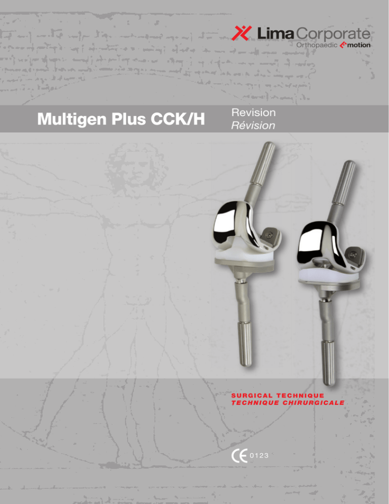 Multigen Plus CCK/H Revision Révision SURGICAL TECHNIQUE TECHNIQUE CHIRURGICALE 0123 Index 2 Index pag.3 PRODUCT CODES RÉFÉRENCES PRODUITS pag.11 PRODUCT COMBINATIONS COMBINAISONS DE PRODUITS pag.12 INSTRUMENT SET BOÎTE D’INSTRUMENTS pag.25 INTRODUCTION INTRODUCTION pag.26 SURGICAL TECHNIQUE TECHNIQUE CHIRURGICALE pag.26 1. Removal of components 1. Retrait des composants pag.26 2. Tibia 2. Tibia pag.35 3. Femur 3. Fémur pag.44 4. Tibial trials with liner 4. Pièces tibiales d’essai avec insert pag.44 5. Articular test 5. Test articulaire pag.45 6. Patellar prosthesis 6. Prothèse patellaire pag.47 7. Definitive implant 7. Implant définitif pag.55 TABLES TABLEAUX Product Codes Références Produits CCK - Cemented Femoral Components CCK - Pièces fémorales cimentées CoCrMo CCK Femoral Components - CEM Pièces fémorales CCK - CIM 6615.09.010 #1 n. 1 6615.09.020 #2 n. 2 6615.09.030 #3 n. 3 6615.09.040 #4 n. 4 6615.09.050 #5 n. 5 H - Cemented Femoral Components H - Pièces fémorales cimentées CoCrMo + CFR Peek H Femoral Components - CEM Pièces fémorales H - CIM 6616.09.010 #1 n. 1 6616.09.020 #2 n. 2 6616.09.030 #3 n. 3 6616.09.040 #4 n. 4 6616.09.050 #5 n. 5 3 PRODUCT CODES RÉFÉRENCES PRODUITS Cemented Fixed Tibial Plates Plateaux tibiaux fixes cimentés Ti6Al4V Cemented Fixed Tibial Plates Plateaux tibiaux fixes cimentés 6624.15.110 #1 n. 1 6624.15.120 #2 n. 2 6624.15.130 #3 n. 3 6624.15.140 #4 n. 4 6624.15.150 #5 n. 5 H - Cemented Tibial Plates H - Plateaux tibiaux cimentés CoCrMo + CFR Peek Cemented H Tibial Plates H Plateaux tibiaux cimentés 4 6620.09.110 #1 n. 1 6620.09.120 #2 n. 2 6620.09.130 #3 n. 3 6620.09.140 #4 n. 4 6620.09.150 #5 n. 5 PRODUCT CODES RÉFÉRENCES PRODUITS CCK - Tibial Liners with Locking Screw CCK - Inserts tibiaux avec vis de blocage UHMWPE + Ti6Al4V CCK Tibial Liners Inserts tibiaux CCK for Tibial Plate # 1 pour pièce fémorale n° 1 6645.50.110 h 10 mm h 10 mm 6645.50.112 h 12 mm h 12 mm 6645.50.114 h 14 mm h 14 mm 6645.50.117 h 17 mm h 17 mm 6645.50.120 h 20 mm h 20 mm for Tibial Plate # 2 pour pièce fémorale n° 2 6645.50.210 h 10 mm h 10 mm 6645.50.212 h 12 mm h 12 mm 6645.50.214 h 14 mm h 14 mm 6645.50.217 h 17 mm h 17 mm 6645.50.220 h 20 mm h 20 mm for Tibial Plate # 3 pour pièce fémorale n° 3 6645.50.310 h 10 mm h 10 mm 6645.50.312 h 12 mm h 12 mm 6645.50.314 h 14 mm h 14 mm 6645.50.317 h 17 mm h 17 mm 6645.50.320 h 20 mm h 20 mm for Tibial Plate # 4 pour pièce fémorale n° 4 6645.50.410 h 10 mm h 10 mm 6645.50.412 h 12 mm h 12 mm 6645.50.414 h 14 mm h 14 mm 6645.50.417 h 17 mm h 17 mm 6645.50.420 h 20 mm h 20 mm for Tibial Plate # 5 pour pièce fémorale n° 5 6645.50.510 h 10 mm h 10 mm 6645.50.512 h 12 mm h 12 mm 6645.50.514 h 14 mm h 14 mm 6645.50.517 h 17 mm h 17 mm 6645.50.520 h 20 mm h 20 mm 5 PRODUCT CODES RÉFÉRENCES PRODUITS H - Tibial Liners with Hinge H - Insert tibiaux articulés UHMWPE + CoCrMo + Ti6Al4V H Tibial Liners H Insert tibiaux 6 for Femoral Component # 1 pour pièce fémorale n° 1 6660.50.110 h 10 mm h 10 mm 6660.50.112 h 12 mm h 12 mm 6660.50.114 h 14 mm h 14 mm 6660.50.117 h 17 mm h 17 mm 6660.50.120 h 20 mm h 20 mm 6660.50.124 h 24 mm h 24 mm for Femoral Component # 2 pour pièce fémorale n° 2 6660.50.210 h 10 mm h 10 mm 6660.50.212 h 12 mm h 12 mm 6660.50.214 h 14 mm h 14 mm 6660.50.217 h 17 mm h 17 mm 6660.50.220 h 20 mm h 20 mm 6660.50.224 h 24 mm h 24 mm for Femoral Component # 3 pour pièce fémorale n° 3 6660.50.310 h 10 mm h 10 mm 6660.50.312 h 12 mm h 12 mm 6660.50.314 h 14 mm h 14 mm 6660.50.317 h 17 mm h 17 mm 6660.50.320 h 20 mm h 20 mm 6660.50.324 h 24 mm h 24 mm for Femoral Component # 4 pour pièce fémorale n° 4 6660.50.410 h 10 mm h 10 mm 6660.50.412 h 12 mm h 12 mm 6660.50.414 h 14 mm h 14 mm 6660.50.417 h 17 mm h 17 mm 6660.50.420 h 20 mm h 20 mm 6660.50.424 h 24 mm h 24 mm for Femoral Component # 5 pour pièce fémorale n° 5 6660.50.510 h 10 mm h 10 mm 6660.50.512 h 12 mm h 12 mm 6660.50.514 h 14 mm h 14 mm 6660.50.517 h 17 mm h 17 mm 6660.50.520 h 20 mm h 20 mm 6660.50.524 h 24 mm h 24 mm PRODUCT CODES RÉFÉRENCES PRODUITS Tibial Augments Hémi-cales tibiales Ti6Al4V Tibial Augments Hémi-cales tibiales for Tibial Plate # 1 pour plateau tibial n° 1 6625.15.010 7 mm 7 mm 6625.15.020 12 mm 12 mm for Tibial Plate # 2 pour plateau tibial n° 2 6626.15.010 7 mm 7 mm 6626.15.020 12 mm 12 mm for Tibial Plate # 3 pour plateau tibial n° 3 6628.15.010 7 mm 7 mm 6628.15.020 12 mm 12 mm for Tibial Plate # 4 pour plateau tibial n° 4 6630.15.010 7 mm 7 mm 6630.15.020 12 mm 12 mm for Tibial Plate # 5 pour plateau tibial n° 5 6632.15.010 7 mm 7 mm 6632.15.020 12 mm 12 mm for Tibial Plate # 1 pour plateau tibial n° 1 H - Tibial Augments H - Hémi-cales tibiales Ti6Al4V H Tibial Augments H Hémi-cales tibiales 6621.15.107 7 mm 7 mm 6621.15.112 12 mm 12 mm for Tibial Plate # 2 pour plateau tibial n° 2 6621.15.207 7 mm 7 mm 6621.15.212 12 mm 12 mm for Tibial Plate # 3 pour plateau tibial n° 3 6621.15.307 7 mm 7 mm 6621.15.312 12 mm 12 mm for Tibial Plate # 4 pour plateau tibial n° 4 6621.15.407 7 mm 7 mm 6621.15.412 12 mm 12 mm for Tibial Plate # 5 pour plateau tibial n° 5 6621.15.507 7 mm 7 mm 6621.15.512 12 mm 12 mm 7 PRODUCT CODES RÉFÉRENCES PRODUITS Distal Femoral Augments Cales fémorales distales Distal Femoral Augments Cales fémorales distales Ti6Al4V n. 1 - 5 mm 6671.15.105 # 1 - 5 mm 6671.15.205 # 2 - 5 mm n. 2 - 5 mm 6671.15.210 # 2 - 10 mm n. 2 - 10 mm 6671.15.305 # 3 - 5 mm n. 3 - 5 mm 6671.15.310 # 3 - 10 mm n. 3 - 10 mm 6671.15.405 # 4 - 5 mm n. 4 - 5 mm 6671.15.410 # 4 - 10 mm n. 4 - 10 mm 6671.15.505 # 5 - 5 mm n. 5 - 5 mm 6671.15.510 # 5 - 10 mm n. 5 - 10 mm Posterior Femoral Augments Cales fémorales postérieures Ti6Al4V Posterior Femoral Augments Cales fémorales postérieures 8 n. 1 - 5 mm 6672.15.105 # 1 - 5 mm 6672.15.205 # 2 - 5 mm n. 2 - 5 mm 6672.15.210 # 2 - 10 mm n. 2 - 10 mm 6672.15.305 # 3 - 5 mm n. 3 - 5 mm 6672.15.310 # 3 - 10 mm n. 3 - 10 mm 6672.15