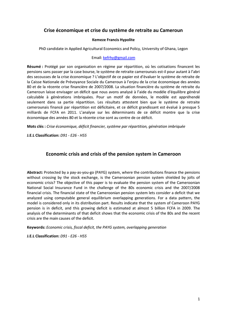 Crise économique et crise du système de retraite au Cameroun Kemeze Francis Hypolite PhD candidate in Applied Agricultural Economics and Policy, University of Ghana, Legon Email: [email protected] Résumé : Protégé par son organisation en régime par répartition, où les cotisations financent les pensions sans passer par la case bourse, le système de retraite camerounais est-il pour autant à l’abri des secousses de la crise économique ? L’objectif de ce papier est d’évaluer le système de retraite de la Caisse Nationale de Prévoyance Sociale du Cameroun à l’enjeu de la crise économique des années 80 et de la récente crise financière de 2007/2008. La situation financière du système de retraite du Cameroun laisse envisager un déficit que nous avons analysé à l’aide du modèle d'équilibre général calculable à générations imbriquées. Pour un motif de données, le modèle est appréhendé seulement dans sa partie répartition. Les résultats attestent bien que le système de retraite camerounais financé par répartition est déficitaire, et ce déficit grandissant est évalué à presque 5 milliards de FCFA en 2011. L’analyse sur les déterminants de ce déficit montre que la crise économique des années 80 et la récente crise sont au centre de ce déficit. Mots clés : Crise économique, déficit financier, système par répartition, génération imbriquée J.E.L Classification: D91 - E26 - H55 Economic crisis and crisis of the pension system in Cameroon Abstract: Protected by a pay-as-you-go (PAYG) system, where the contributions finance the pensions without crossing by the stock exchange, is the Cameroonian pension system shielded by jolts of economic crisis? The objective of this paper is to evaluate the pension system of the Cameroonian National Social Insurance Fund in the challenge of the 80s economic crisis and the 2007/2008 financial crisis. The financial state of the Cameroonian pension system lets consider a deficit that we analyzed using computable general equilibrium overlapping generations. For a data pattern, the model is considered only in its distribution part. Results indicate that the system of Cameroon PAYG pension is in deficit, and this growing deficit is estimated at almost 5 billion FCFA in 2009. The analysis of the determinants of that deficit shows that the economic crisis of the 80s and the recent crisis are the main causes of the deficit. Keywords: Economic crisis, fiscal deficit, the PAYG system, overlapping generation J.E.L Classification: D91 - E26 - H55 1 1. Introduction Protégé par son organisation en régime par répartition, où les cotisations financent les pensions sans passer par la case Bourse, le système de retraite camerounais est-il pour autant à l’abri des secousses de la crise économique ? La dégradation de la situation financière des systèmes de retraite basés sur la répartition1 suscite un large débat afin de consolider, adapter ou modifier leur financement. Certaines études, notamment celles de Legros (1999), Feldestein et Samwick (1997) et Artus (1993) répondent par l’affirmation à la question lien entre crise financière et crise des systèmes de retraite. Ces auteurs ici soulignent qu’en temps de crise, les fonds de réserves des retraites (FRR) baissent et du coup le système se trouve dans l’incapacité d’assurer ses engagements vis-à-vis des assurés. A cet d’effet Le Duigou (2011) souligne que pendant la crise financière de 2008 en France, les FRR ont chuté de 24%. Ainsi, avec ce mode de financement, les individus sont exposés aux risques financiers. Par ailleurs, la crise financière et économique et le vieillissement des populations font que la croissance du pouvoir d’achat des revenus d’activité et celle du nombre des cotisants connaissent un ralentissement sensible à l’équilibre financier des retraites (Cherkaoui, 2009). Au Cameroun la situation est pareille mais elle est plus accentuée par le niveau de vie et la taille des assurés. En fait, le système de retraite au Cameroun est plus sensible à la dimension économique ou socioéconomique qu’à la dimension financière2. La crise financière touche d’abord les variables économiques, et c’est maintenant parce que le secteur économique et le système de retraite sont en étroite relation que le système de retraite à son tour est touché. Depuis l’indépendance; influencé par les puissances coloniales, le Cameroun a souscrit à un système par répartition (Ntsama, 2003). Comme tout système de pension, ce système fait face à deux objectifs principaux : assurer un niveau minimum d’épargne pour qu’au moment de leur retraite les assurés puissent remplacer une partie de leur revenu (fonction d’assurance); et permettre à tous, après un certain âge, de financer un niveau minimum de consommation et d’éviter la pauvreté (fonction d’adéquation)3. Ces objectifs peuvent être atteints grâce à différents systèmes reflétant les conditions locales. Il est donc important de définir des principes généraux qui serviront de cadre d’évaluation du système. Ce cadre s’articule autour des principes suivants : l’adéquation et l’universalité des prestations; la soutenabilité financière; une redistribution progressive et explicite; la prévisibilité et la robustesse; et l’efficacité économique et administrative. Ces principes sont gravement pris en défaut au Cameroun, et, bien que le gouvernement et les organismes de retraite aient conscience qu’il faille prendre des décisions urgentes pour aborder les problèmes, il n’existe pas d’approche intégrée aux différentes options de politique et à la prise en compte de leurs implications tant que ce système n’est pas accompagné d’une croissance économique soutenue. Or depuis l’indépendance, la croissance économique est marquée par sa volatilité et sa décélération continue d’où un processus de 