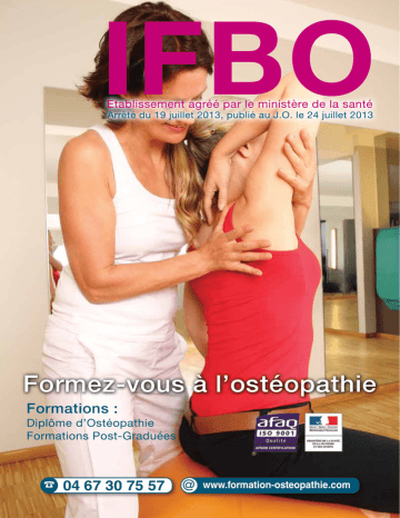 IFBO Etablissement agréé par le ministère de la santé Arrêté du 19 juillet 2013, publié au J.O. le 24 juillet 2013 Formez-vous à l’ostéopathie Formations : Diplôme d’Ostéopathie Formations Post-Graduées ☎ 04 67 30 75 57 @ www.formation-osteopathie.com L’INSTITUT Conçu pour pouvoir enseigner l’ostéopathie dans les meilleures conditions, l’IFBO a construit deux extensions qui l’amènent à 1 200 m2 de surface, ce qui en fait une des plus grandes écoles d’ostéopathie française à ce jour. L’école comprend aujourd’hui 10 salles de cours et de pratique et un a mphithéâtre d’une capacité de 97 étudiants, équipés de moyens p édagogiques efficaces et modernes : • Vidéo projection dans toutes les salles de cours et sur écran géant dans l’amphithéâtre, • Liaison vidéo avec la clinique ostéopathique, • Equipement audio et vidéo dans toute les salles et l’amphithéâtre, • Toutes les salles de pratiques sont entièrement équipées de tables é lectriques spécialement conçues pour l’ostéopathie par Jean-Pierre H ortoland. L’IFBO est la seule école en France, et sans doute en Europe, à mettre ce matériel moderne et performant au service de son enseignement. Un enseignement pratique dans une véritable Clinique Ostéopathique ! 2 La Clinique Ostéopathique est un centre de soins ostéopathiques ouvert au public, où les étudiants de l’IFBO peuvent exercer leur art sur des patients présentant de réels symptômes ; c’est le complément indispensable à une formation de haut niveau car, suivis, conseillés et corrigés si nécessaire, les étudiants mettent en pratique sur des cas concrets toute la théorie qu’ils auront vu en formation, au cours de leur cursus. La clinique est un véritable cabinet où chaque patient est pris en charge par La Clinique est ouverte du lundi au vendredi un étudiant qui va : de 9 h à 13 h • pratiquer un bilan ostéopathique personnalisé et de 14 h à 18 h • proposer et mettre en pratique un traitement ostéopathique adapté Certains samedis • assurer une approche préventive pour potentialiser le capital santé de sont également ouverts chaque patient (se renseigner Pendant chaque phase, chaque étudiant est suivi par les professeurs / auprès du secrétariat) praticiens de la clinique, professionnels pratiquants reconnus depuis de nombreuses années, garants d´une ostéopathie authentique et moderne d’une haute qualité car constamment à la pointe des standards Européens et Internationaux. Ouverte toute l’année, 6 jours sur 7, la clinique accueille des milliers de patients de tous âges, et assure aux étudiants, praticiens en formation qui apprennent leur art sous le strict encadrement pédagogique d’enseignants ostéopathes de très haut niveau, une activité de soins et de recherche performante. Au cours de leur cursus, les étudiants ont ainsi la garantie de pratiquer des actes auprès de patients en situation, et de voir les troubles fonctionnels de leurs patients disparaître grâce aux techniques ostéopathiques qui leur sont enseignées à l’IFBO. L’ENSEIGNEMENT Jean Pierre HORTOLAND, fondateur d’IFBO est ostéopathe et formateur depuis plus de 30 ans. Il prodigue un enseignement m oderne, avec des méthodes d’apprentissage et des pratiques qui ont fait leurs preuves. Il les met à votre disposition dans cette école. L’équipe pédagogique est constituée d’ostéopathes agréés dont 80 % possèdent aussi un master 2 en sciences de l’éducation et formation. Les enseignants sont soudés autour du même principe d’exigence quant à l’enseignement. Nous visons l’excellence pour vous transmettre au mieux notre métier, notre passion : l’ostéopathie L’IFBO est heureux de vous offrir, en sus d’un enseignement de haute qualité qui a fait sa réputation, un cadre de travail de même niveau, particulièrement fonctionnel et agréable, pensé pour vous. L’Institut FrancoBritannique d’Ostéopathie, agréé par le Ministère de la Santé, enseigne l’ostéopathie aux professionnels de la santé : kinésithérapeutes, médecins, infirmiers ou sages femmes. Nous vous proposons une formation complète sur 5 ans, adaptée aux exigences de la pratique de votre activité. Près de chez vous, l’IFBO vous propose des stages de 2 jours, le samedi et le dimanche, à raison d’un week-end par mois. La réussite à l’examen final est validée par un diplôme qui permet d’exercer dès son obtention. Le titre d’Ostéopathe est délivré dès l’enregistrement du diplôme auprès de l’Agence Régionale de la Santé du département de résidence professionnelle. Pour vous accompagner dans votre progression professionnelle, l’IFBO vous propose des formations post graduées réservées aux praticiens détenteurs du titre d’ostéopathe. 3 F O RMA T I O N C O MP L È T E D ’ O S T É O PA T H I E SUR 5 ANNÉES Cette formation se fait par stages de 2 jours, samedi et dimanche pour l’obtention du TITRE D’OSTÉOPATHE 5 BONNES RAISONS DE CHOISIR L’I.F.B.O. • L’IFBO c’est 32 ANS D’EXPÉRIENCE et d’enseignement de l’ostéopathie à travers ses responsables. • L’IFBO c’est une FORMATION EN WEEK-END idéale pour des professionnels. • L’IFBO c’est un ENSEIGNEMENT MODERNE avec le support d’encyclopédies évitant les fastidieuses heures d’écriture. • L’IFBO c’est un TRAVAIL INTENSIF PRATIQUE en binôme sur tables d’ostéopathie électriques. (Béziers) • L’IFBO c’est l’école de la TRANSMISSION du savoir et surtout du SAVOIR-FAIRE OSTÉOPATHIQUE. Conformément à l’article 3 des décrets d’application du 25 mars 2007, cette formation comprend 1225 h d’enseignements théoriques et pratiques de l’ostéopathie comportant trois unités de formation : • Unité A : le concept et les techniques de l’ostéopathie (210 heures) • Unité B : approche palpatoire et gestuelle de l’ostéopathie (31