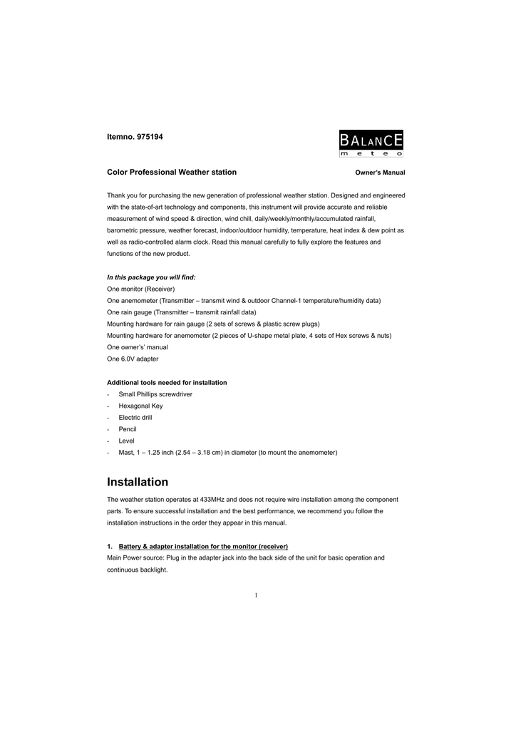 Itemno. 975194 Color Professional Weather station Owner’s Manual Thank you for purchasing the new generation of professional weather station. Designed and engineered with the state-of-art technology and components, this instrument will provide accurate and reliable measurement of wind speed & direction, wind chill, daily/weekly/monthly/accumulated rainfall, barometric pressure, weather forecast, indoor/outdoor humidity, temperature, heat index & dew point as well as radio-controlled alarm clock. Read this manual carefully to fully explore the features and functions of the new product. In this package you will find: One monitor (Receiver) One anemometer (Transmitter – transmit wind & outdoor Channel-1 temperature/humidity data) One rain gauge (Transmitter – transmit rainfall data) Mounting hardware for rain gauge (2 sets of screws & plastic screw plugs) Mounting hardware for anemometer (2 pieces of U-shape metal plate, 4 sets of Hex screws & nuts) One owner’s’ manual One 6.0V adapter Additional tools needed for installation - Small Phillips screwdriver - Hexagonal Key - Electric drill - Pencil - Level - Mast, 1 – 1.25 inch (2.54 – 3.18 cm) in diameter (to mount the anemometer) Installation The weather station operates at 433MHz and does not require wire installation among the component parts. To ensure successful installation and the best performance, we recommend you follow the installation instructions in the order they appear in this manual. 1. Battery & adapter installation for the monitor (receiver) Main Power source: Plug in the adapter jack into the back side of the unit for basic operation and continuous backlight. 1 Backup Power: Open the battery door and insert 3 pieces of AAA batteries according to the polarity indicated, close the battery cover. Sea level pressure setting After battery/adapter installation, the monitor will enter sea level pressure setting mode directly and the pressure reading will flash. Press “▲” or “▼” to set the sea level pressure value. Press “PRESSURE” to confirm the setting and exit. This allows the unit to provide a more accurate weather forecast & pressure reading. You can also set the sea level pressure any time after the installation is completed. For more information, see “WEATHER FORECAST & BAROMETRIC PRESSURE” section. Note: you may obtain the current sea level pressure from the weather web site for your locate area. 2. Selecting a location for the anemometer Select a mounting location for the anemometer that is: - Outdoors, not blocked on top or sides, so wind can freely reach the anemometer - Within 50 meter (164 feet) open area from the monitor. Reduce distance if obstacles is between the anemometer & the monitor The best location for the anemometer is usually mounted on a mast in an open area where wind is not blocked on top or sides, or above roof level on the building where the monitor is located. Testing the effective transmission range Before mounting the anemometer, measure the distance between the monitor & anemometer and be sure it is within the effective transmission range. It is recommended to perform a simple RF transmission test before mounting. 1) Place the monitor in your selected indoor location and install adapter & batteries (see “Battery & adapter installation for the monitor” section above) 2) Place the anemometer horizontally in your selected outdoor location. Loosen the screws on the battery door with a small Phillips screwdriver and open the battery door. Insert 2 pieces of AA batteries according to the polarity indicated. Close the battery door and tighten the screws. 3) Hold “CHANNEL/SEARCH” button on the monitor for 3 seconds and the wind direction, temperature & humidity icons will flash on the display. The monitor is now searching for all remote sensors. 4) If valid wind direction, wind speed and channel-1 temperature/humidity readings are shown on the monitor within 10 minutes, the RF transmission is successful and the anemometer & monitor are within the effective transmission. If above readings are not shown after 10 minutes of searching, the transmission is failed. Shorten the distance between the anemometer & monitor. Reset the anemometer by removing all 2 batteries from the anemometer & wait for 10 seconds before re-installing the batteries again. Repeat step 3 & 4 until the transmission is successful. 5) Remove all batteries from the anemometer before mounting and calibration. NOTE: Whenever the radio-controlled icon is flashing on the display, the weather station is receiving radio-controlled clock signal and the RF reception for remote sensors will stop temporary for around 8 minutes. Wait until this icon stops flashing (or disappear) before searching for the remote sensors. 3. Mounting the anemometer Important: Before mounting, be sure the monitor & anemometer are within the effective transmission range. Note: To mount the anemometer, you need a mast (not supplied) about 1 – 1.25 inches (2.54 – 3.1 cm) in diameter, and the hardware necessary to fasten it to the mounting location. If you previously installed such a mast (for mounting antenna, for example), you can mount the anemometer on that mast. 1. 2. If necessary, mount and ground a mast as directed in the instructions provided by the mast. Place the supplied U-shape metal plates around the mast. Insert 4 pieces of the supplied Hex screws through the holes of the U-shape plates and the holes on the anemometer’s mounting bracket. (The wind vane is above the wind cup and the metal bar of the anemometer is in horizontal level) 3. Tighten the supplied Hex nut onto both ends of each screw 4. Calibrating the anemometer & installing batteries After mounting the anemometer, follow these steps to calibrate the wind direction so that the anemometer properly measures the wind direction and transmit to the monitor. Be sure battery has 3 been removed from the anemometer before the calibration. Important: The same calibr