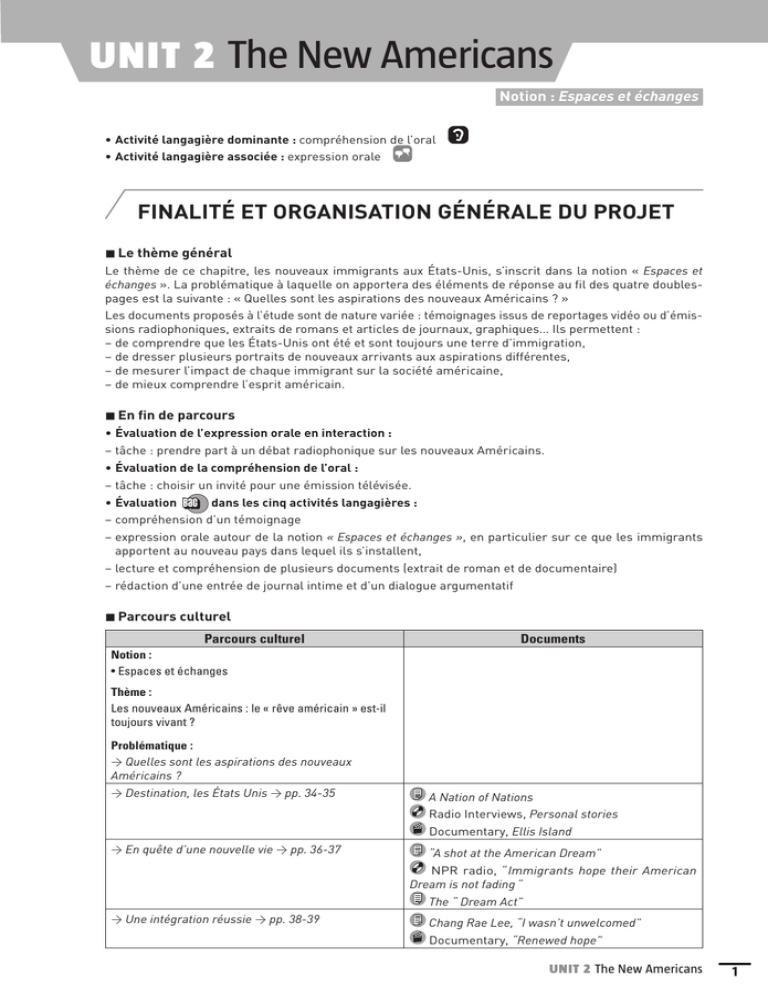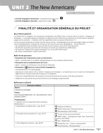 UNIT 2 The New Americans Notion : Espaces et échanges • Activité langagière dominante : compréhension de l’oral • Activité langagière associée : expression orale FINALITÉ ET ORGANISATION GÉNÉRALE DU PROJET Le thème général Le thème de ce chapitre, les nouveaux immigrants aux États-Unis, s’inscrit dans la notion « Espaces et échanges ». La problématique à laquelle on apportera des éléments de réponse au fil des quatre doublespages est la suivante : « Quelles sont les aspirations des nouveaux Américains ? » Les documents proposés à l’étude sont de nature variée : témoignages issus de reportages vidéo ou d’émissions radiophoniques, extraits de romans et articles de journaux, graphiques… Ils permettent : − de comprendre que les États-Unis ont été et sont toujours une terre d’immigration, − de dresser plusieurs portraits de nouveaux arrivants aux aspirations différentes, − de mesurer l’impact de chaque immigrant sur la société américaine, − de mieux comprendre l’esprit américain. En fin de parcours • Évaluation de l’expression orale en interaction : − tâche : prendre part à un débat radiophonique sur les nouveaux Américains. • Évaluation de la compréhension de l’oral : − tâche : choisir un invité pour une émission télévisée. • Évaluation dans les cinq activités langagières : − compréhension d’un témoignage − expression orale autour de la notion « Espaces et échanges », en particulier sur ce que les immigrants apportent au nouveau pays dans lequel ils s’installent, − lecture et compréhension de plusieurs documents (extrait de roman et de documentaire) − rédaction d’une entrée de journal intime et d’un dialogue argumentatif Parcours culturel Parcours culturel Documents Notion : • Espaces et échanges Thème : Les nouveaux Américains : le « rêve américain » est-il toujours vivant ? Problématique : → Quelles sont les aspirations des nouveaux Américains ? → Destination, les États Unis → pp. 34-35 A Nation of Nations Radio Interviews, Personal stories Documentary, Ellis Island → En quête d’une nouvelle vie → pp. 36-37 “A shot at the American Dream” NPR radio, “Immigrants hope their American Dream is not fading “ The “ Dream Act” → Une intégration réussie → pp. 38-39 Chang Rae Lee, “I wasn’t unwelcomed” Documentary, “Renewed hope” UNIT 2 The New Americans 1 → Le rêve américain : toujours vivant → pp. 40-41 Fareed Zacharia, “I still believe in the American Dream” Stratégies pp. 44-45 Laundromat becomes an English classroom” Culture file : Immigrant communities → pp. 48-49 Eavan Bolan, The Emigrant Irish Margaret Regan, The Death of Josseline Entraînements et évaluations Activités langagières • Comprendre les points principaux d’une expérience personnelle • Comprendre les points clés dans un reportage télévisé Poser/répondre à des questions sur une expérience personnelle • Comprendre des informations et des opinions dans un article de presse • Comprendre les faits principaux, l’identité des personnages, leurs actes et leurs motivations dans des témoignages personnels et des textes littéraires Tâches d’entraînement Stratégies Évaluations finales Tâche 1 : Comprendre Après quelques Prendre part à un débat un monologue recherches, rédiger une entrée pour un livret de → pp. 44 - 45 radiophonique sur les nouveaux Américains présentation du musée de l’immigration à Ellis Island → p. 35 Tâche 2 : Choisir un invité pour une émission télévisée Faire un bref exposé pour présenter et → p. 46 commenter une photo → p. 37 Rechercher et échanger des informations sur des personnalités américaines d’origine étrangère → p. 39 Entraînement Évaluation Discuter la définition de l’expression « le rêve américain » dans le but Compréhension de rédiger un tweet de l’oral 4 situations d’évaluation → p. 41 → p. 50 → p. 47 Outils de la langue Words • Immigration → p. 35 • Obstacles and Success → p. 35 • Work → p. 36 • Feelings → p. 36 • Integration → p. 39 • Achievements → p. 39 • Can-do spirit → p. 41 • Prosperity / Want → p. 41 • Mots composés → p. 17 Prononciation Grammaire • Rythme et formes faibles à → p. 42 et → p. 17 p → Précis de prononciation 7 p. 219 • Want, would like, expect sb to… p. 18 → p. 43 et → g → Précis grammatical 22 p. 210 • Accentuation des mots composés → p. 42 p → Précis de prononciation 6 p. 219 • When / If... → p. 43 et → p. 18 g → Précis grammatical 20 p. 208 • Terminaisons en -ion → p. 42 p → Précis de prononciation 6 p. 218 Déroulement de la séquence : les supports et les différents parcours possibles L’ensemble du parcours permet aux élèves d’explorer la thématique des « nouveaux Américains » en lien avec la notion « Espaces et échanges » et de s’entraîner à la réalisation des tâches finales dans les deux activités langagières plus spécifiquement visées. Cependant, conscients des contraintes horaires, nous proposons dans le tableau ci-contre un parcours d’une durée maximale de 8 séances, évaluation comprise, qui tout en permettant une exploration partielle mais substantielle de la thématique, les préparera également à la tâche finale prévue pour l’activité dominante en compréhension de l’oral. 2 Sont indiqués dans le tableau ci-dessous : • en grisé, les supports et activités incontournables nécessaires à la réalisation de la tâche finale dans l’activité langagière dominante du chapitre : Guest selection for a talk show. • ce picto signale les documents que les élèves pourront étudier à la maison, en autonomie, avant la mise en commun en classe. • en blanc , les autres supports et activités proposés que le professeur pourra choisir d’étudier en fonction de sa classe et du tem